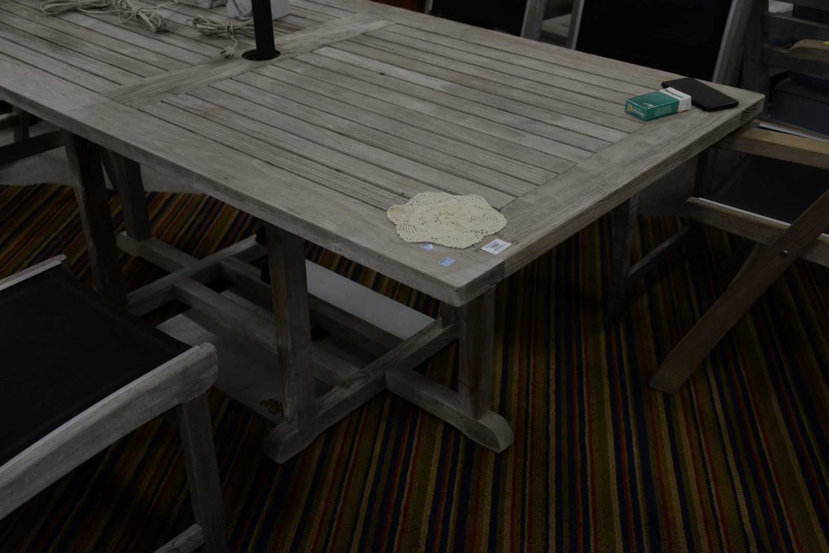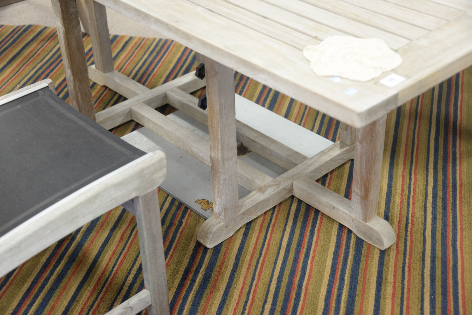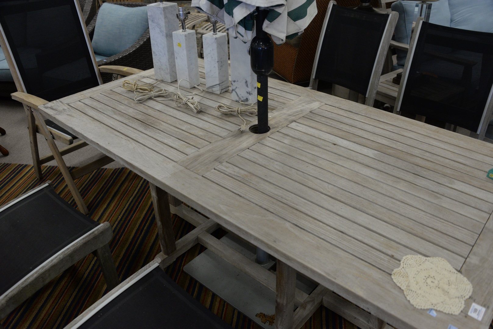 Teak Outdoor Dining Table, height 27 1/2 inches, top 35 1/2″ x 71″.