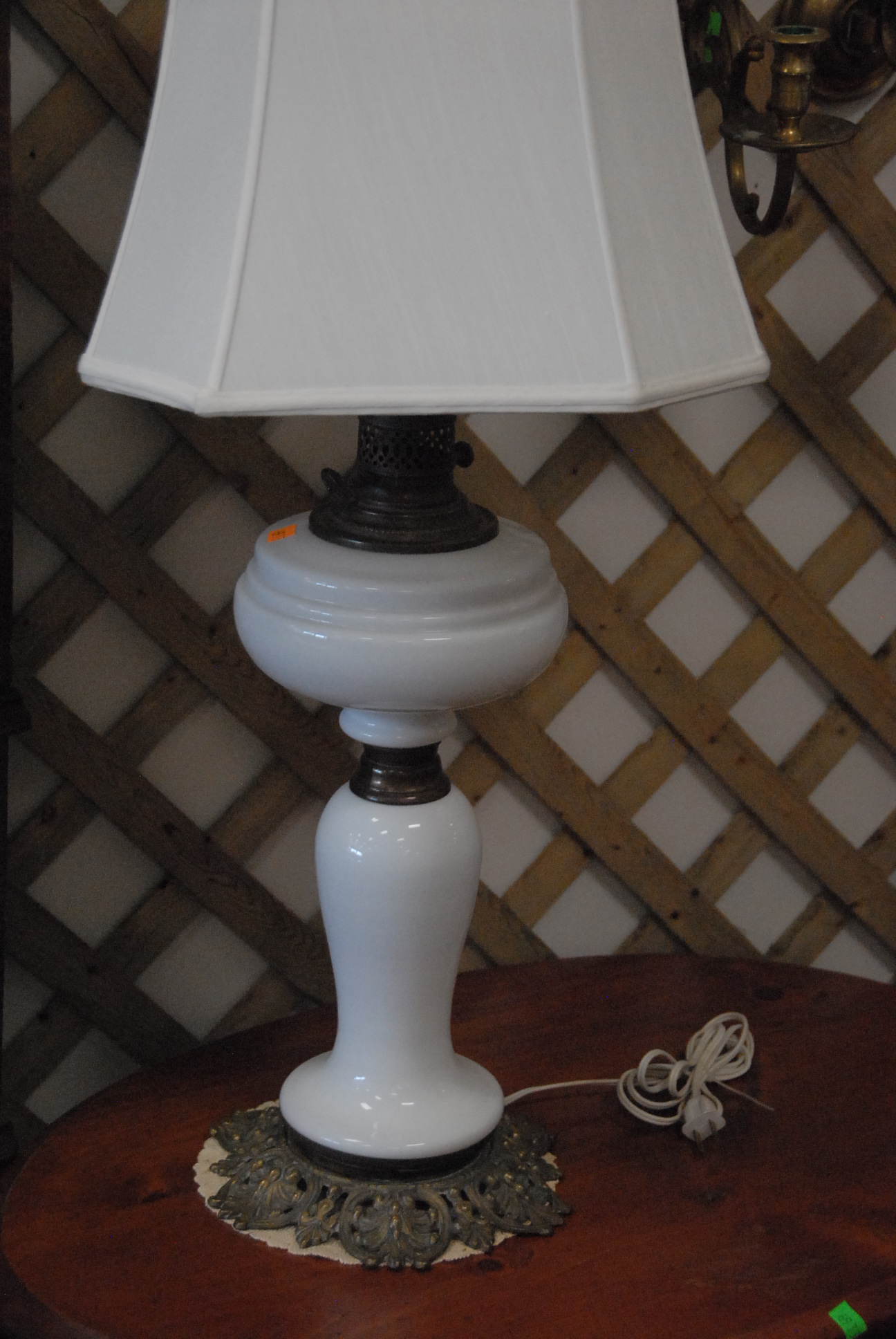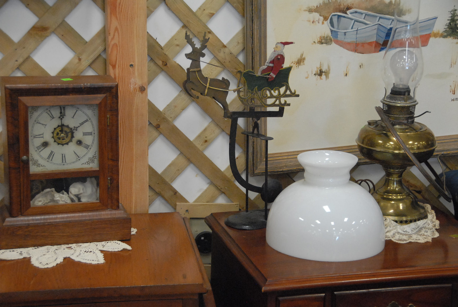 Lot 169: Ten piece lot to include pair of brass oil lamps electrified, cottage mantle clock, Santa Clause tilting toy, three electrified milk…