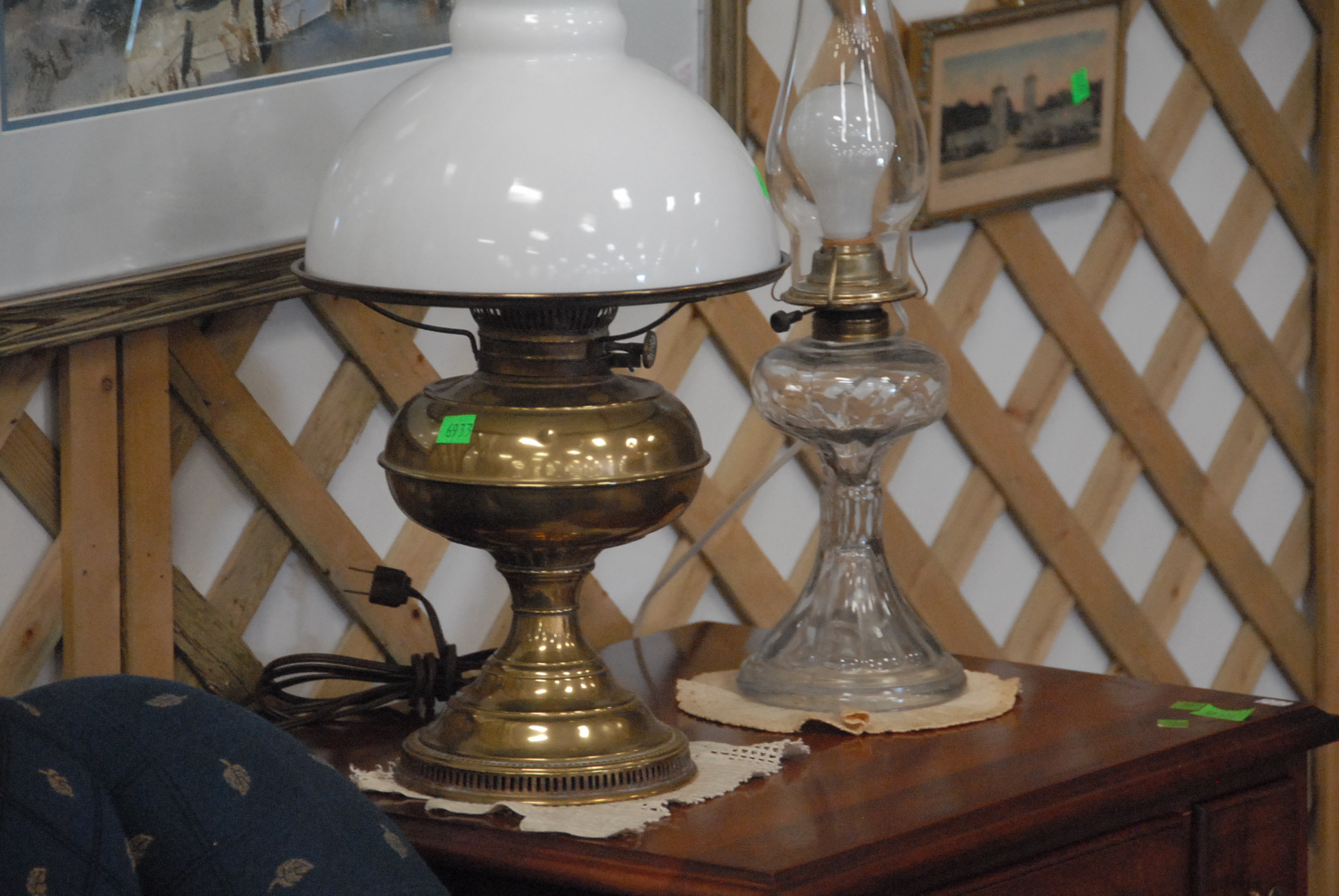 Ten piece lot to include pair of brass oil lamps electrified, cottage mantle clock, Santa Clause tilting toy, three electrified milk glass oil lamps, and two glass lamps.