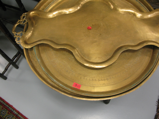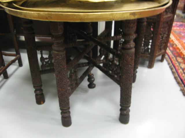 Three brass trays on teak stand along with a carved teak stand from the estate of Broadway actress Leta Gold