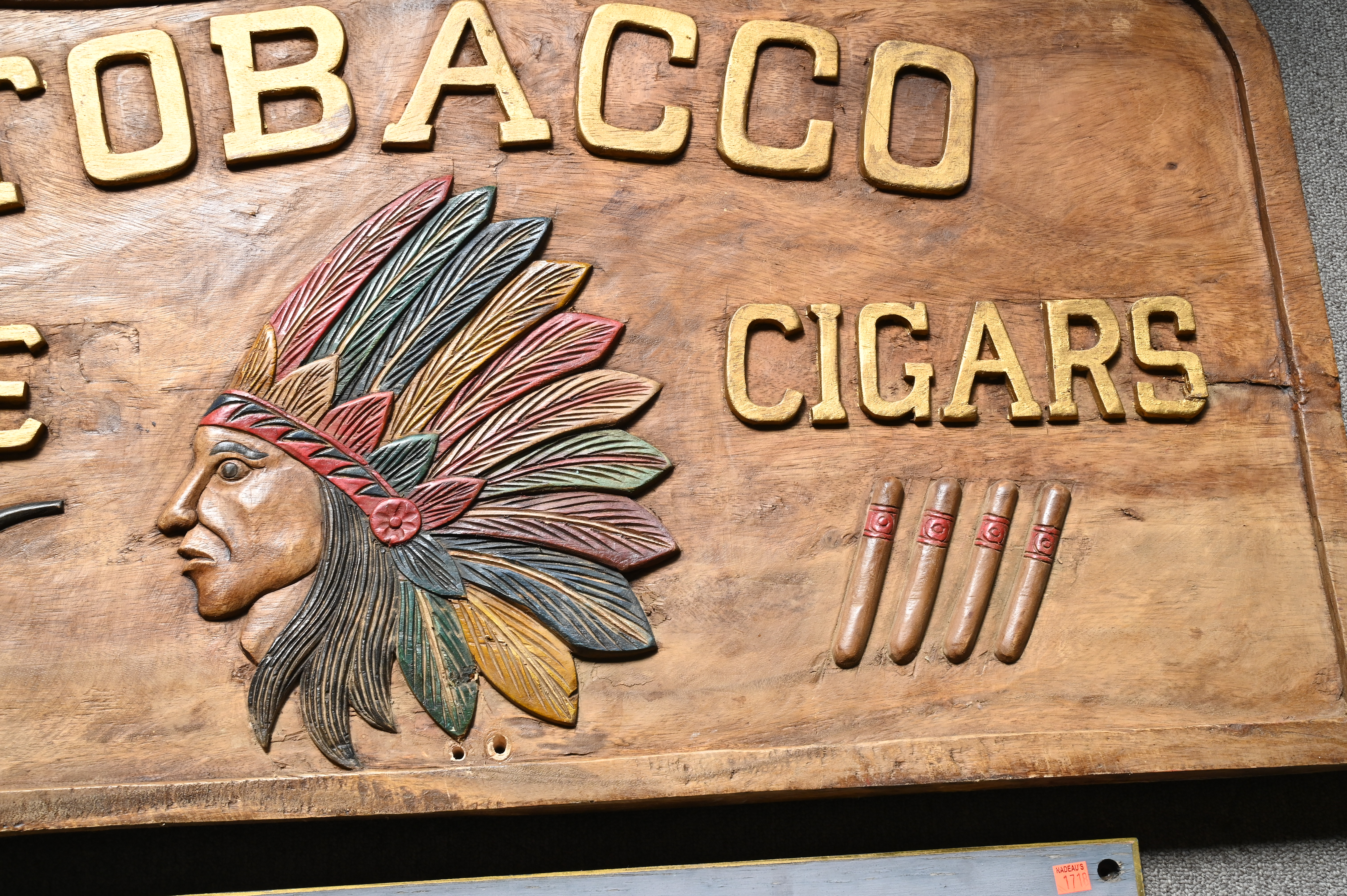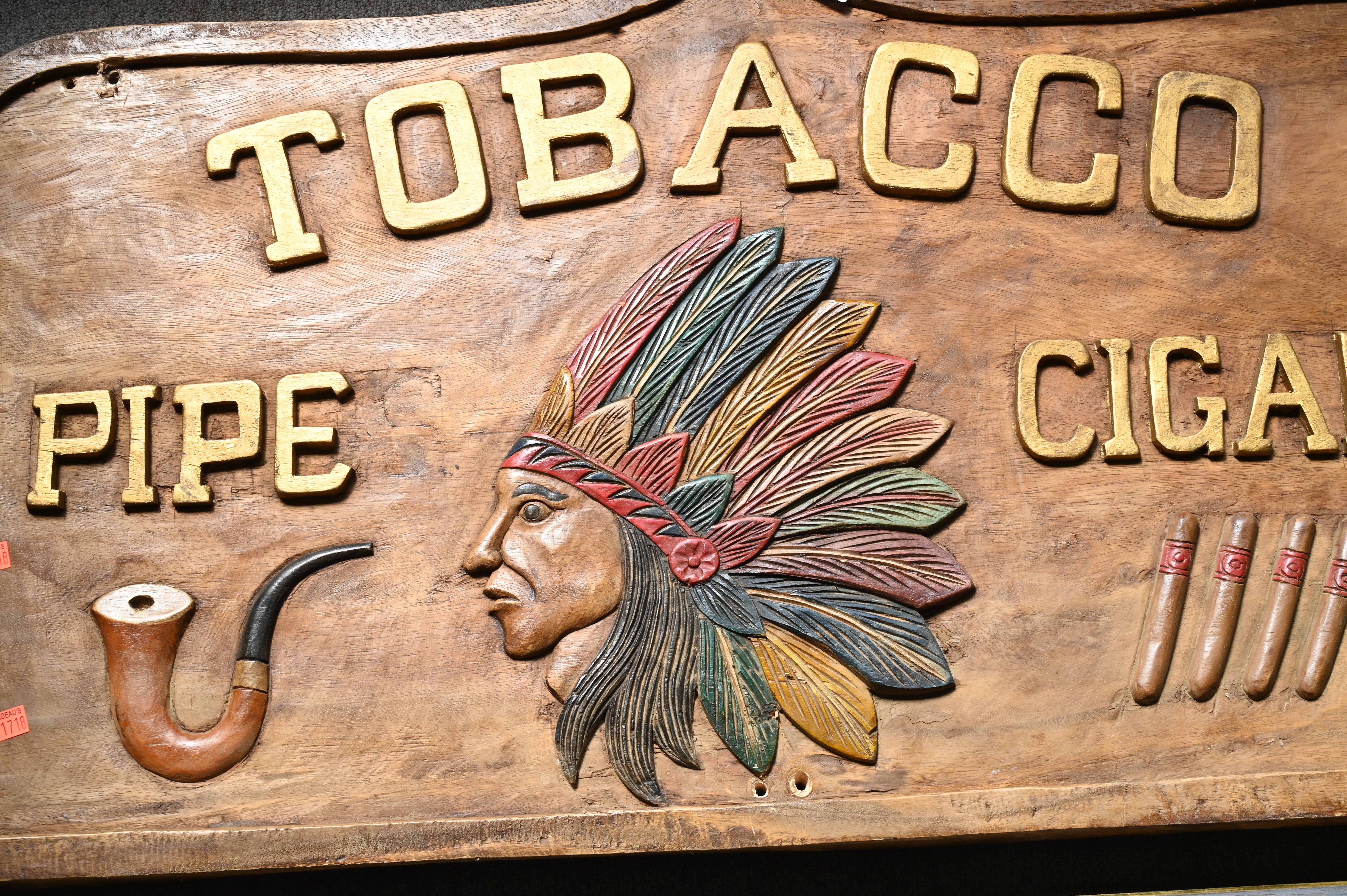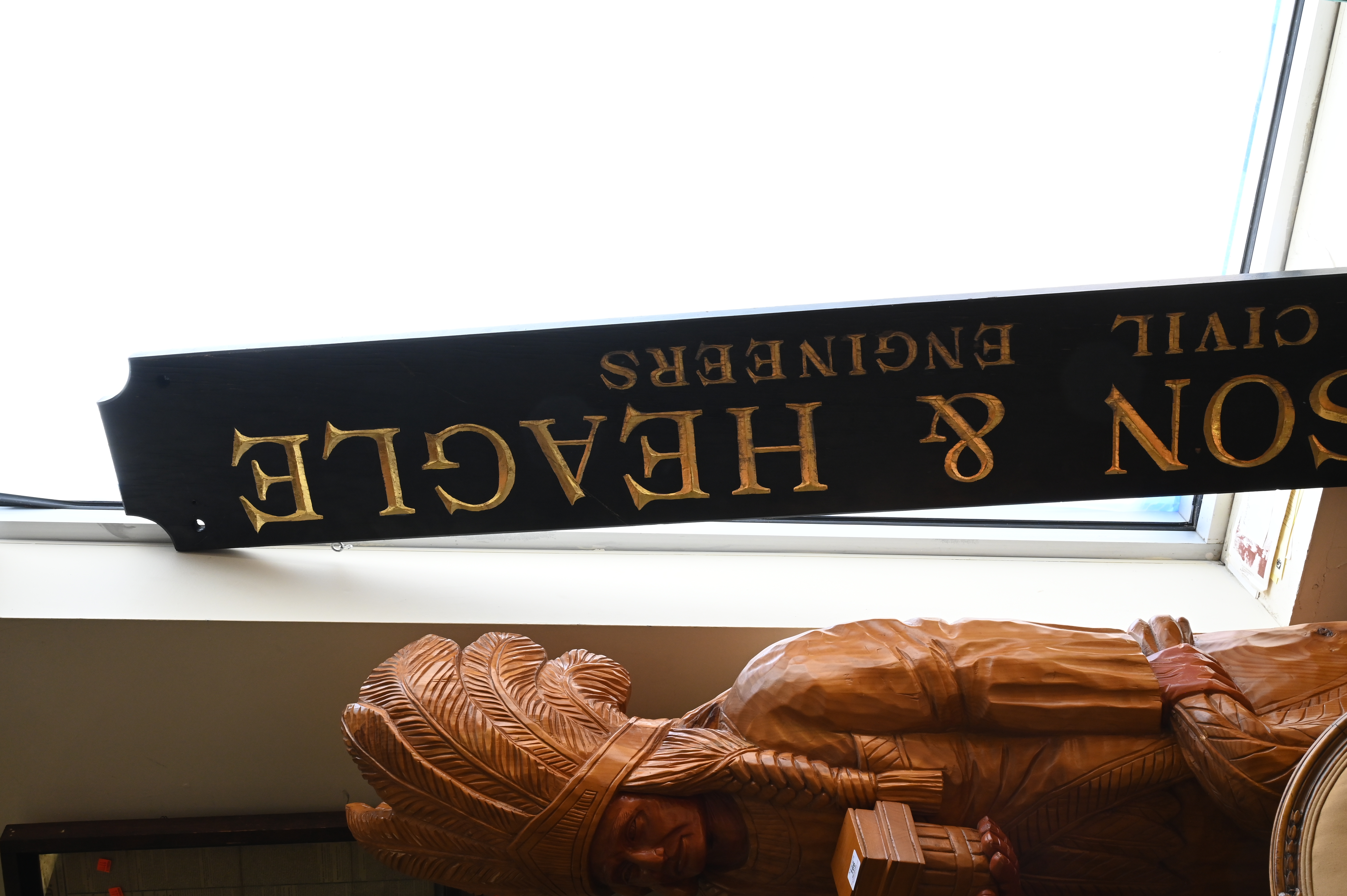 Three Carved Wood and Paint Decorated Signs, to include Blacksmith’s Tavern, length 33 inches, Tobacco Pipe Cigars, with Indian in headdress, length 42 inches, along with Megson & Heagle Civil Engineers, length approximately 92 inches.
