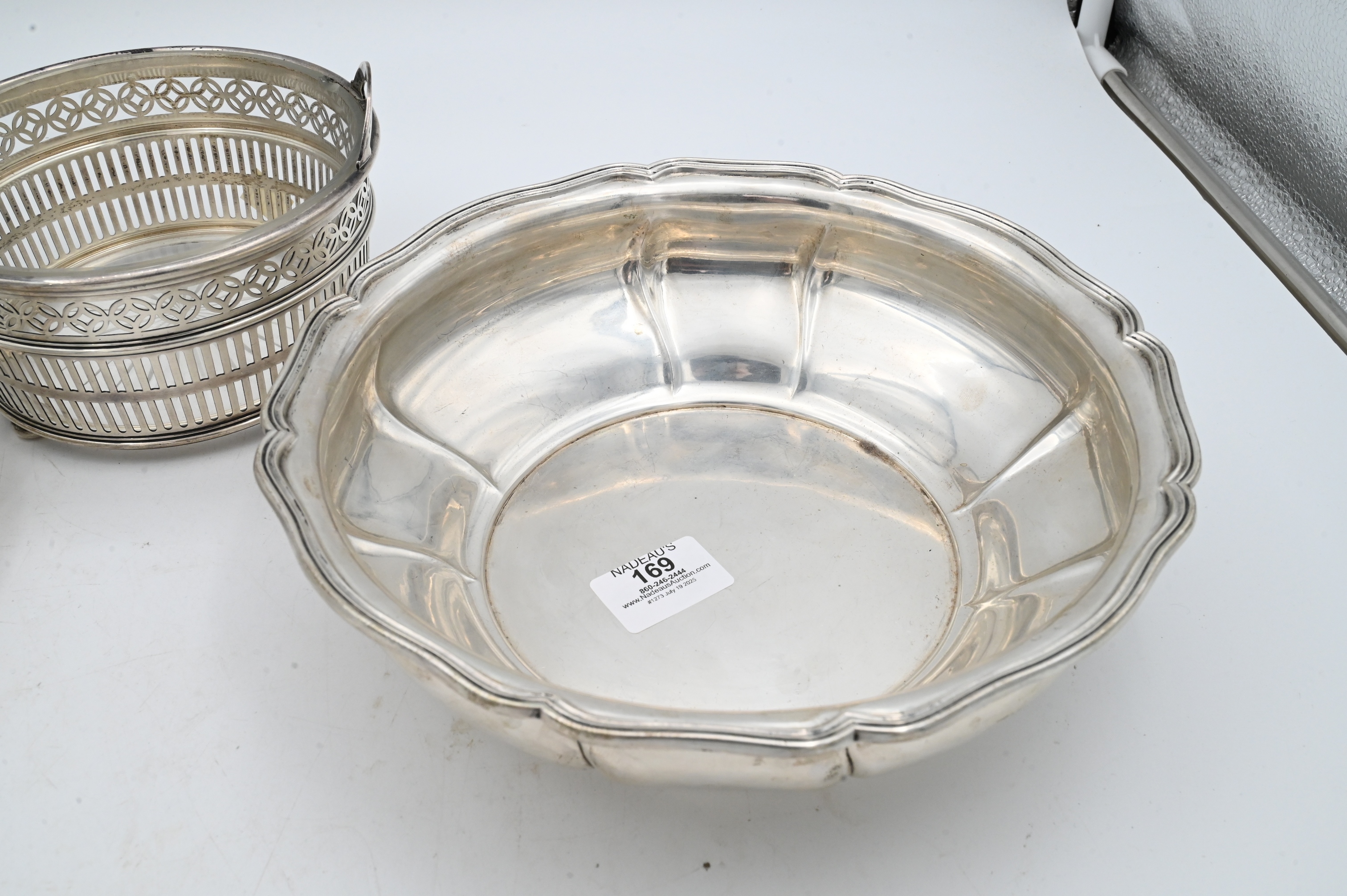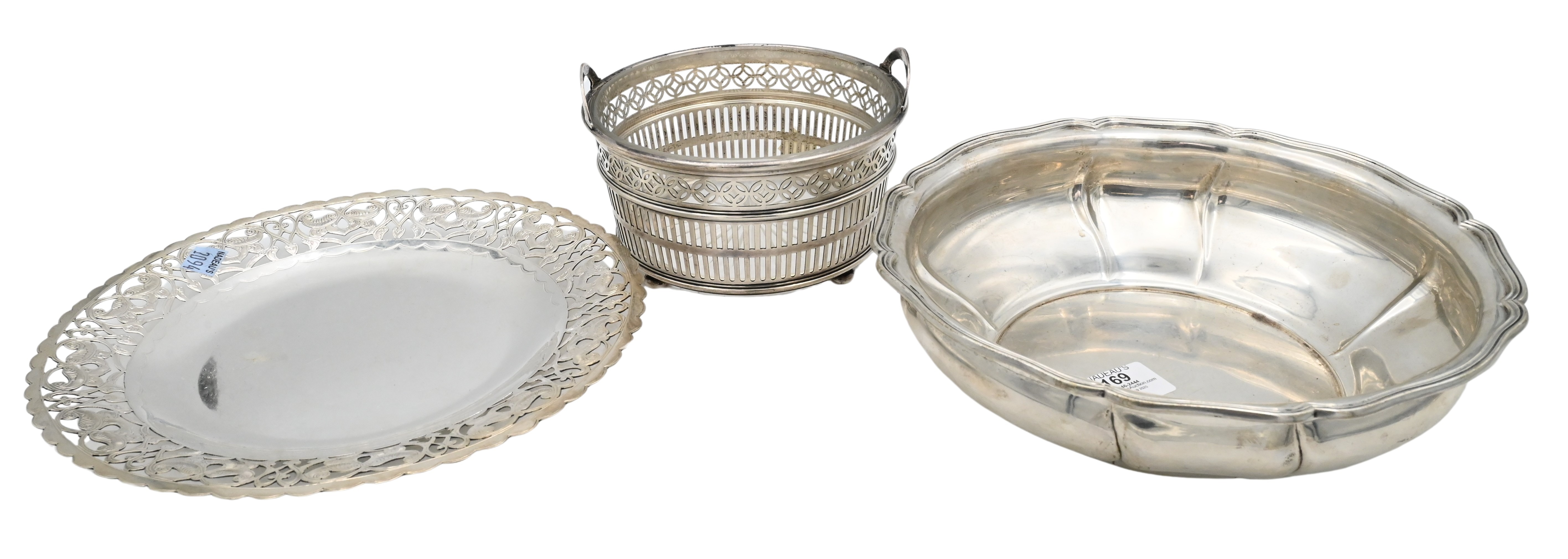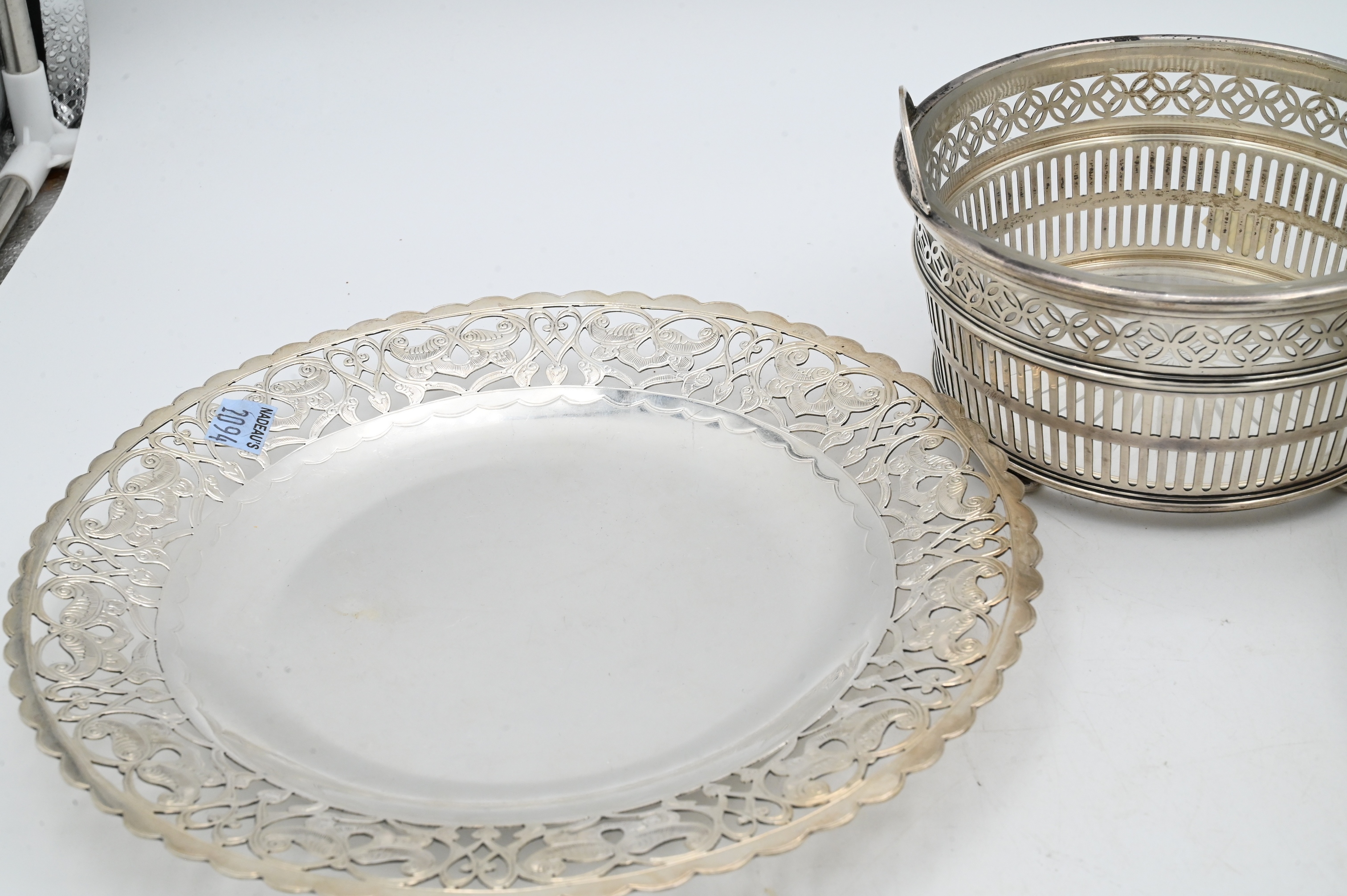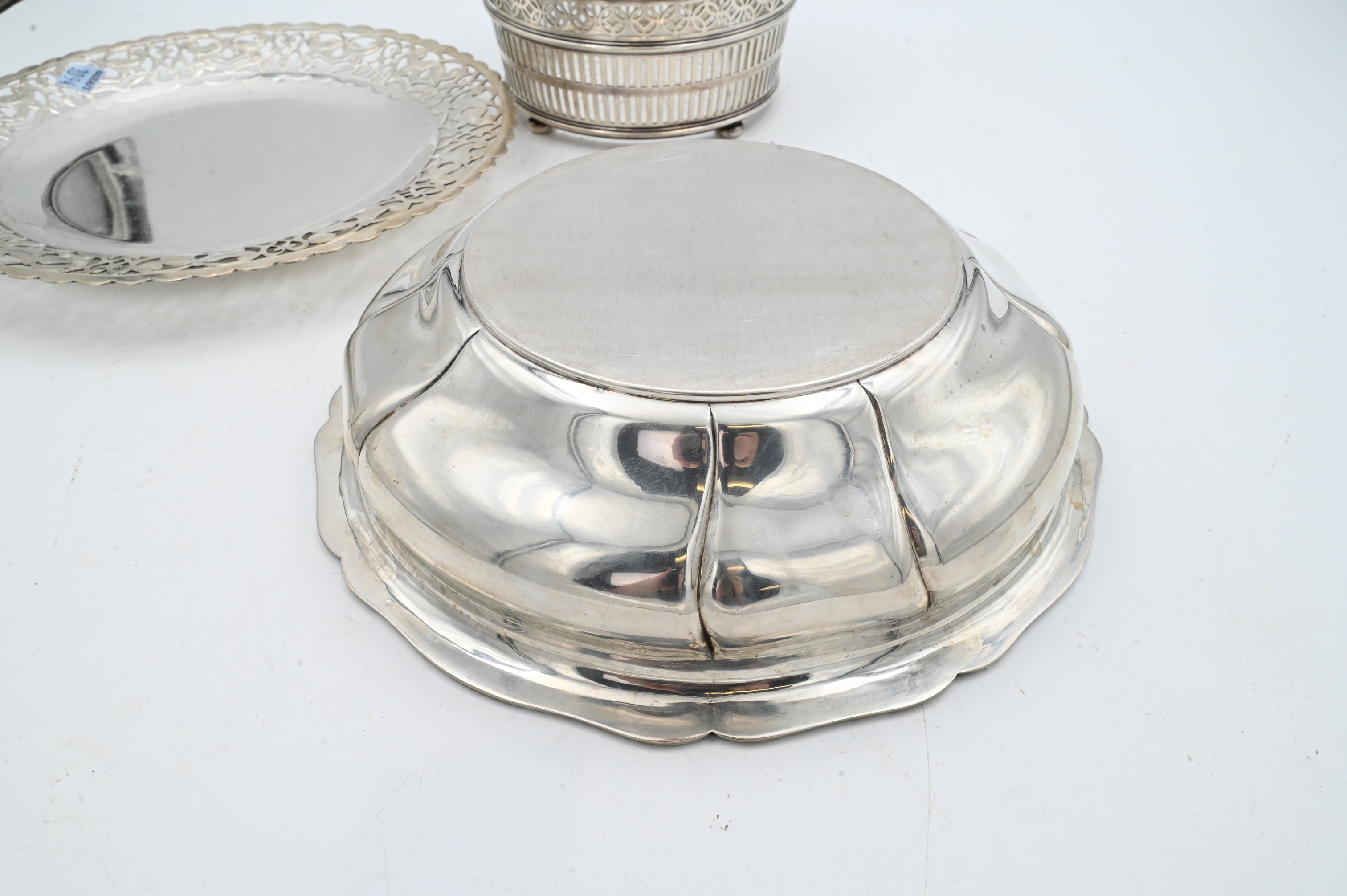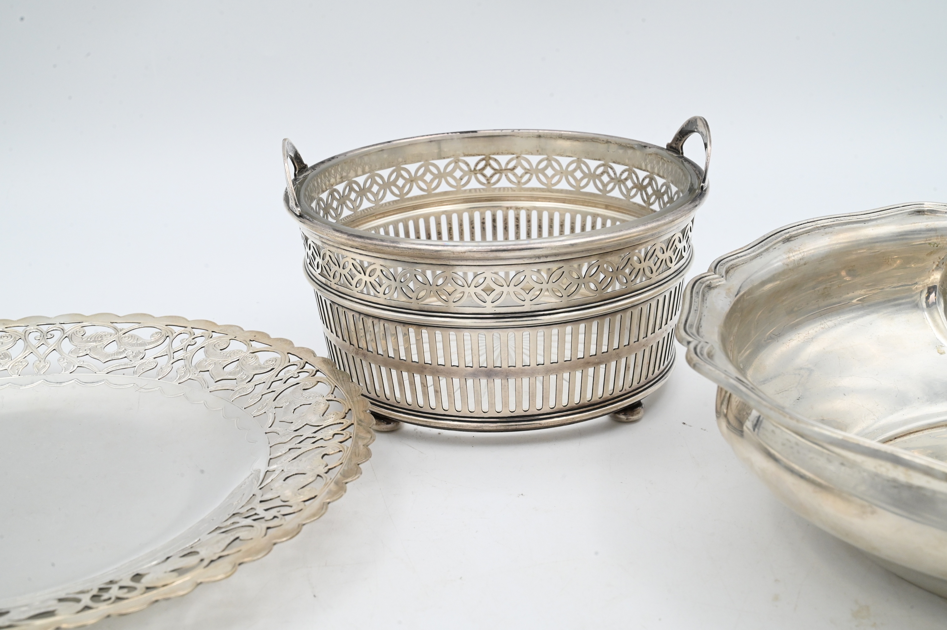 to include pierced Egyptian silver tray, continental; silver bowl, and sterling glass lined basket