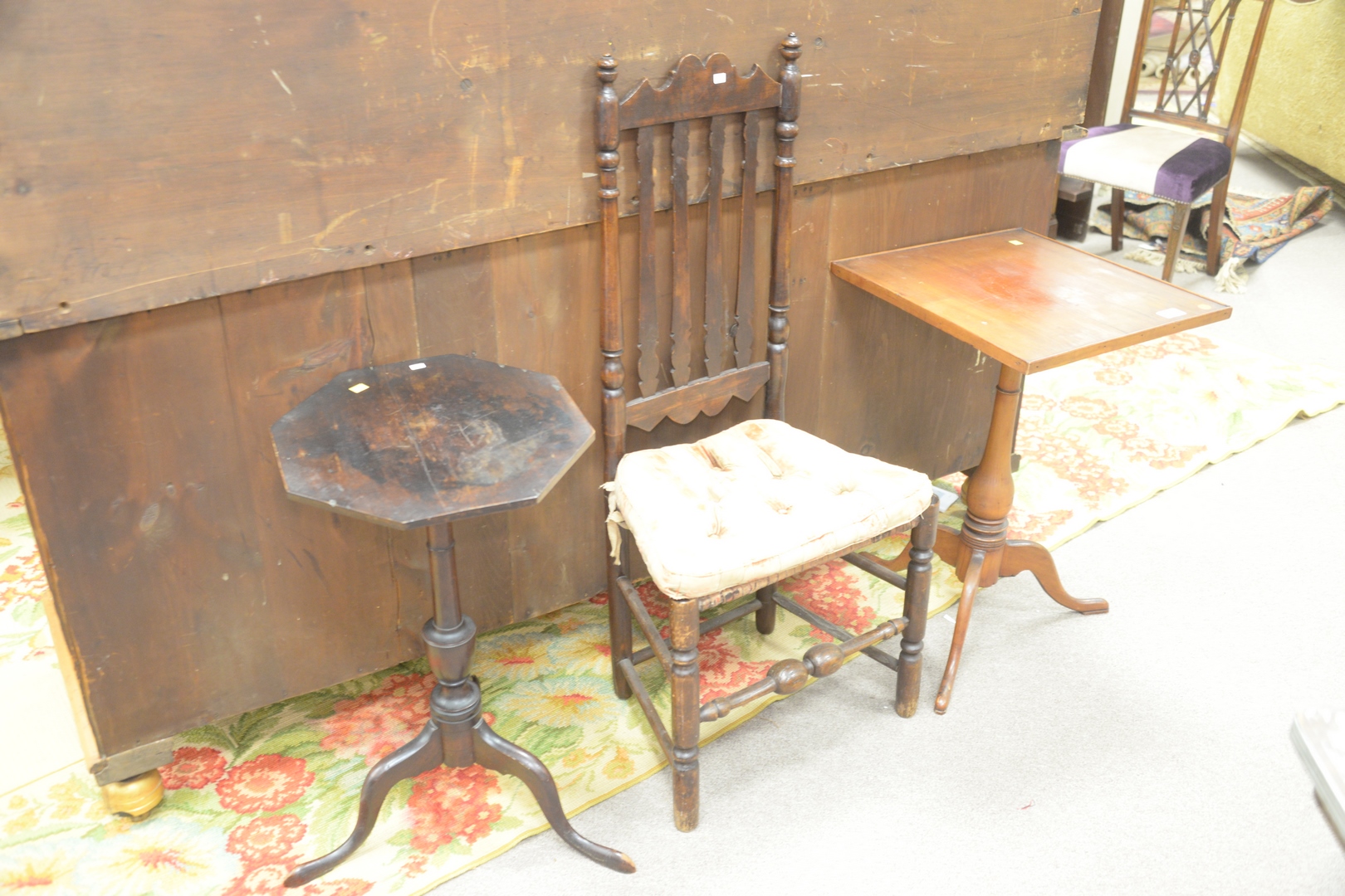Three piece primitive group, two candle stands along with side chair having slat back rush seat and turned stretchers, 27-1/2 high tables. Provenance: Estate of Dr. Thomas & Alice Kugelman, Bloomfield, Connecticut.