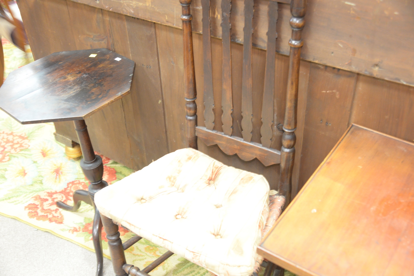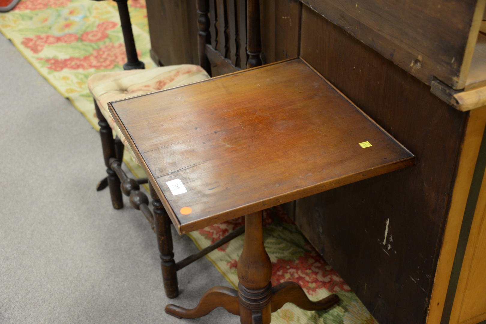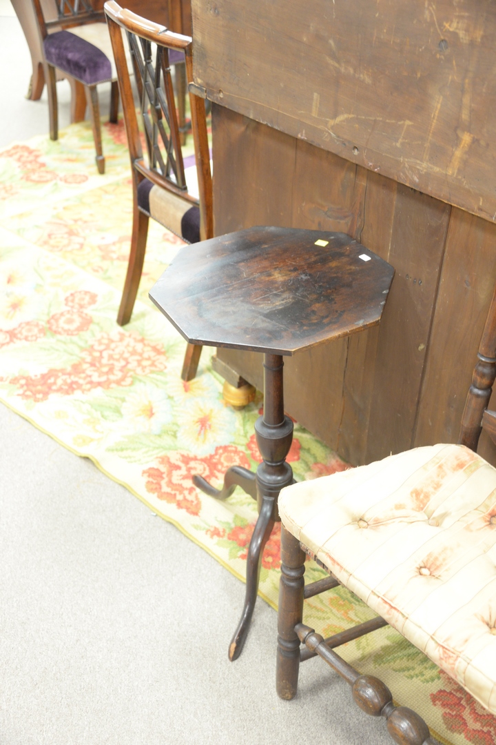 Lot 169: Three piece primitive group, two candle stands along with side chair having slat back rush seat and turned stretchers, 27-1/2 high …