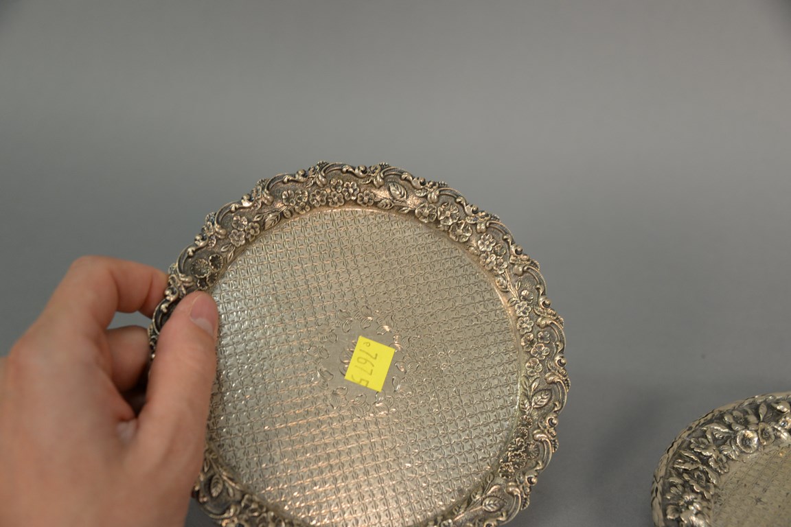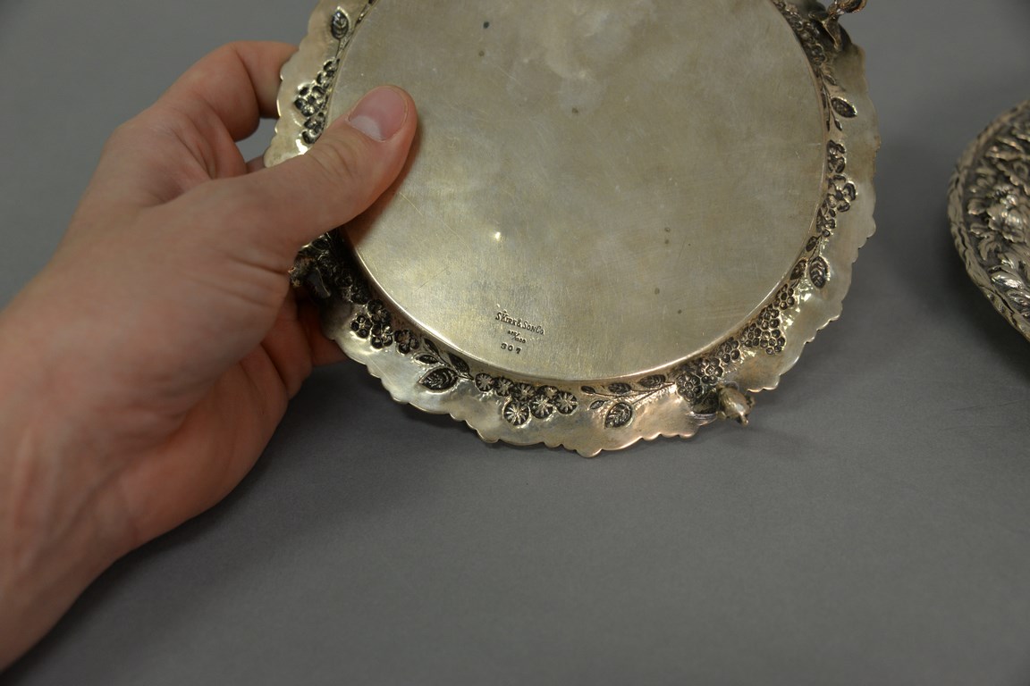 Lot 169: Two Kirk & Sons sterling silver trays, both repousse with monogram in middle on ball and claw feet, dia. 7 in. & 8 in. 16.9 t oz.