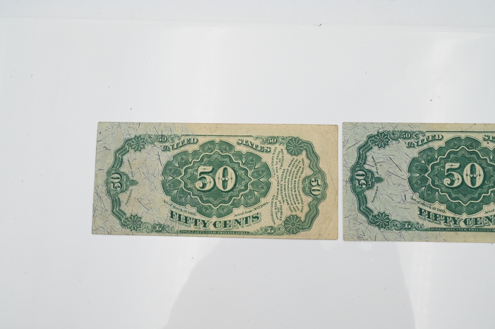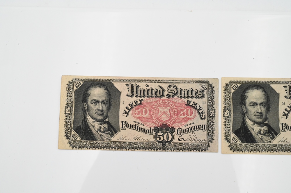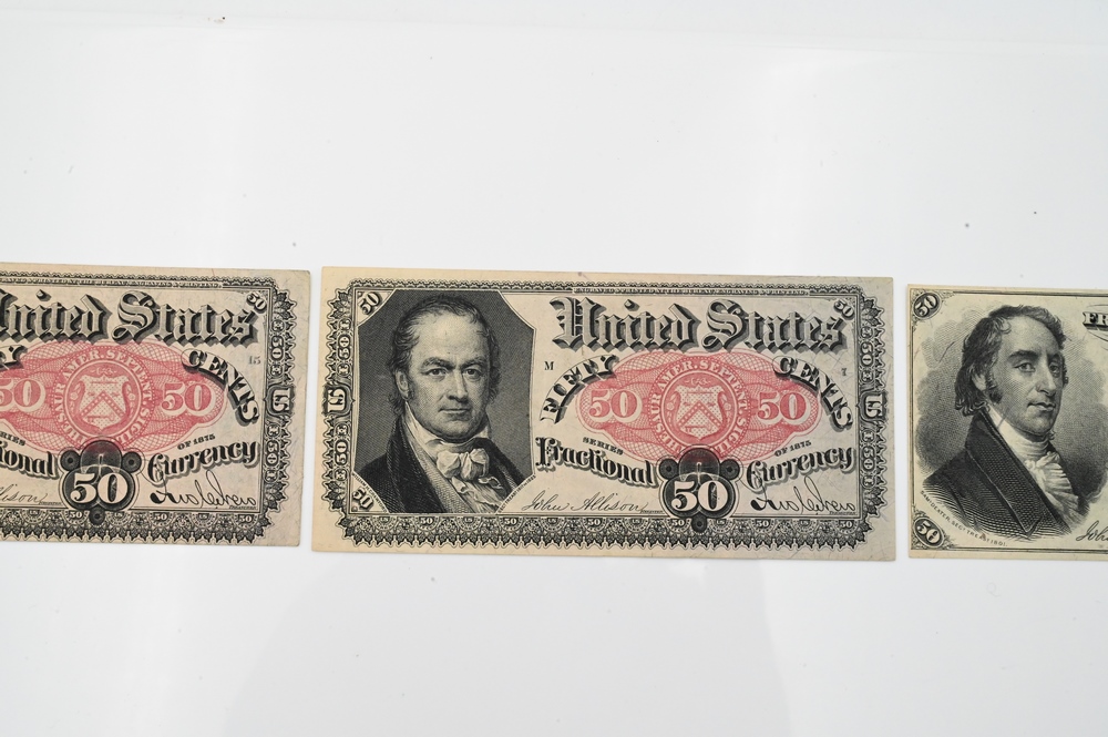 Three 50 Cent Fractional Currency, to include paper bank note, fourth issue Samuel Dexter Secretary Treasury 1801; along with two fifth issue William Crawford; all in very good condition.