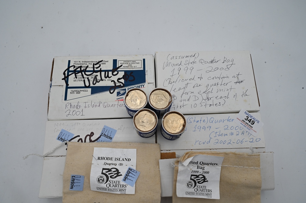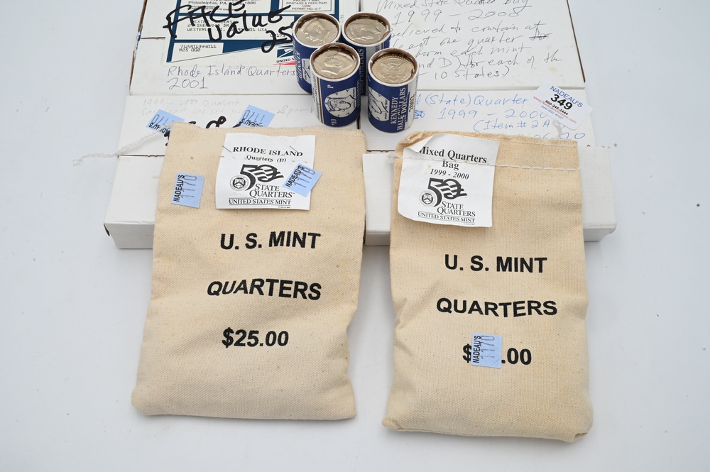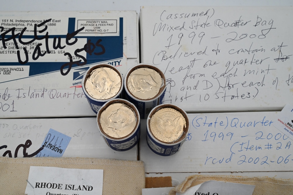 Large Lot of Coins, $161.25 face value quarters, in four boxes, two mint bags, along with $40 rolls of late Kennedy half dollars, $201.25 total face value.