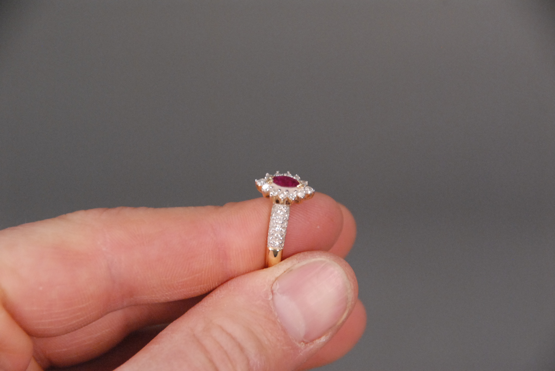 14K gold ring marquis shaped ruby surrounded by small diamonds.