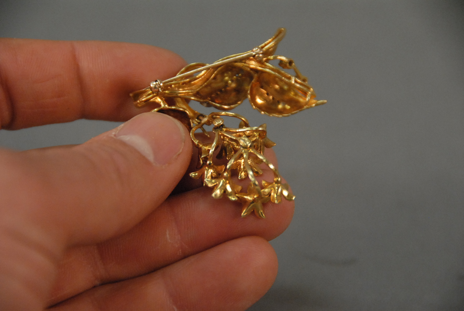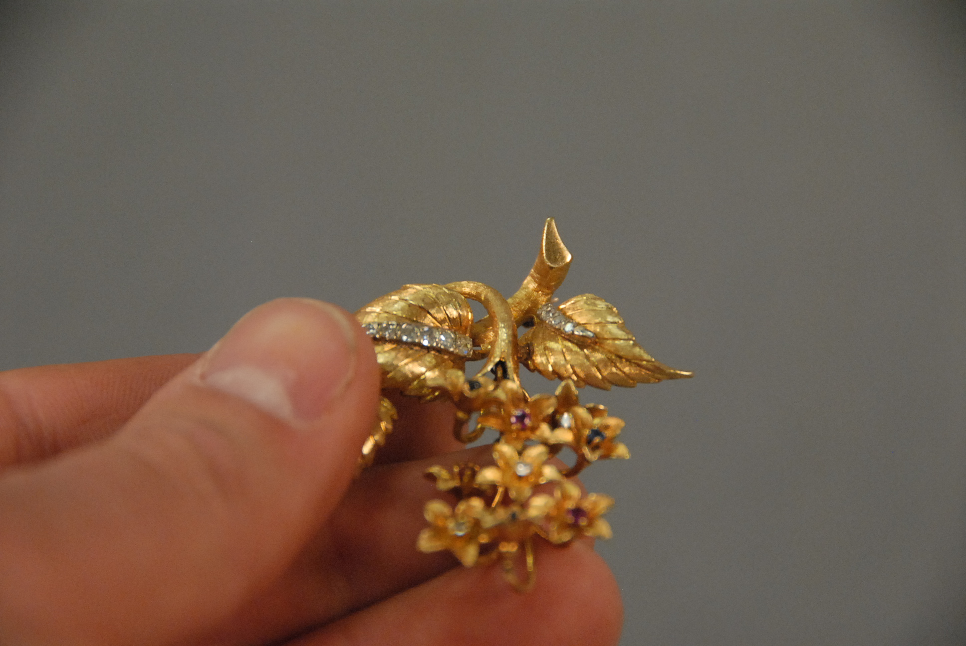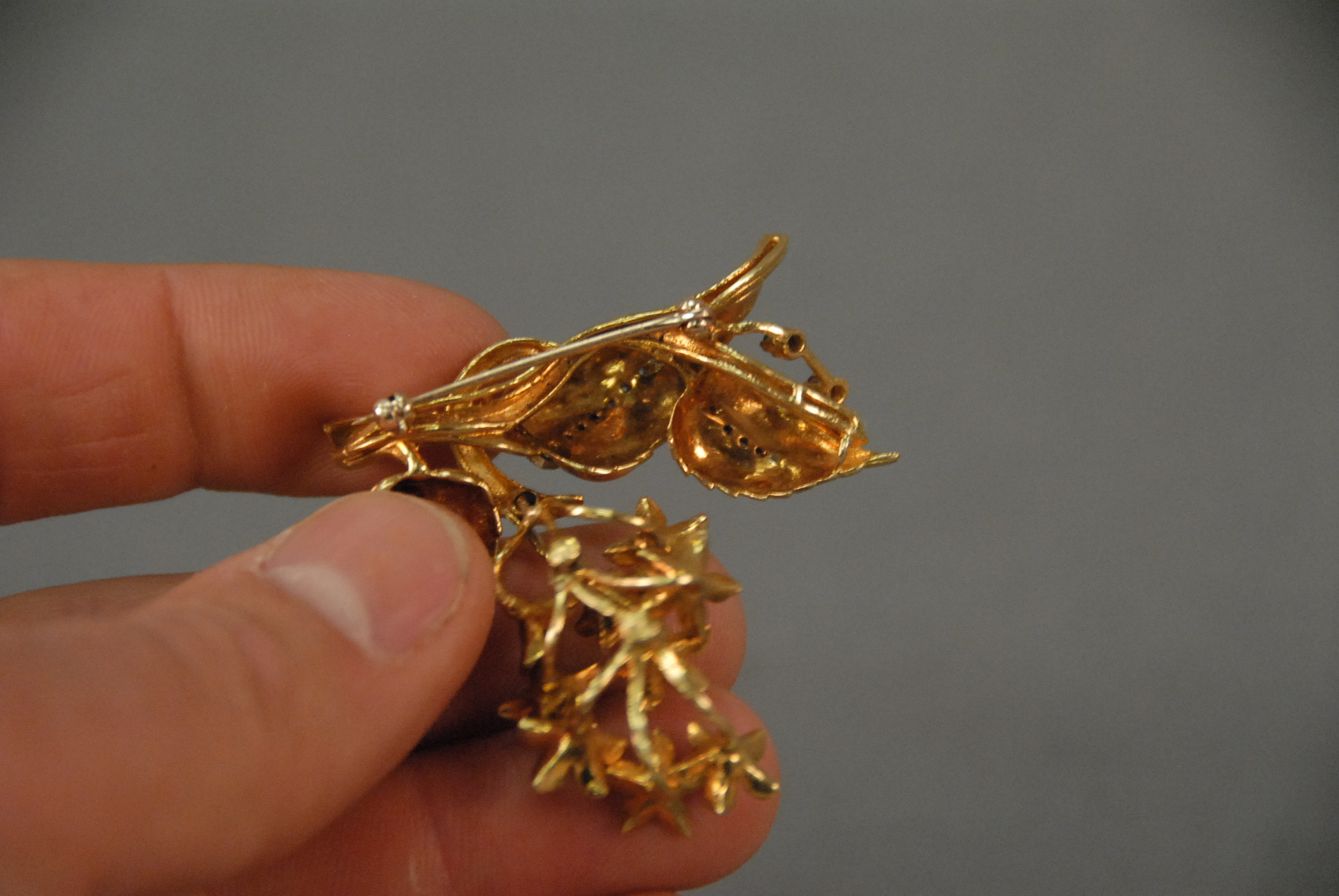 18K gold leaf pin, loose mounted with flowers set with stones. 19.8 grams