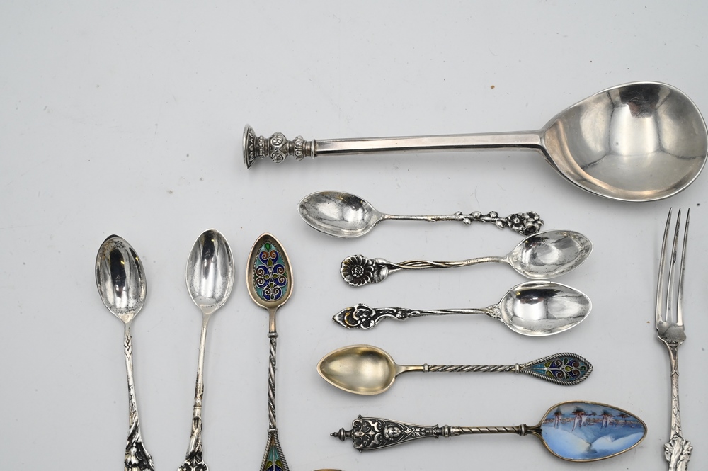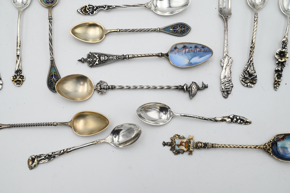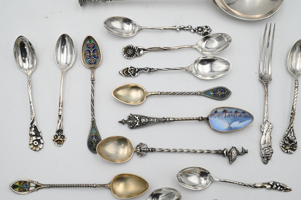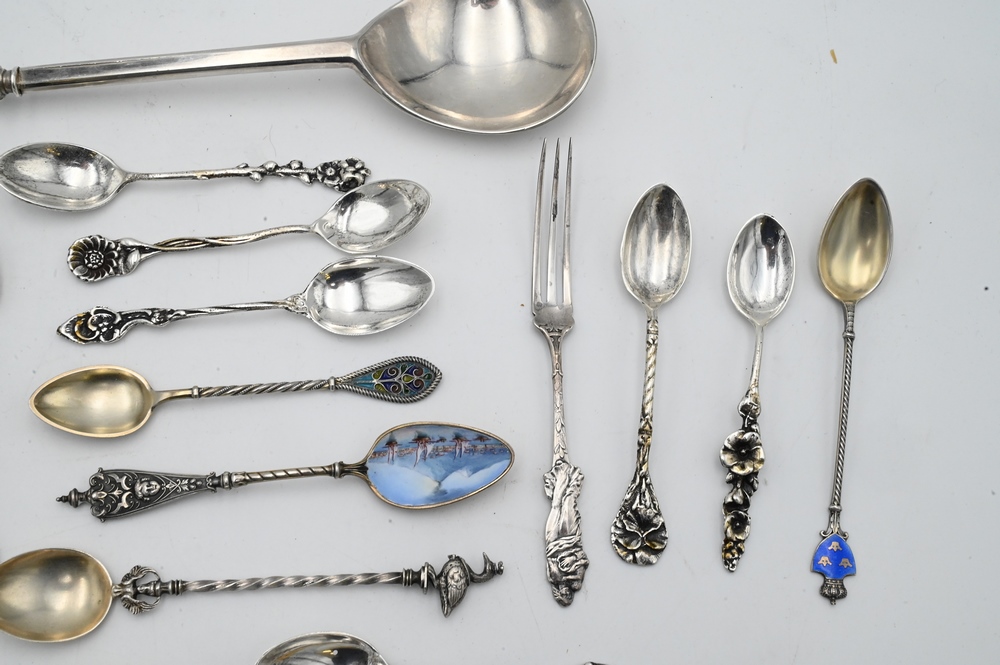 Lot 17: 21 Piece of Sterling and 800 Silver Demitasse Spoons, to include three plique de jour, set of demitasse spoons, along with silverplated Gorham serving spoon, etc.