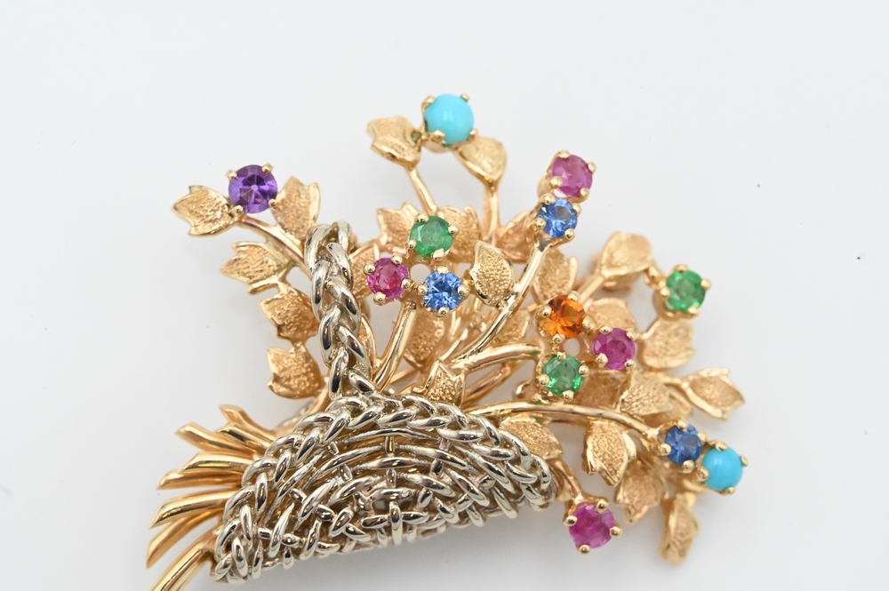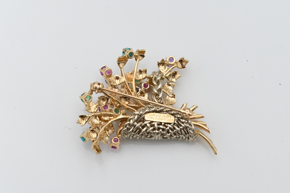 Lot 17: Forum Jewelry 14 Karat Gold Brook Basket of Flowers, having multicolor stones, length 1 5/8 inches, 12.4 grams.