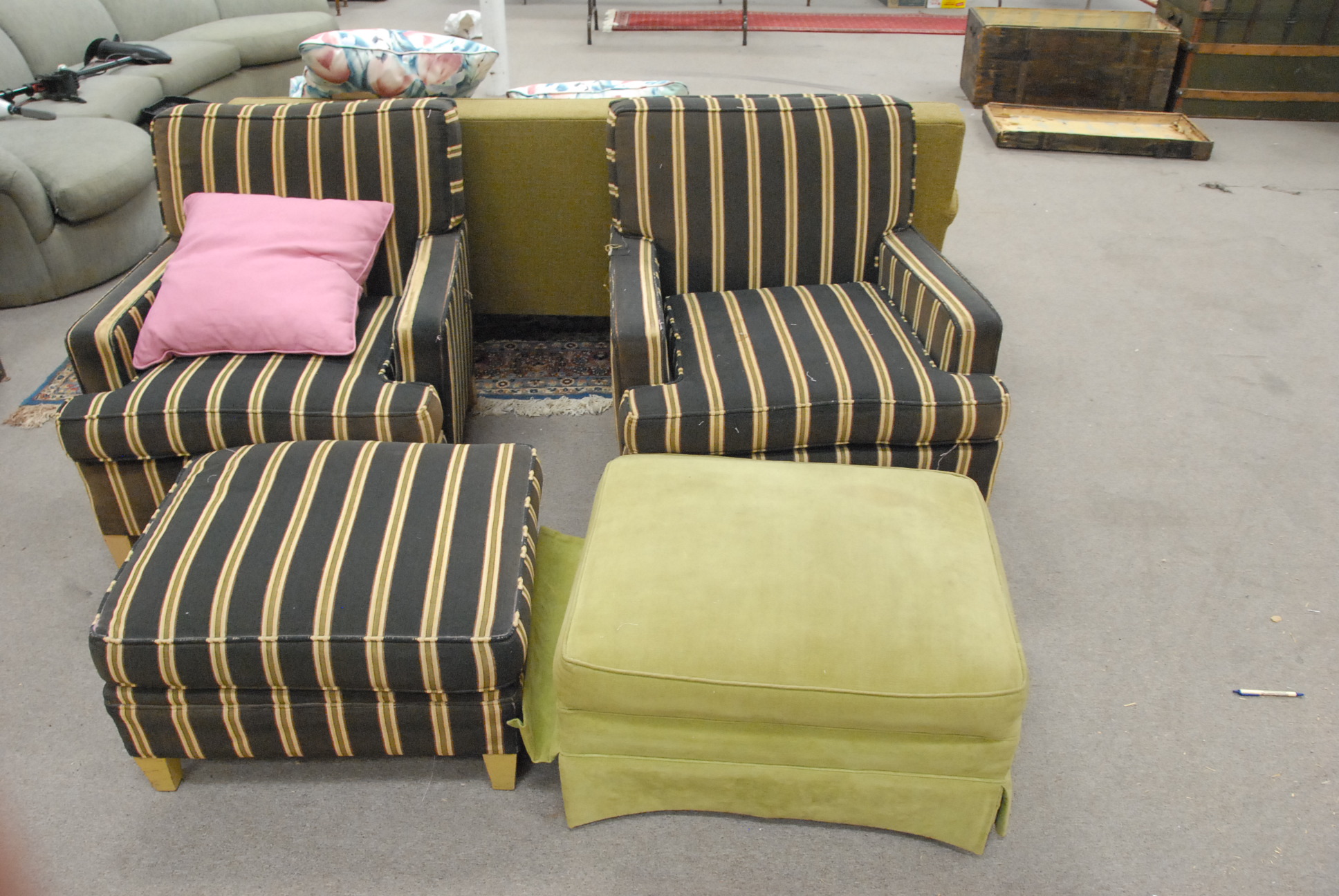Group lot of mid century furniture including a sofa, two foot stools, and two upholstered armchairs.