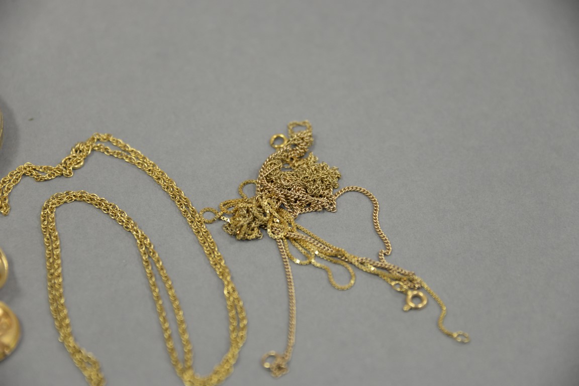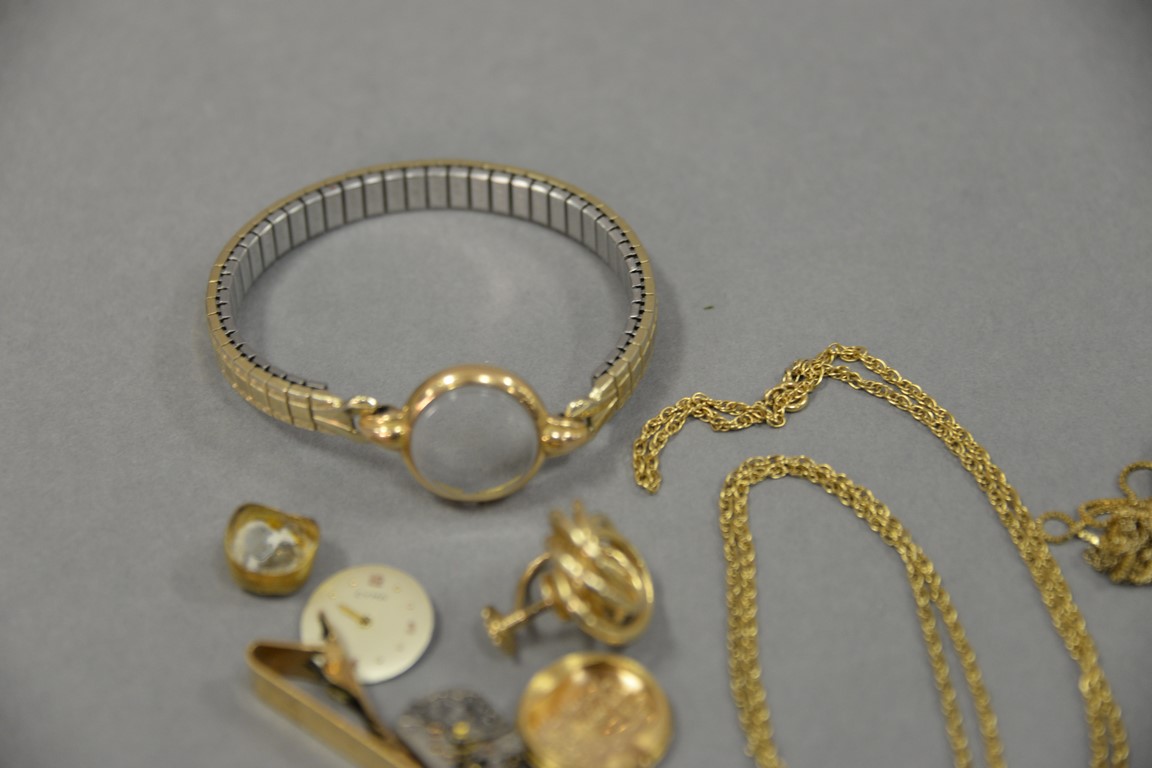 Lot 17: Group of 14K and 18K gold chains, tie clip, one earring, one tooth cup, and ladies gold wristwatch as is. 22.3 grams