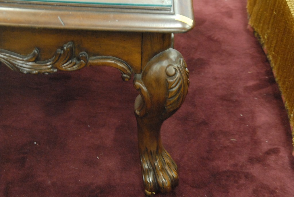 Large mahogany square coffee table with paw feet and fitted glass by Hooker, top, ht. 21in. top: 40 x 40.