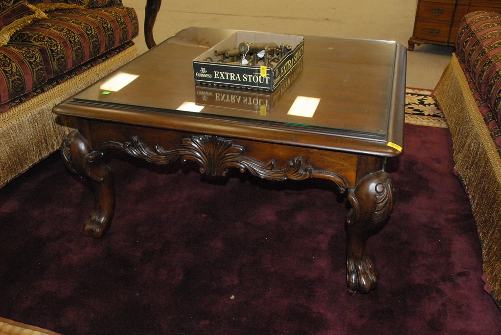 Lot 17: Large mahogany square coffee table with paw feet and fitted glass by Hooker, top, ht. 21in. top: 40 x 40.