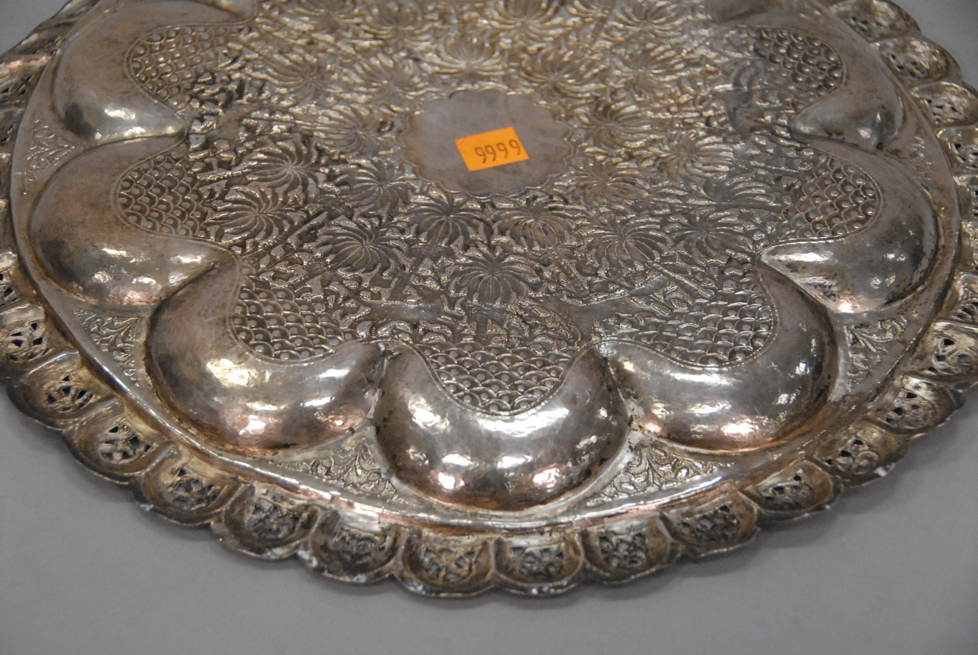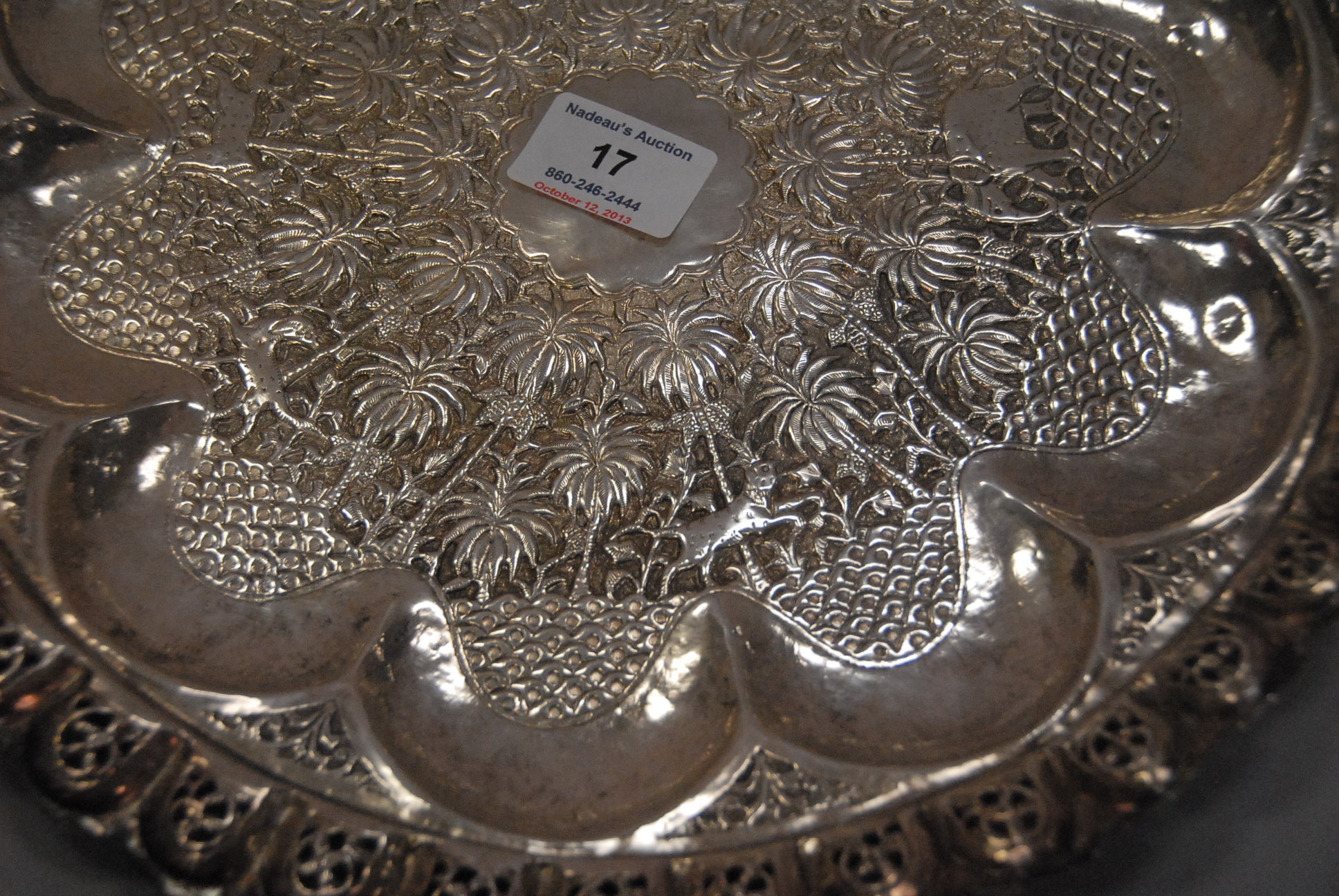 Lot 17: Mid-Eastern silver tray with palm trees and animals including elephant and deer. 11.7 t oz., dia. 13 1/2in.