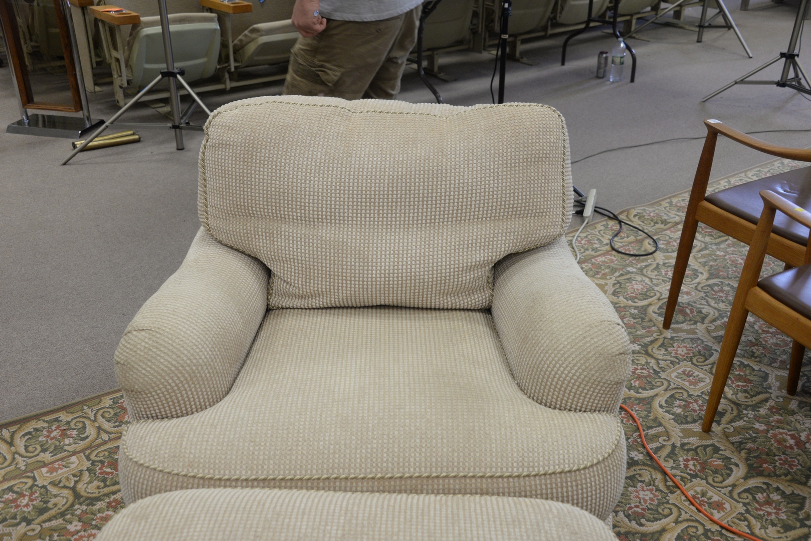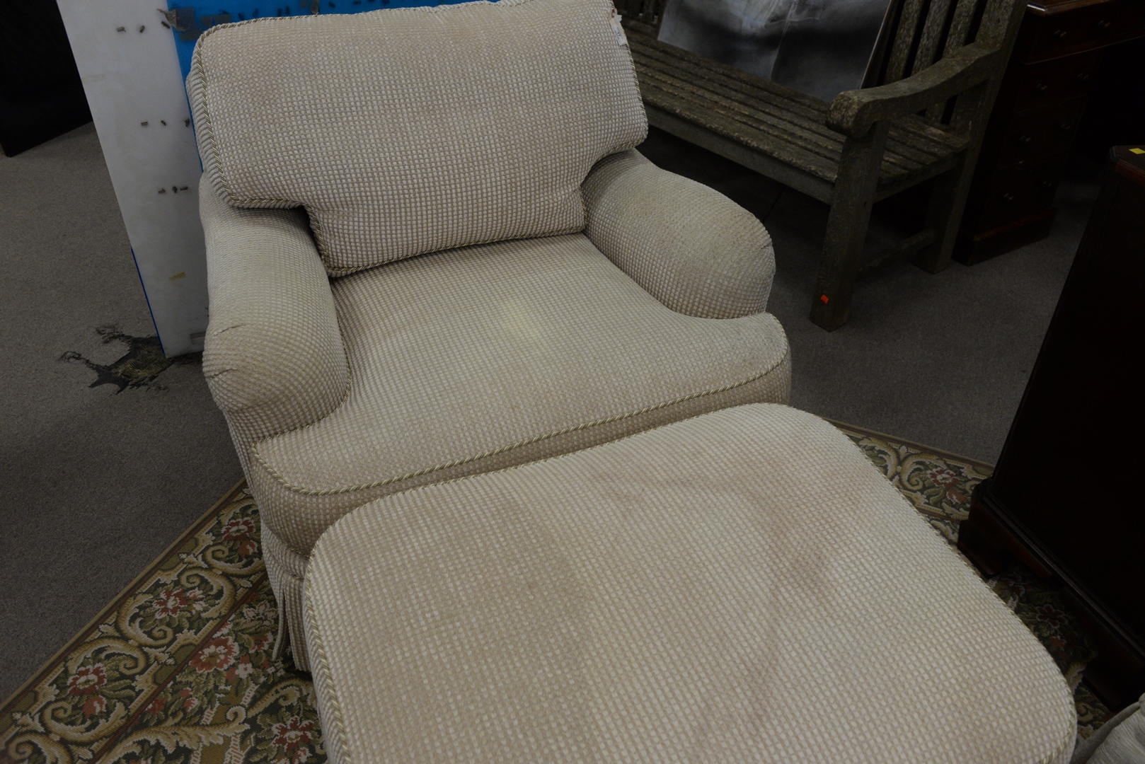 Lot 17: Pair of Hickory White Upholstered Easy Chairs and Ottomans, height 36 inches, width 38 inches, (slight soiling).