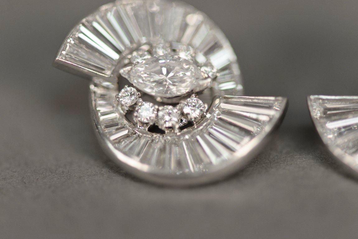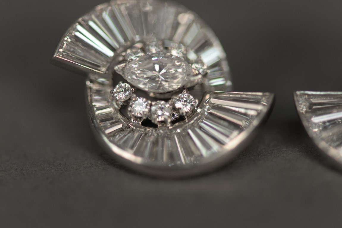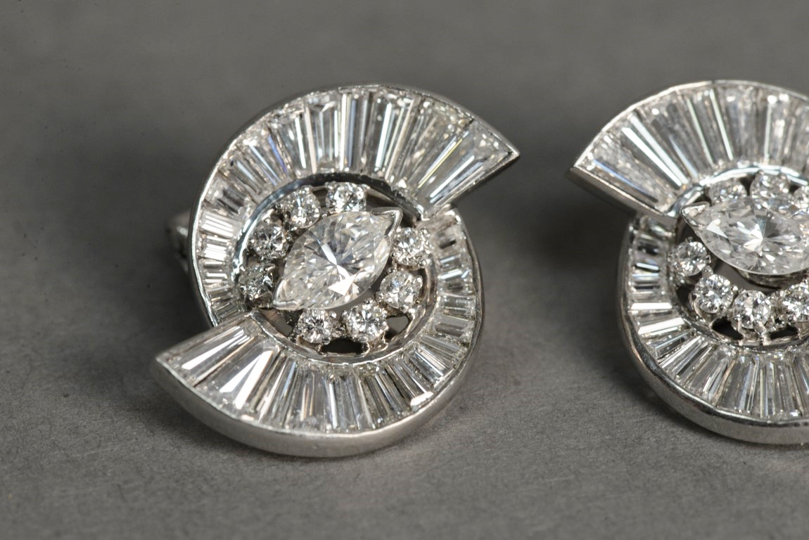 Pair of non-pierced prong and channel set diamond earrings in platinum tested with platinum tested clip backs. Each earring centers one prong set marquise cut diamond flanked by eight 8 prong set round brilliant cut diamond melee a total of 16 round brilliant cut diamonds with two outside swirls each containing fourteen 14 channel set graduated straight and tapered baguette cut diamonds a total of fifty-six 56 baguettes. The earrings weigh a total of 14.2 grams, including the diamonds. Total estimated marquise cut diamond weight 1.00 carat, color H, clarity VS1-VS2. Total estimated round brilliant cut diamond weight – 0.48 carats, color H, clarity SI1-SI2. Total estimated baguette cut diamond weight – 5.12 carats, color G-H, clarity VS.