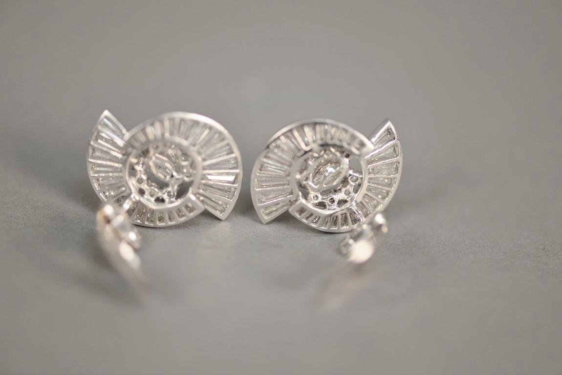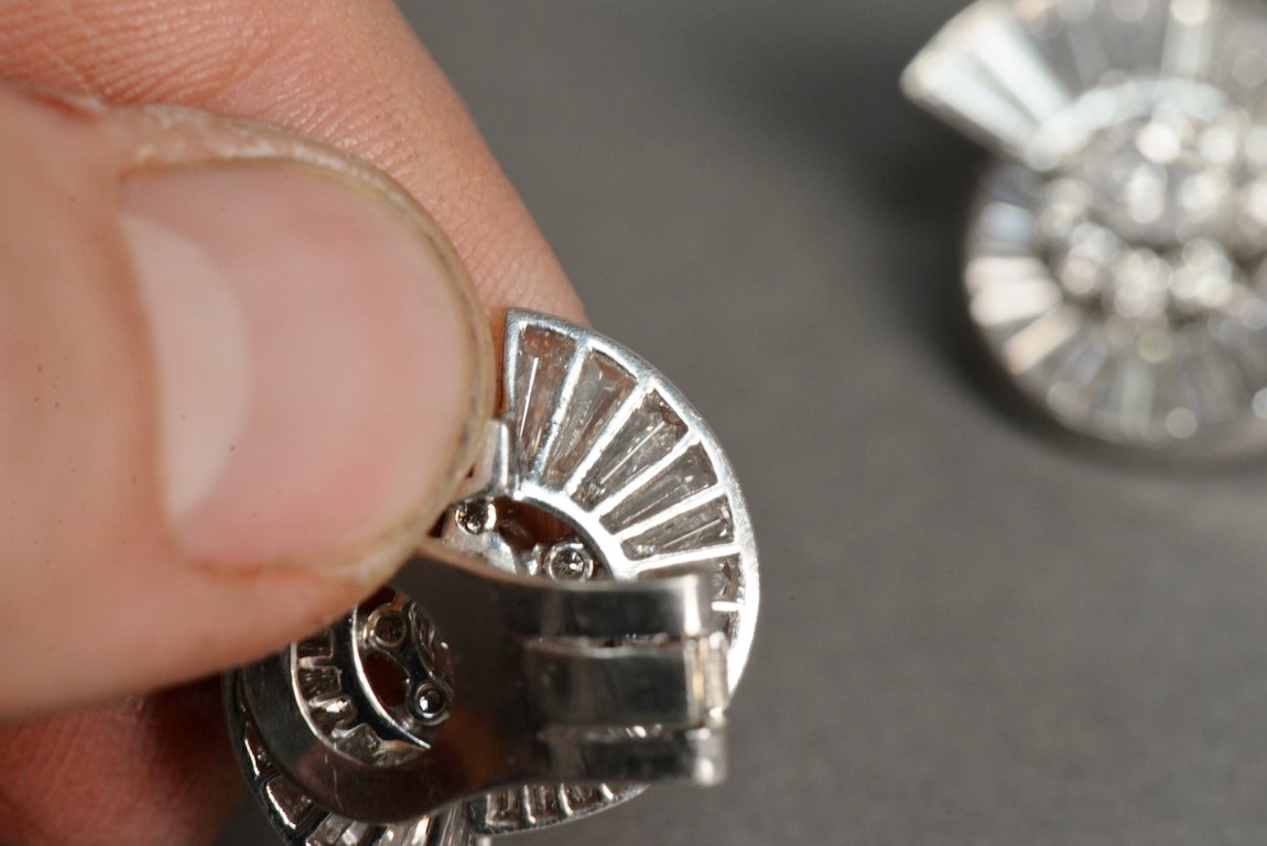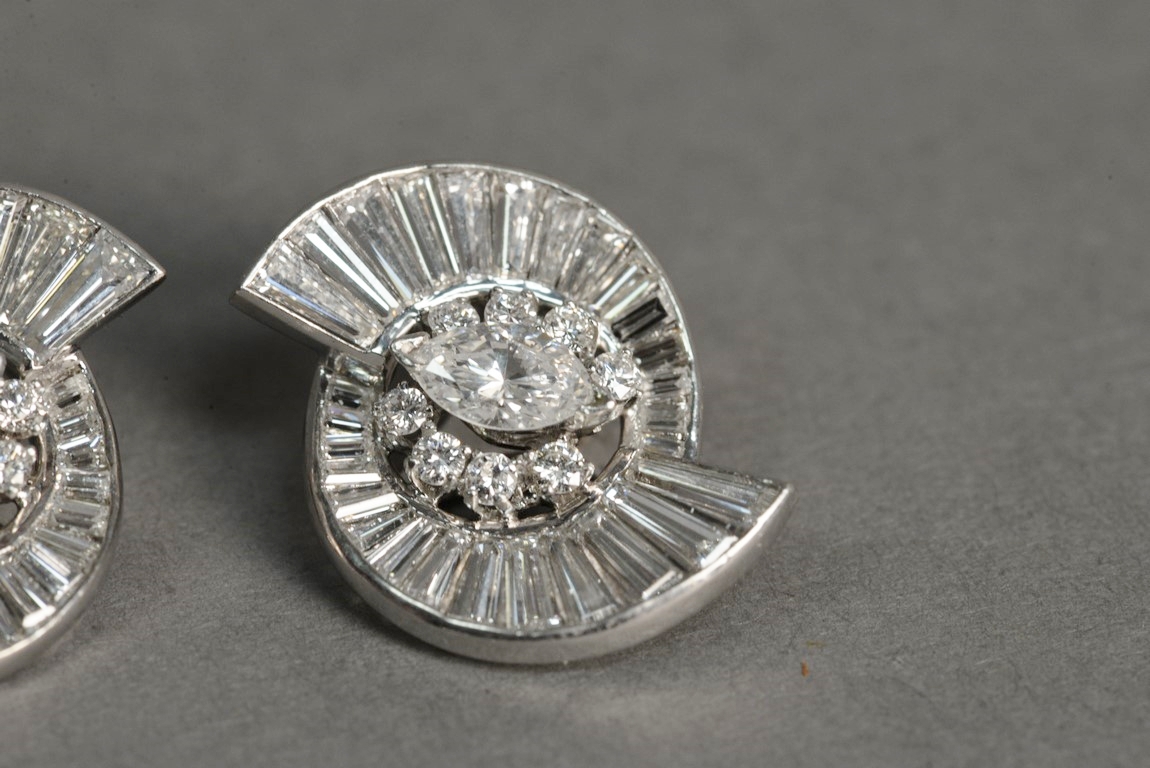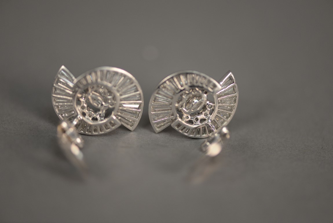 Pair of non-pierced prong and channel set diamond earrings in platinum tested with platinum tested clip backs. Each earring centers one prong set marquise cut diamond flanked by eight 8 prong set round brilliant cut diamond melee a total of 16 round brilliant cut diamonds with two outside swirls each containing fourteen 14 channel set graduated straight and tapered baguette cut diamonds a total of fifty-six 56 baguettes. The earrings weigh a total of 14.2 grams, including the diamonds. Total estimated marquise cut diamond weight 1.00 carat, color H, clarity VS1-VS2. Total estimated round brilliant cut diamond weight – 0.48 carats, color H, clarity SI1-SI2. Total estimated baguette cut diamond weight – 5.12 carats, color G-H, clarity VS.