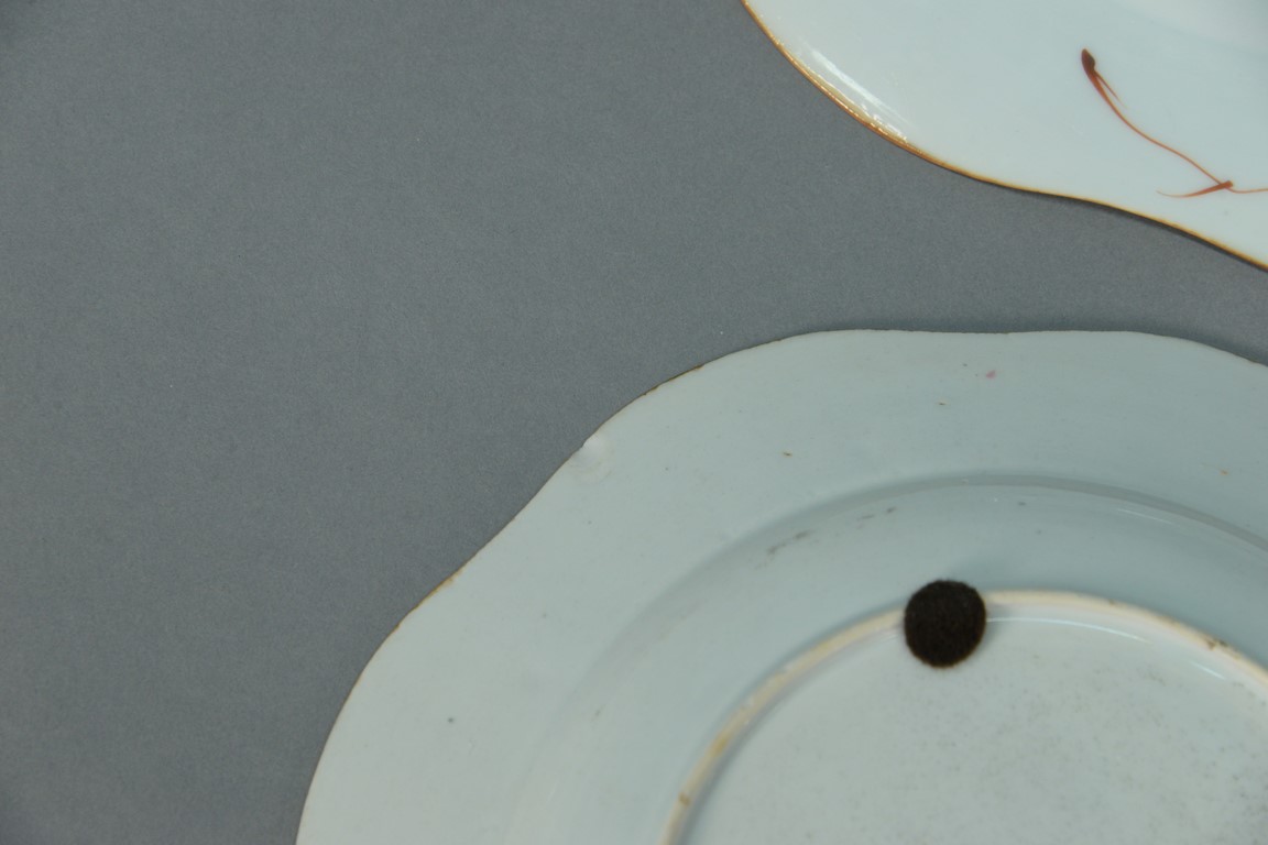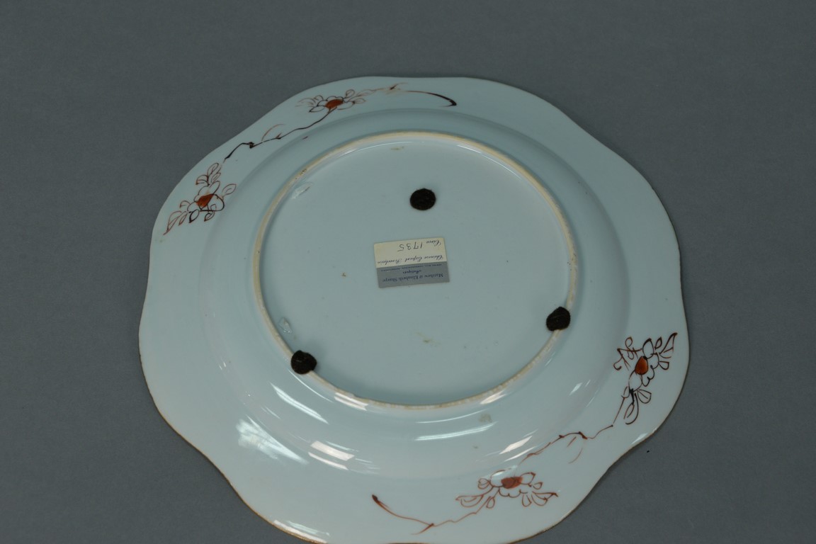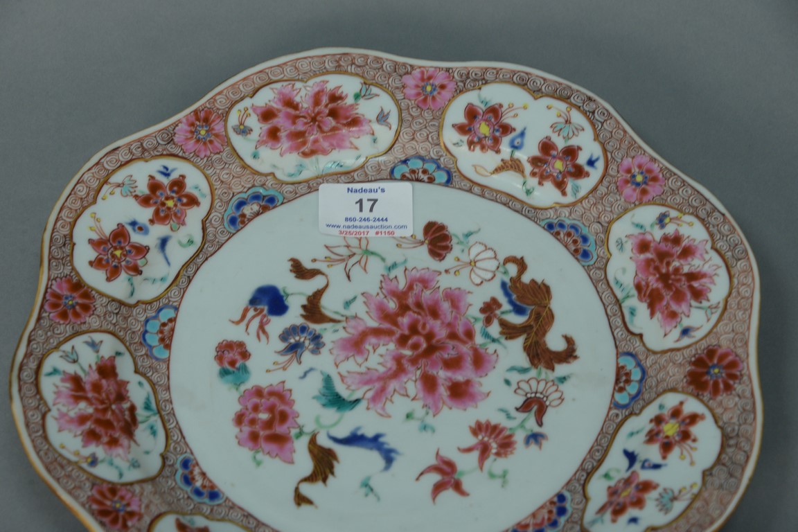 Lot 17: Set of three Chinese export plates, each with shaped borders, largest with label on bottom: Matthew & Elizabeth Sharp Antiques PA, 1…
