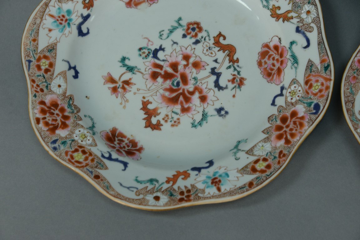 Set of three Chinese export plates, each with shaped borders, largest with label on bottom: Matthew & Elizabeth Sharp Antiques PA, 18th century.