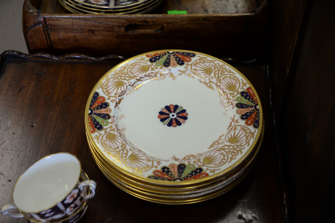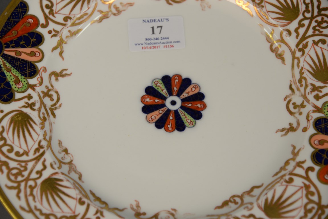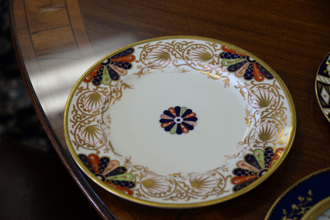 Lot 17: Set of twelve Copeland porcelain dinner plates, gold decorated border and painted red, green, and blue fan decoration, sold by A. Fr…