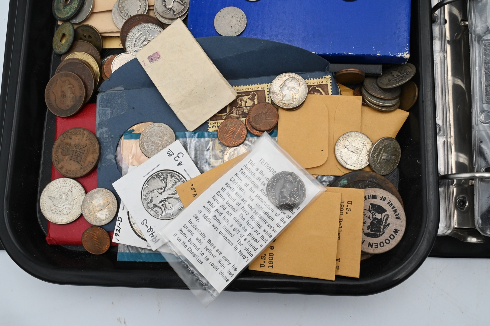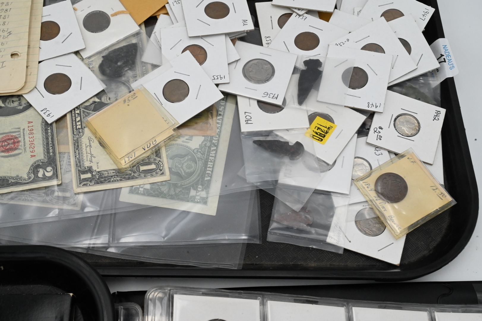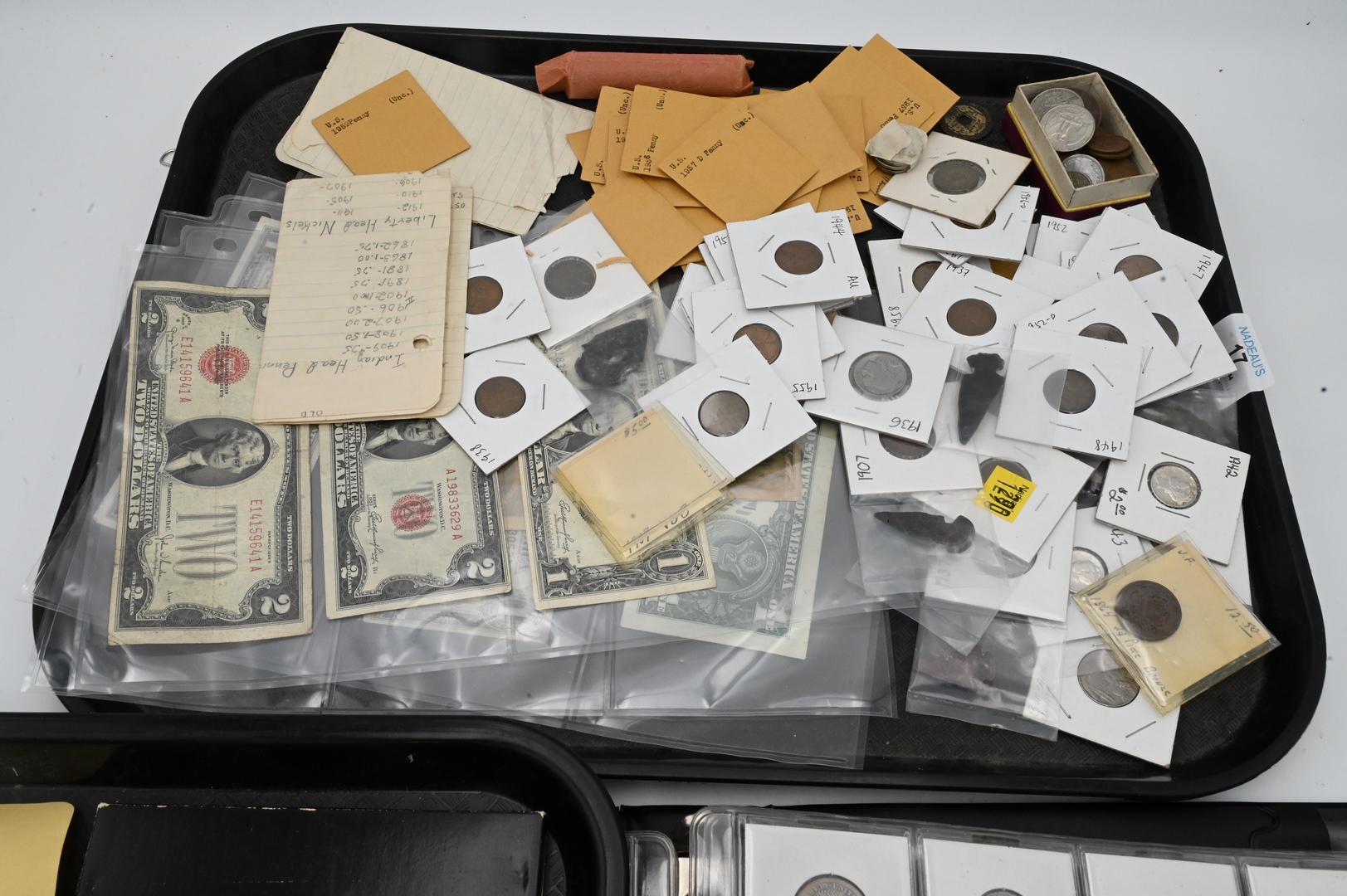 Silver Coin Lot, to include eight silver dollars; approximately $25 face value silver dimes; three nickels; quarters; half dollars and dollars; paper money; along with pennies, etc.