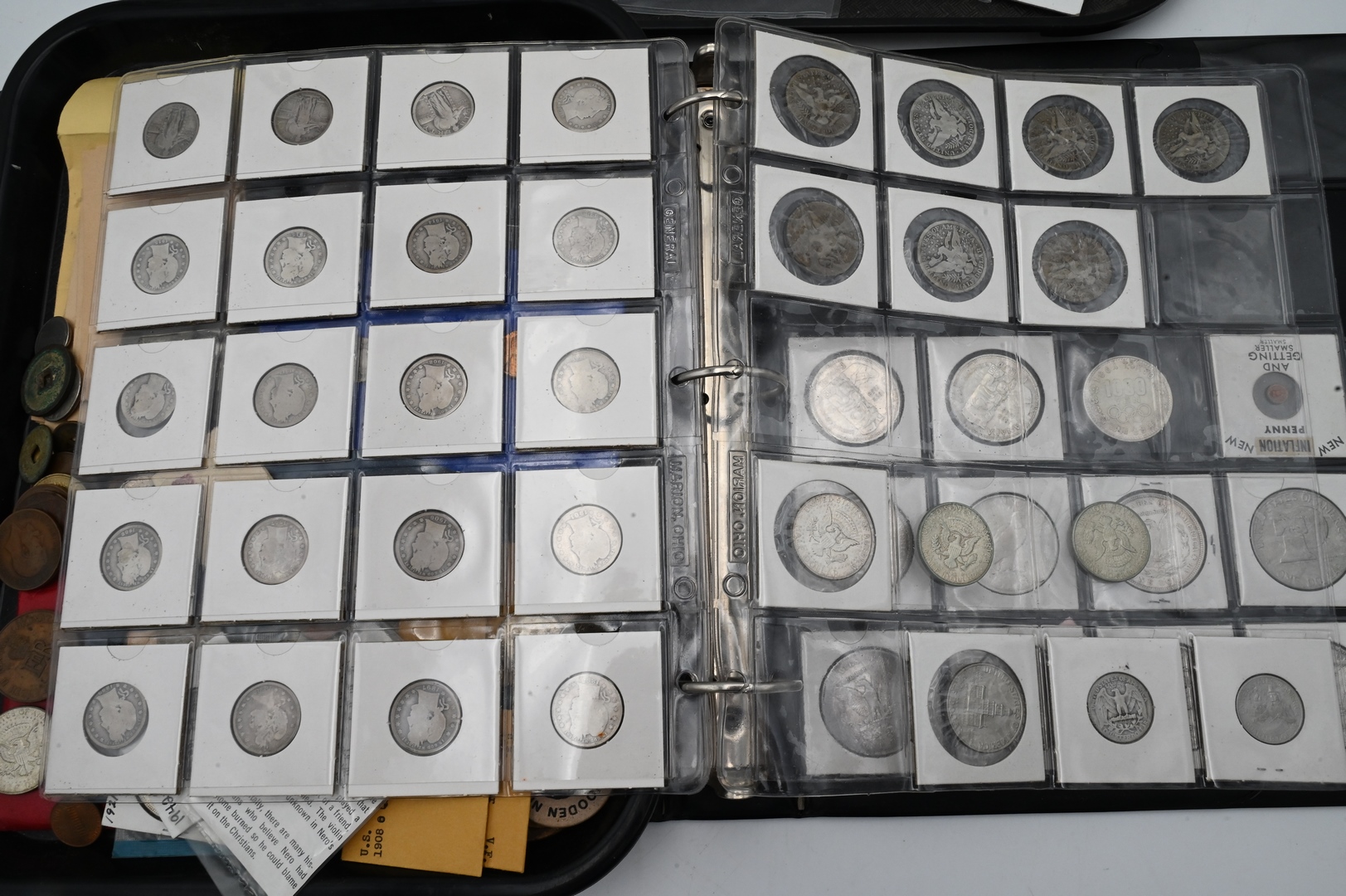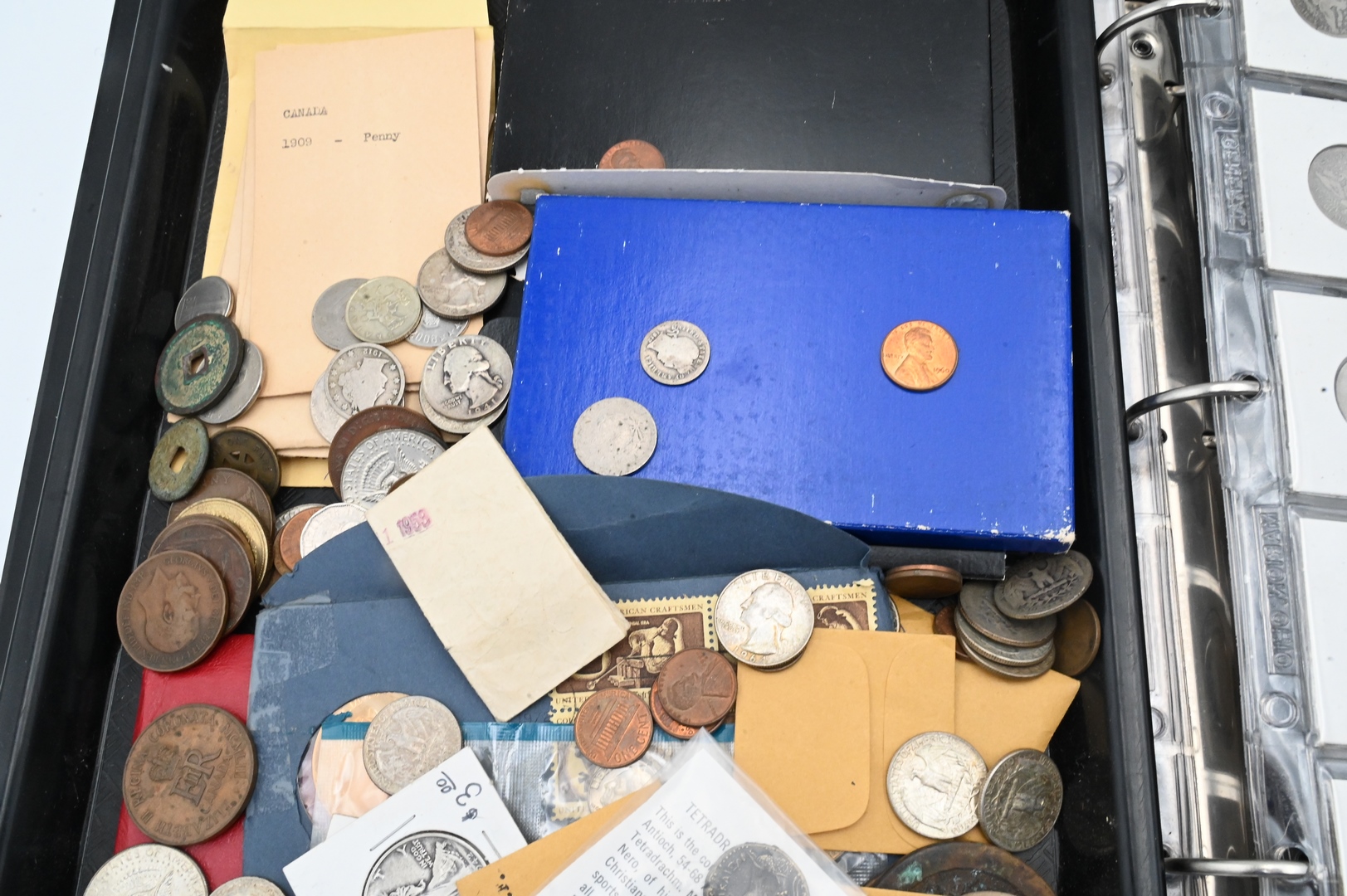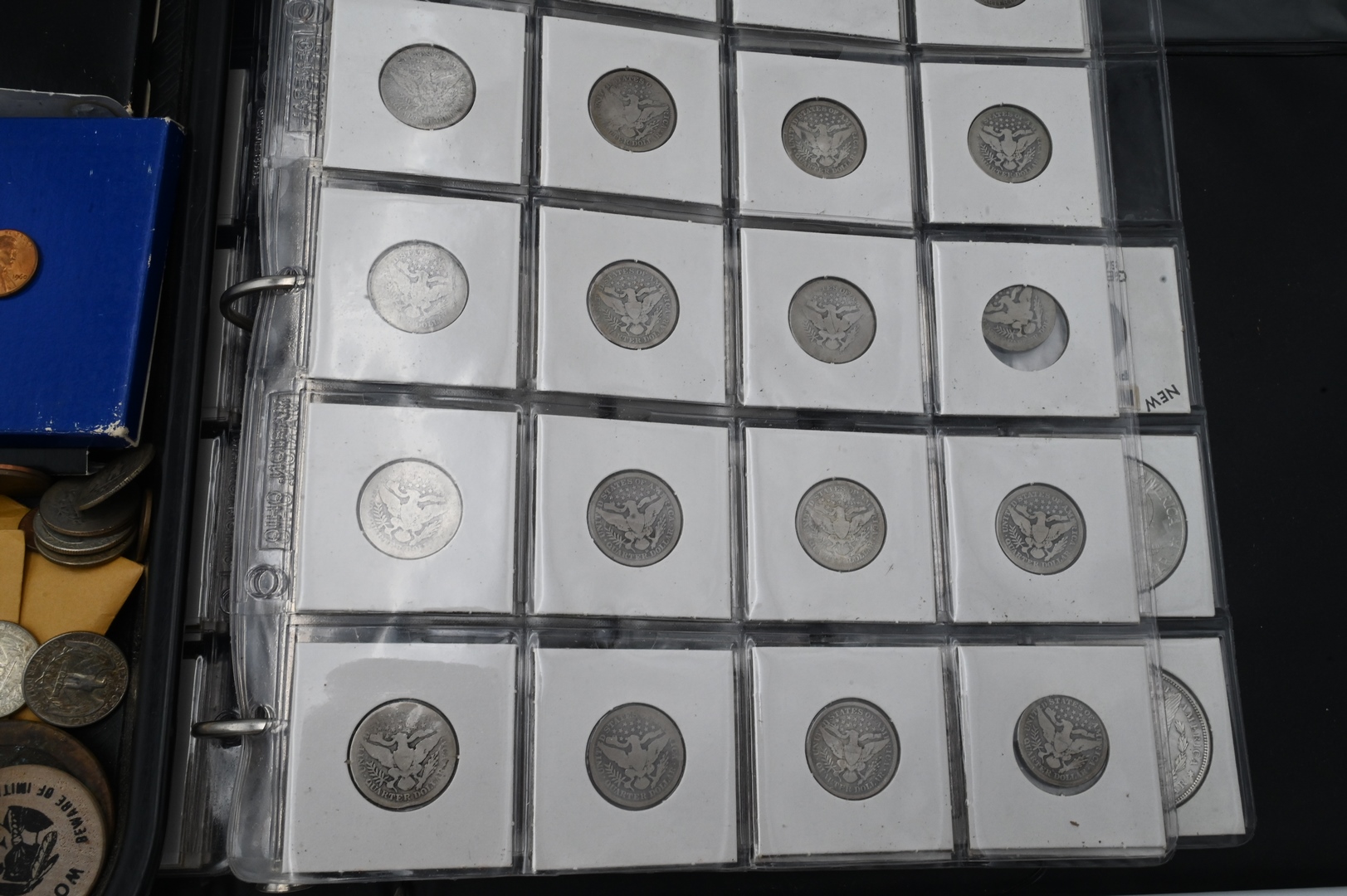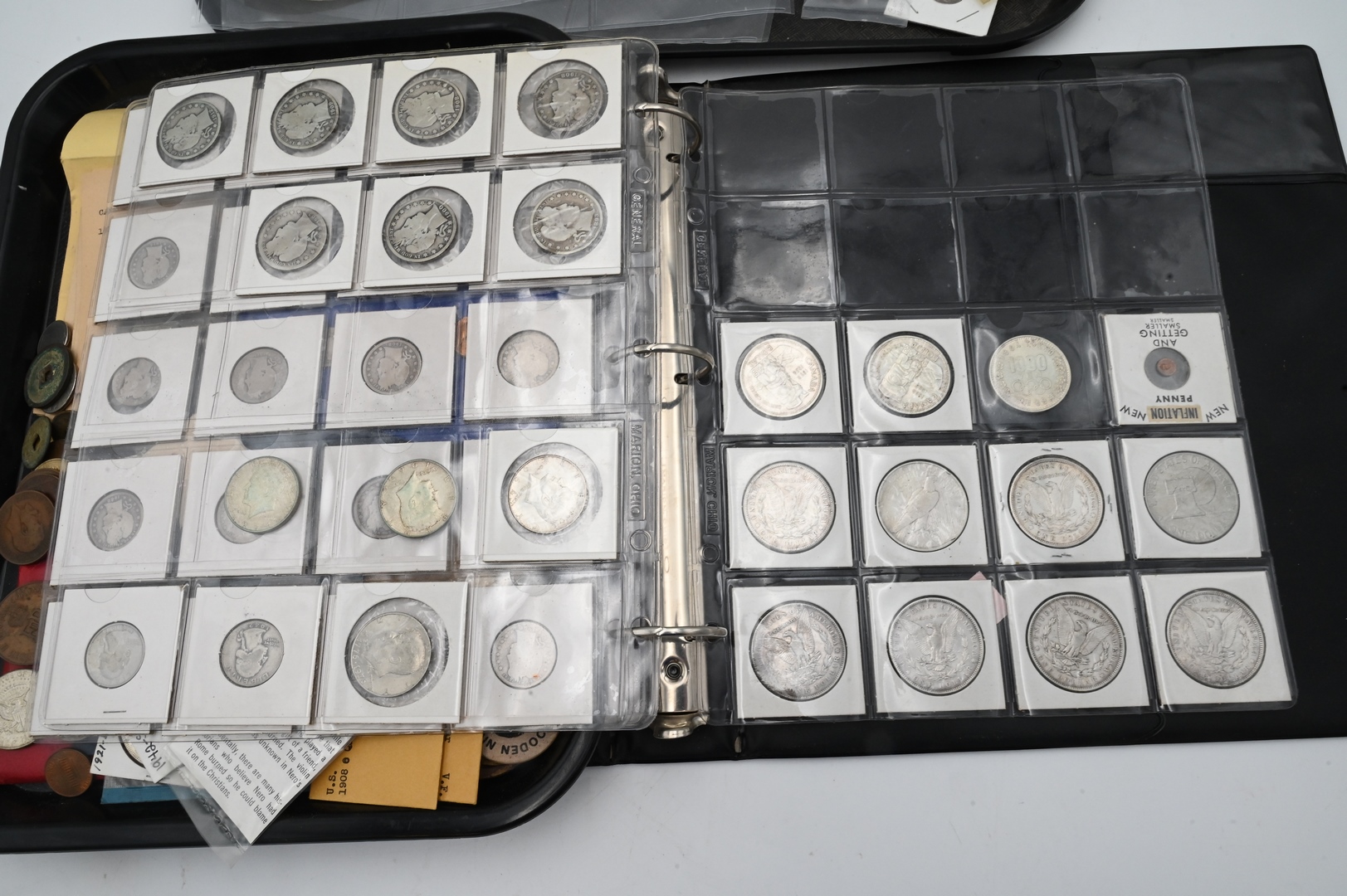 Silver Coin Lot, to include eight silver dollars; approximately $25 face value silver dimes; three nickels; quarters; half dollars and dollars; paper money; along with pennies, etc.