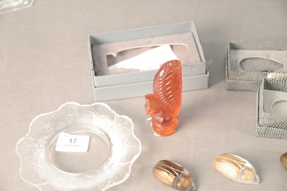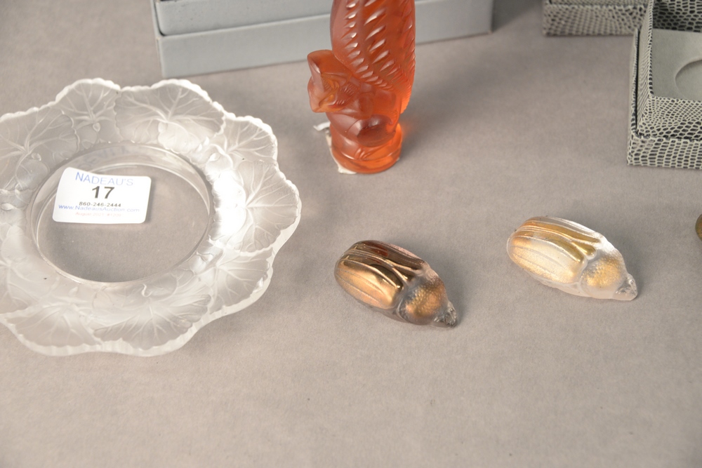 Lot 17: Six Piece Group of Lalique Art Glass, to include three colored glass beetles; one amber frosted glass squirrel; along with two small…