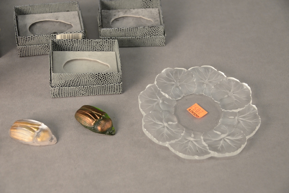 Six Piece Group of Lalique Art Glass, to include three colored glass beetles; one amber frosted glass squirrel; along with two small plates, both having leaf motif rim, squirrel height 4 1/4″, plate diameter 5 1/2″.