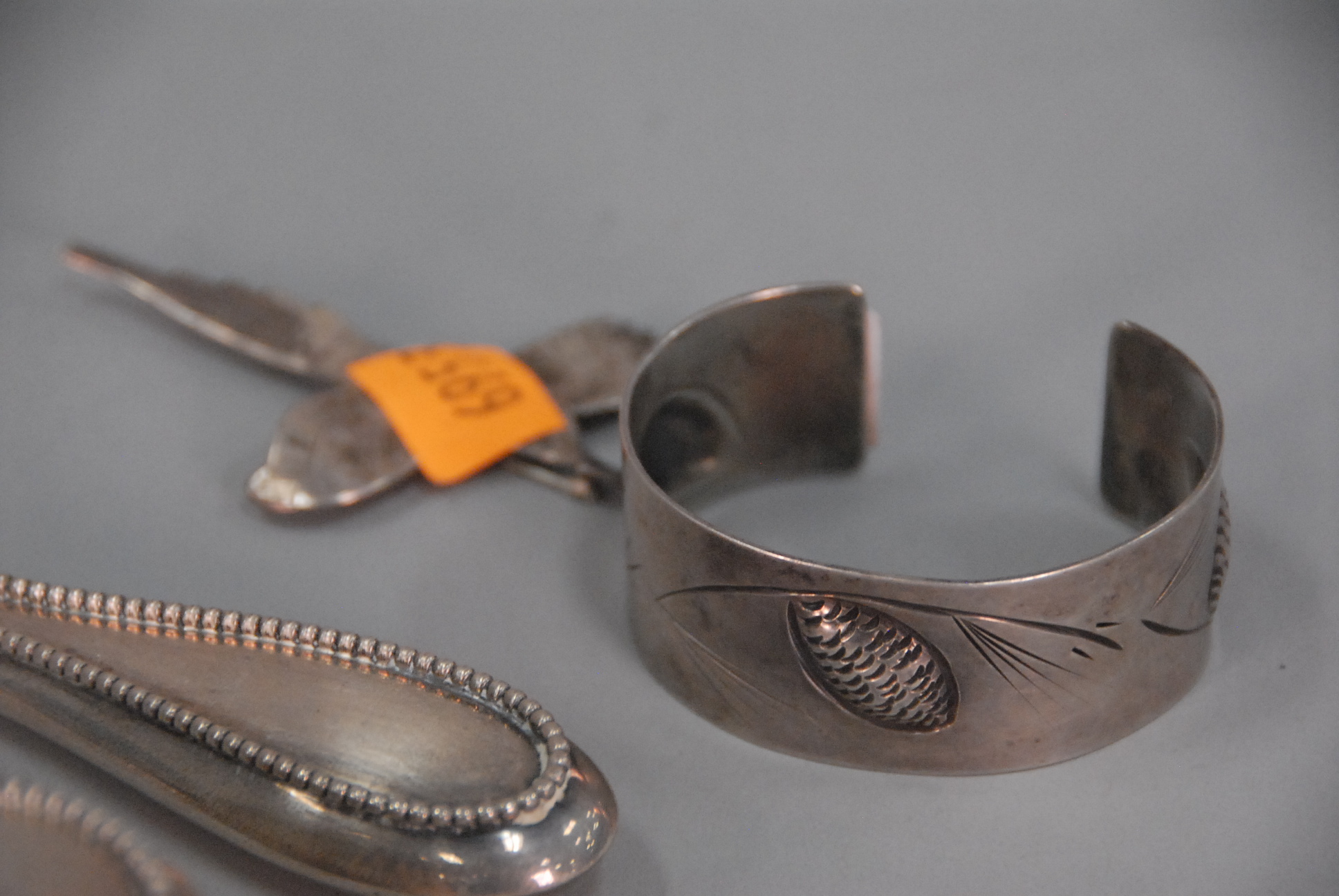 Lot 17: Sterling silver lot to include sterling bracelet signed 1.2 t oz., sterling pheasant pin signed J. Cadbury, sterling brush and mirro…