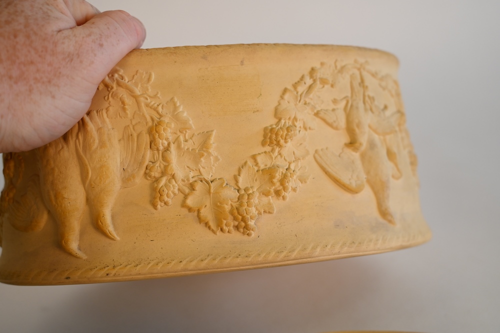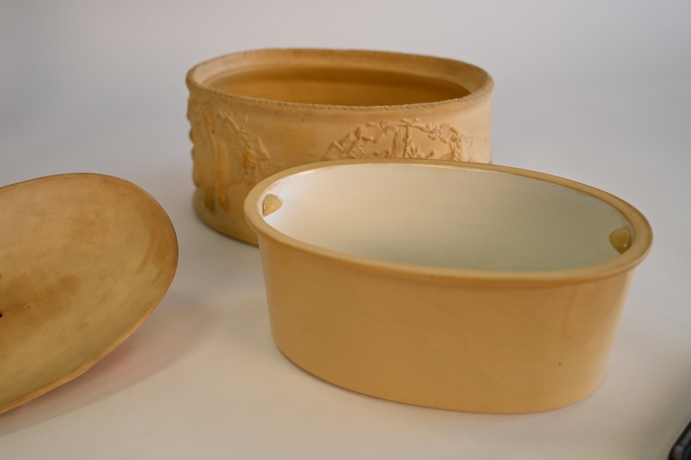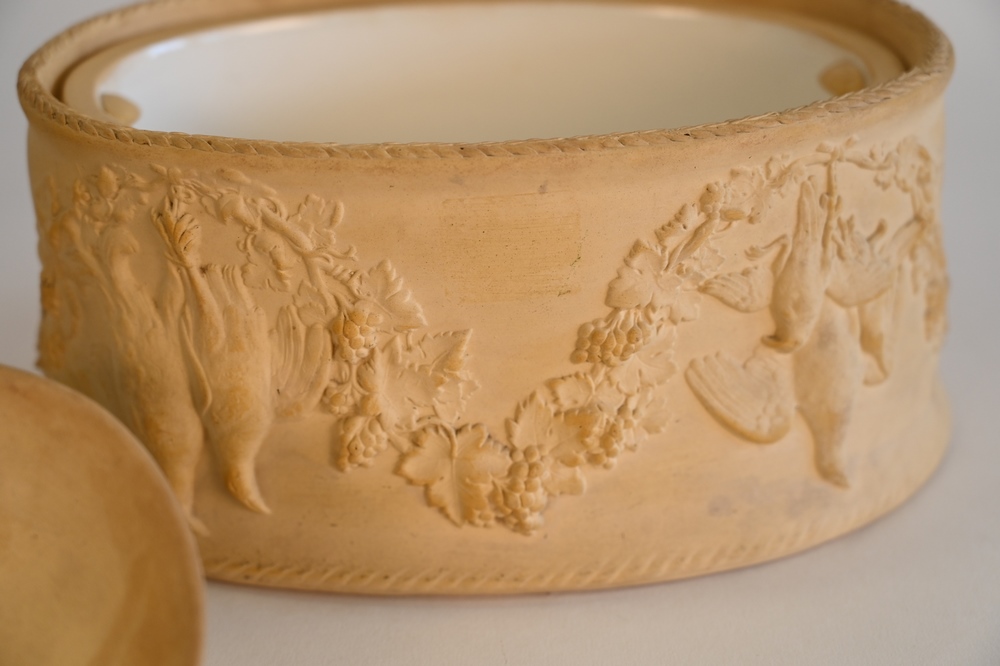 Lot 17: Stoneware Lidded Game Pie Dish, having liner and wildgame relief throughout, not marked, length 10 1/2 inches, height 7 inches.