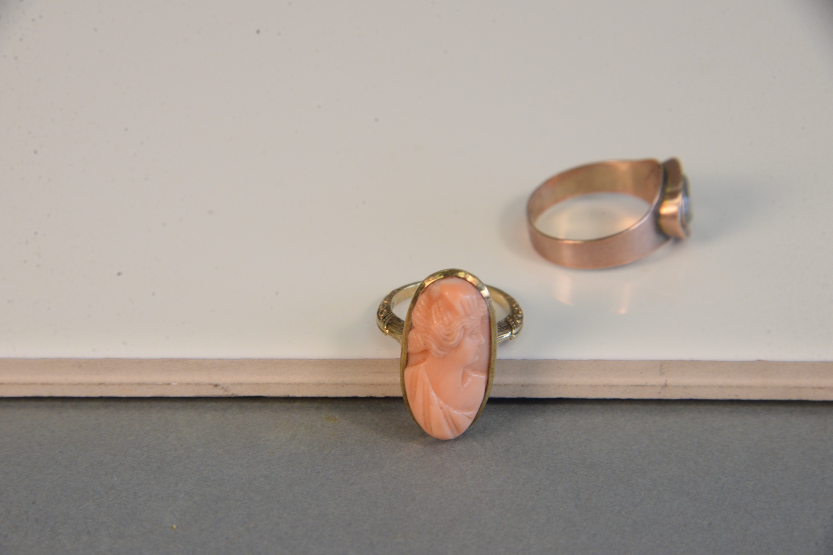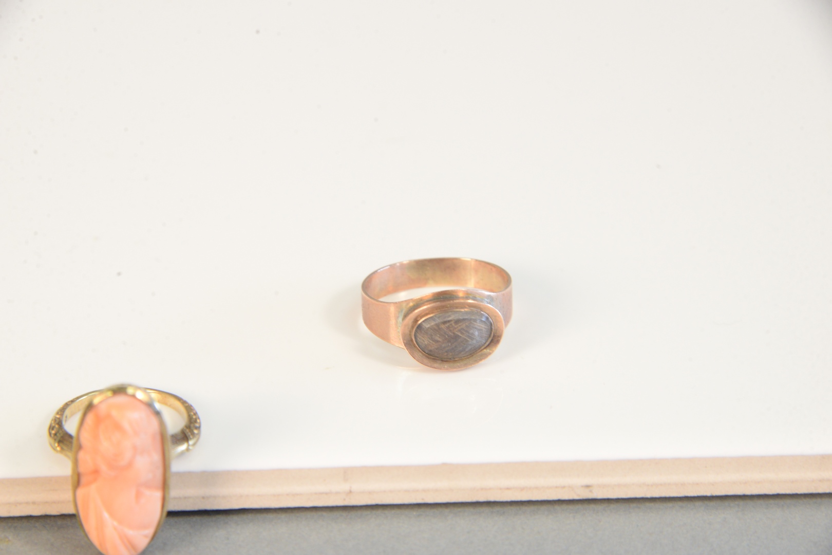 Lot 17: Three Victorian Rings to include one 14 karat cameo of coral, one mounted with hair and one woven with small gold plaque sizes 4 1/…