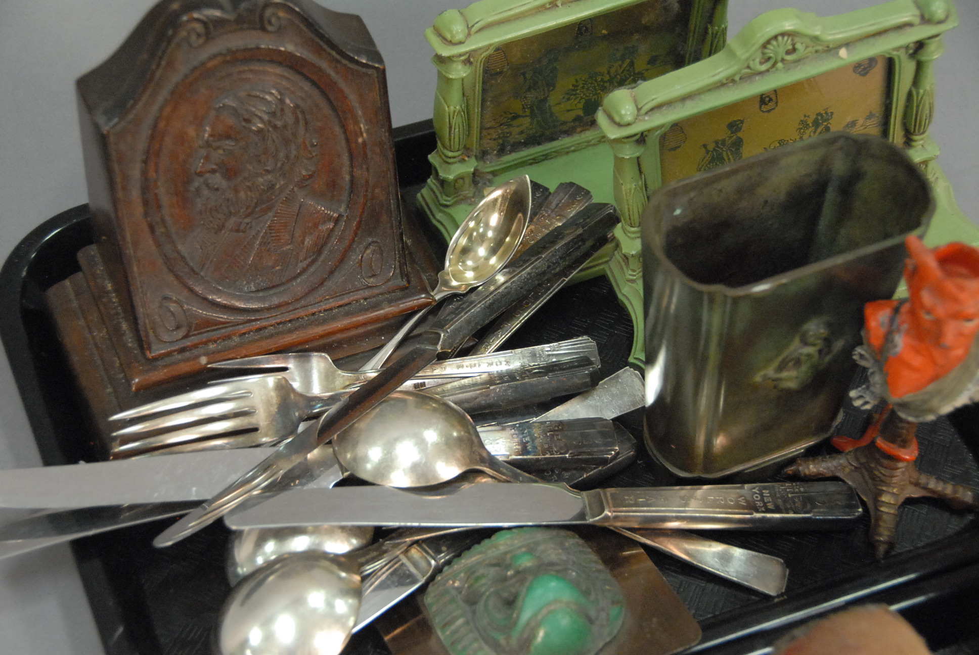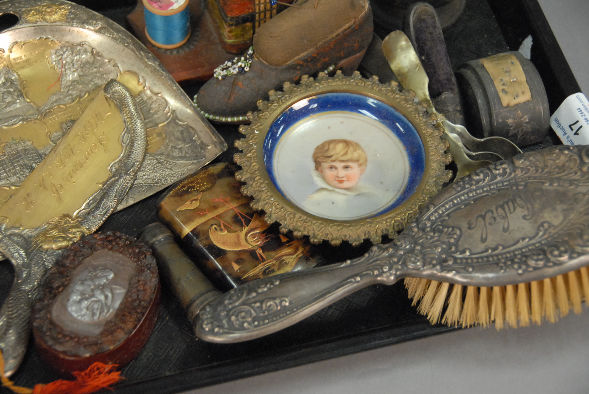 Lot 17: Two box lots of miscellaneous items including sterling dresser brush, World’s Fair items, pin cushions, book ends, bronze vase, etc.