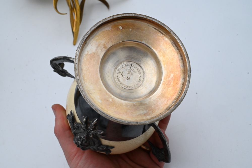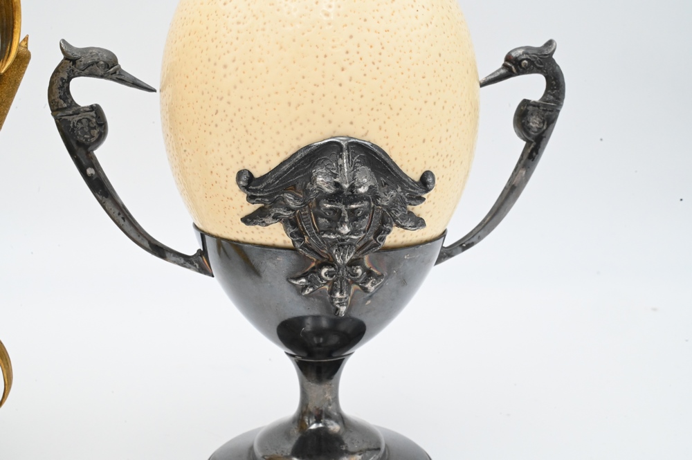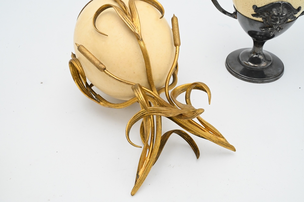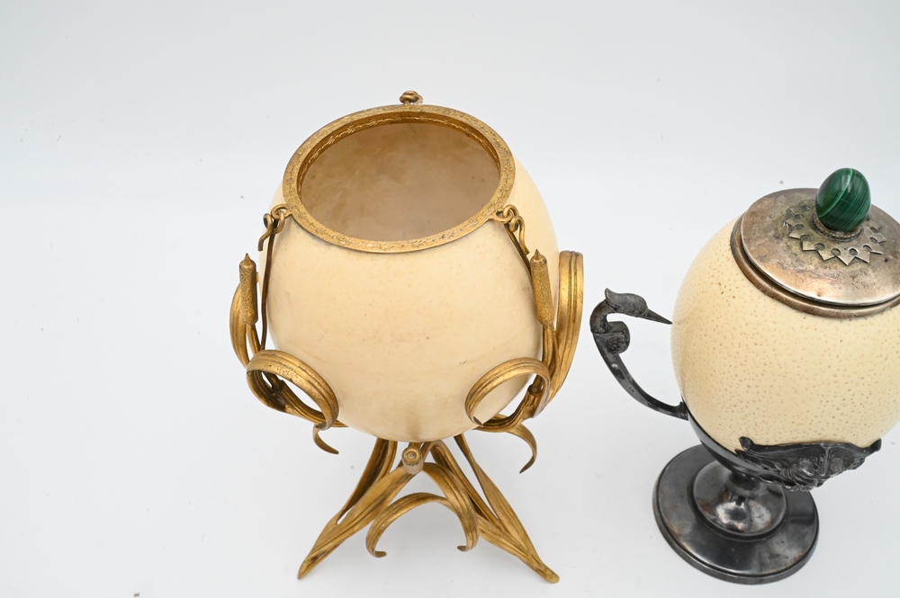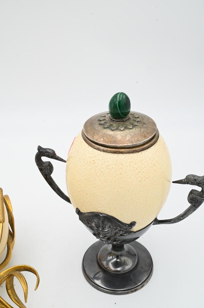 Two Ostrich Egg Table Ornaments, to include a Anthony Redmill silverplate mounted egg having malachite finial; along with a French egg mounted on scrolling cattails; tallest 9 inches.