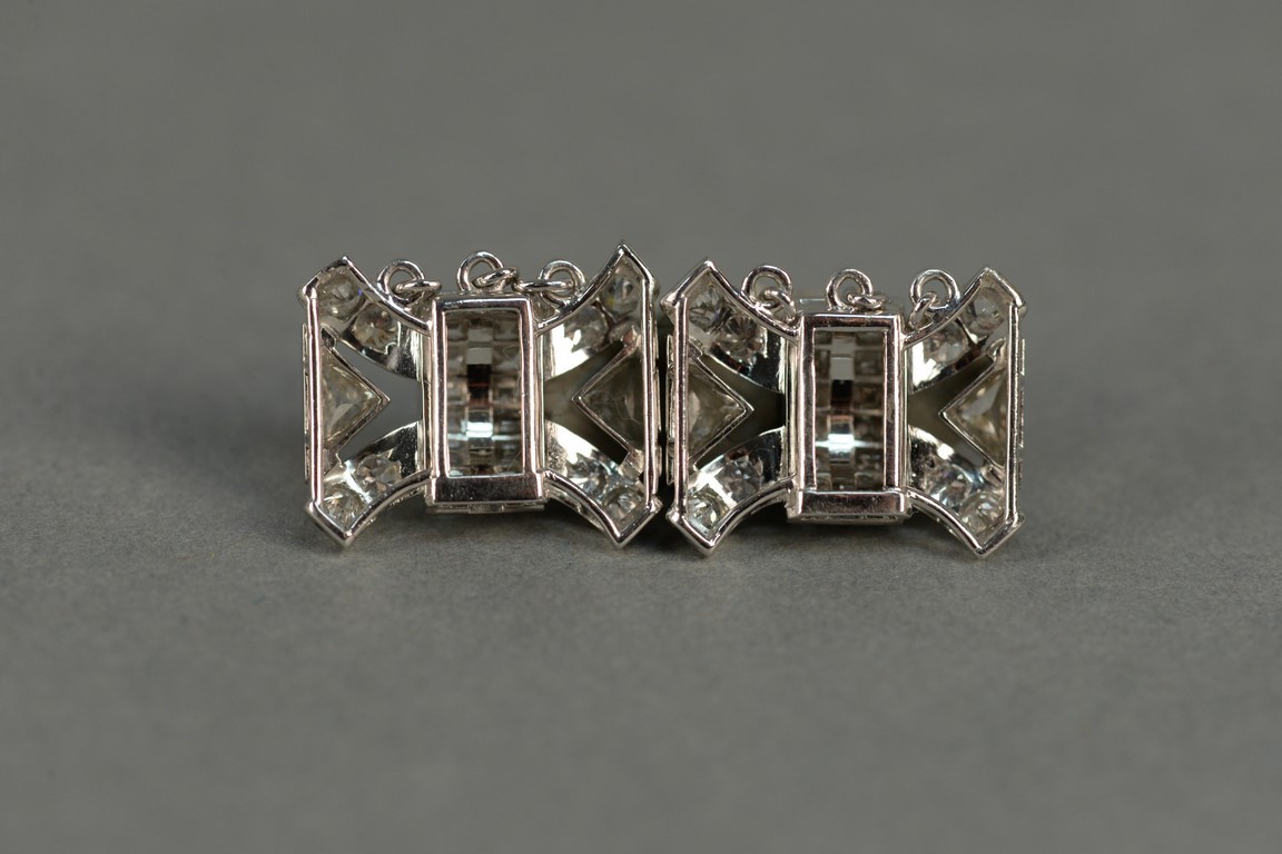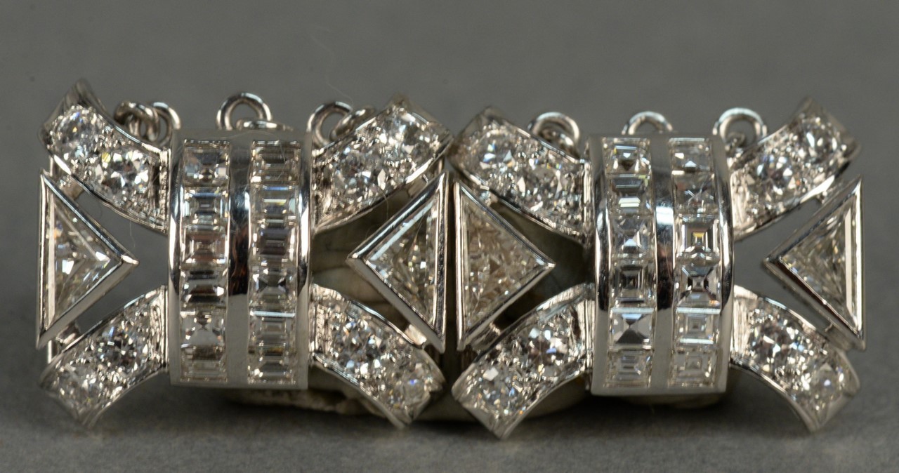 Lot 17: Two platinum and diamond clasps of rectangular form set with a combined total of sixteen full cut diamonds, four trillion cut diamon…