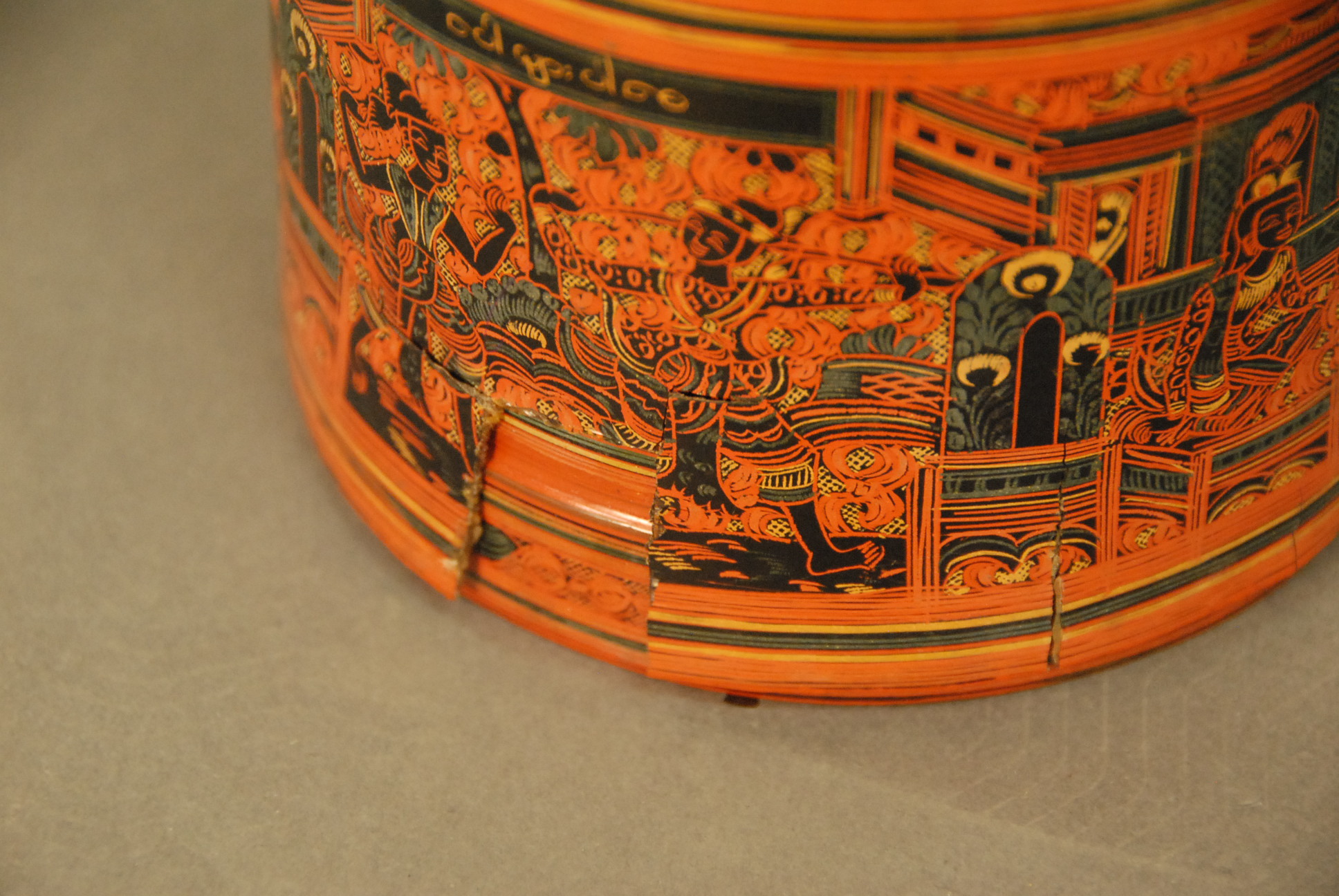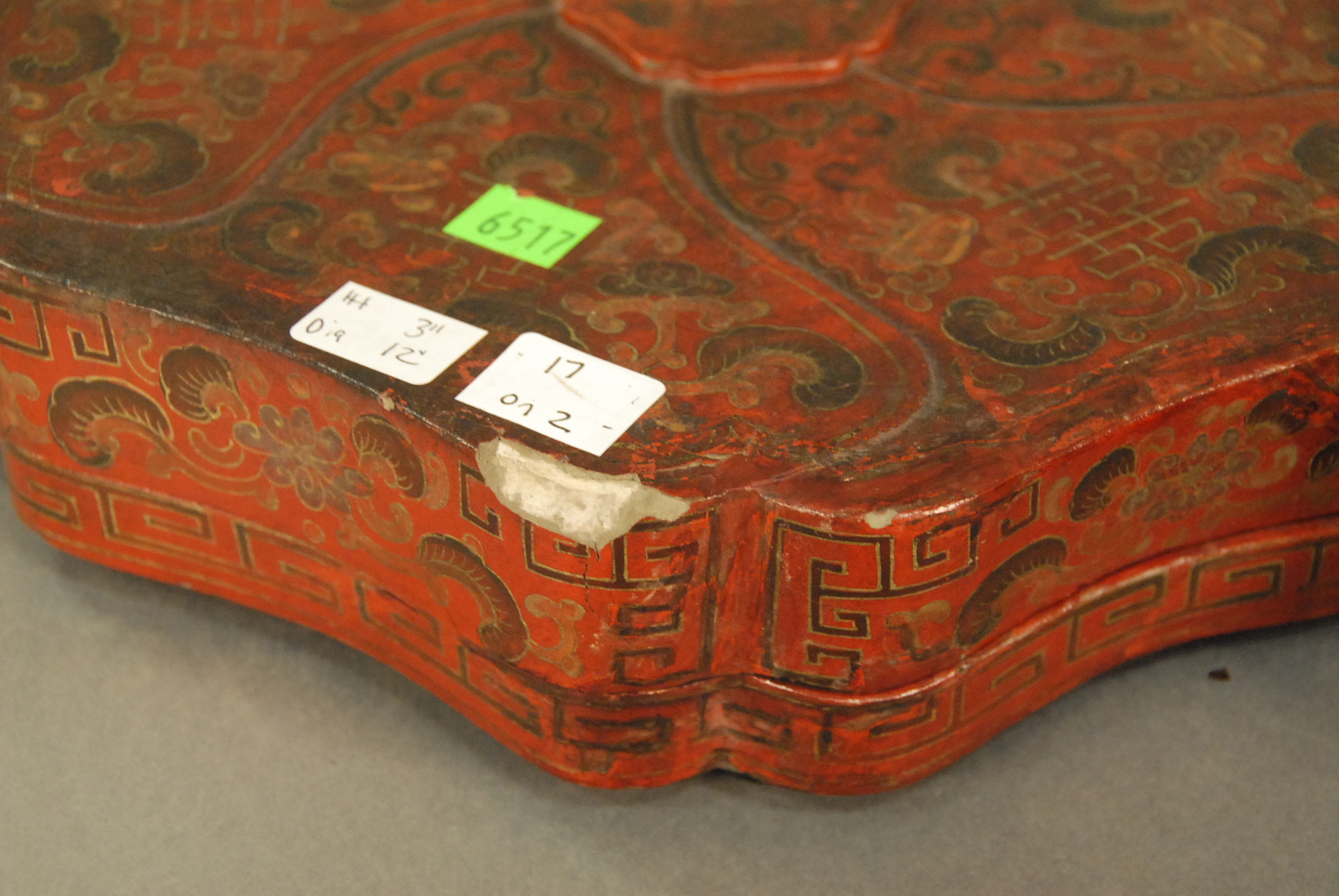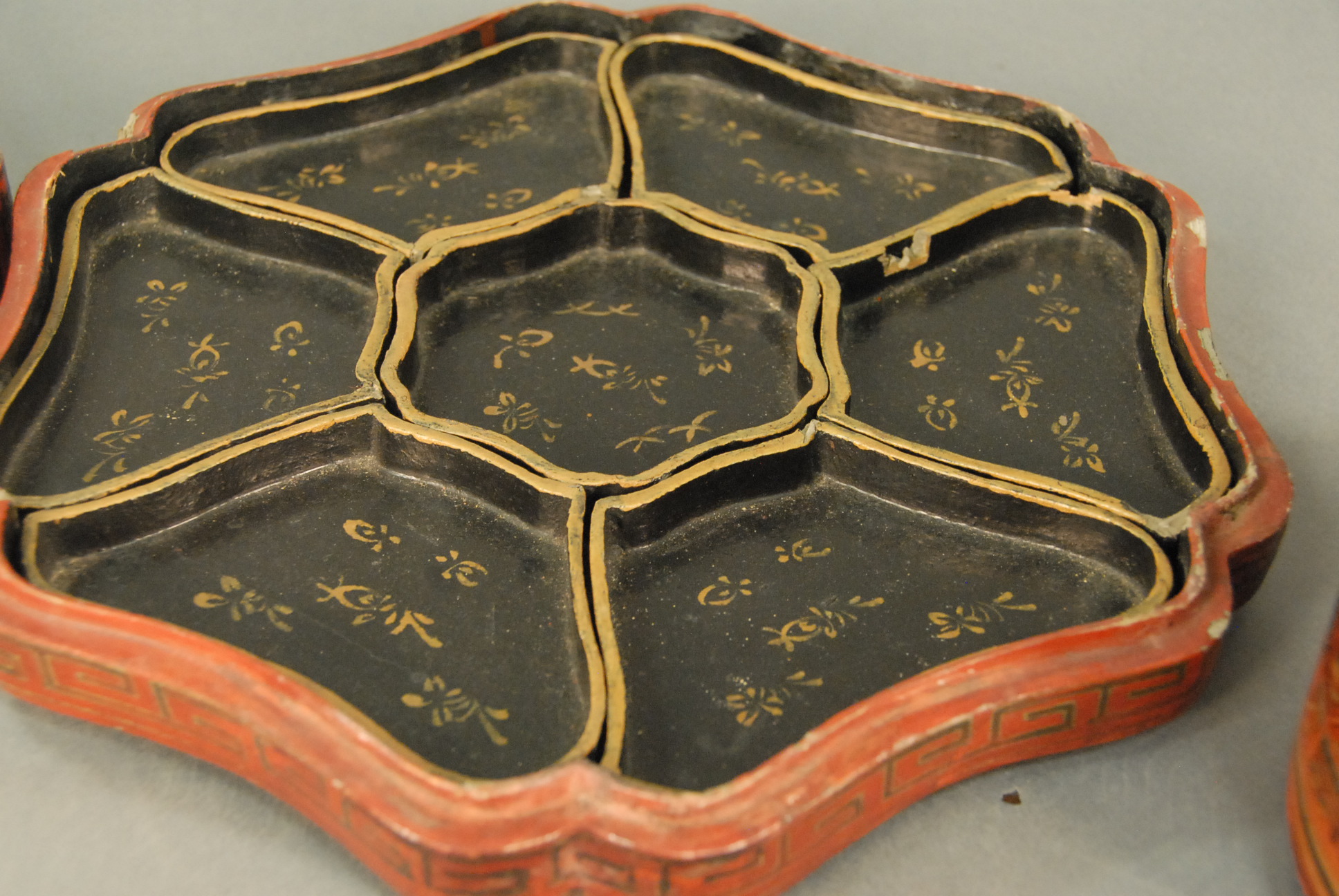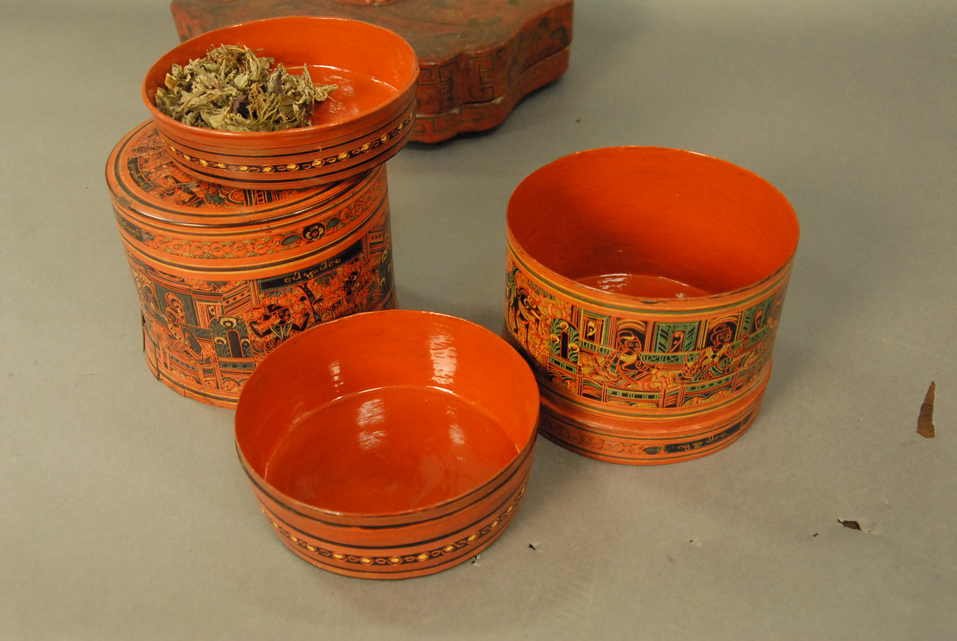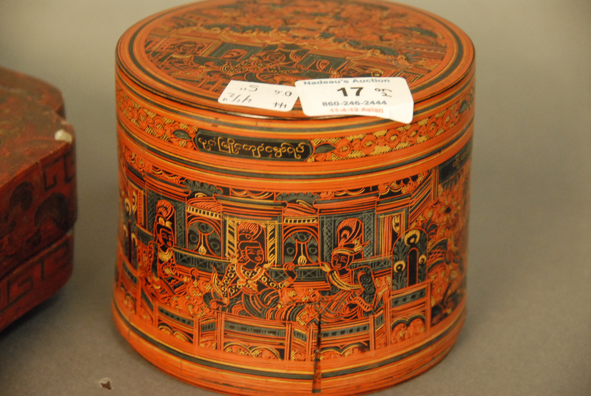 Two red lacquered boxes, seven section covered box with black removable tray section ht. 3in. dia. 12in. and picnic box with lacquered painting, Myanmar Burma ht. 4 1/2in. dia. 5in.
