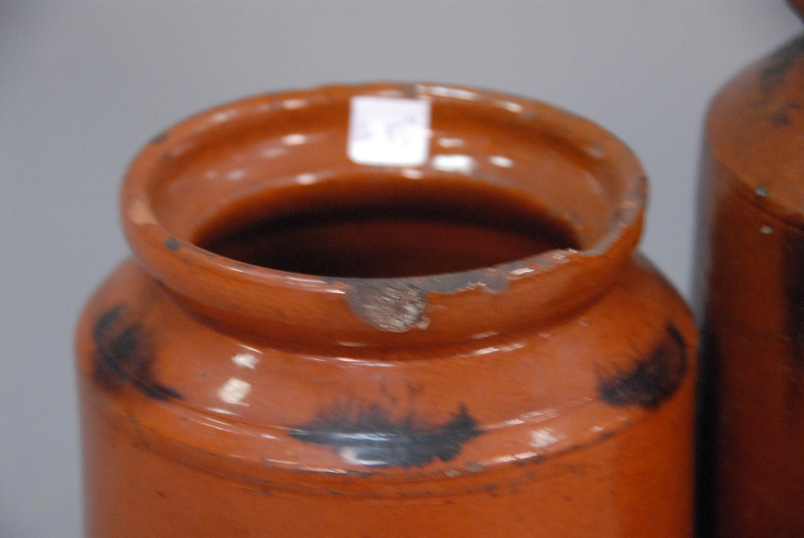 Two redware crocks with manganese decoration rim chips. ht. 9in. and 10 1/2in. Being sold to benefit a Connecticut Museum.