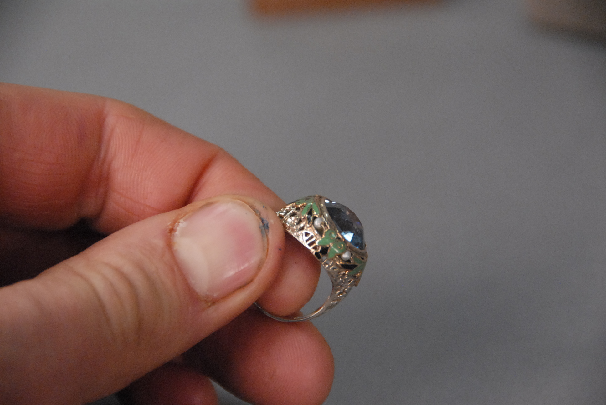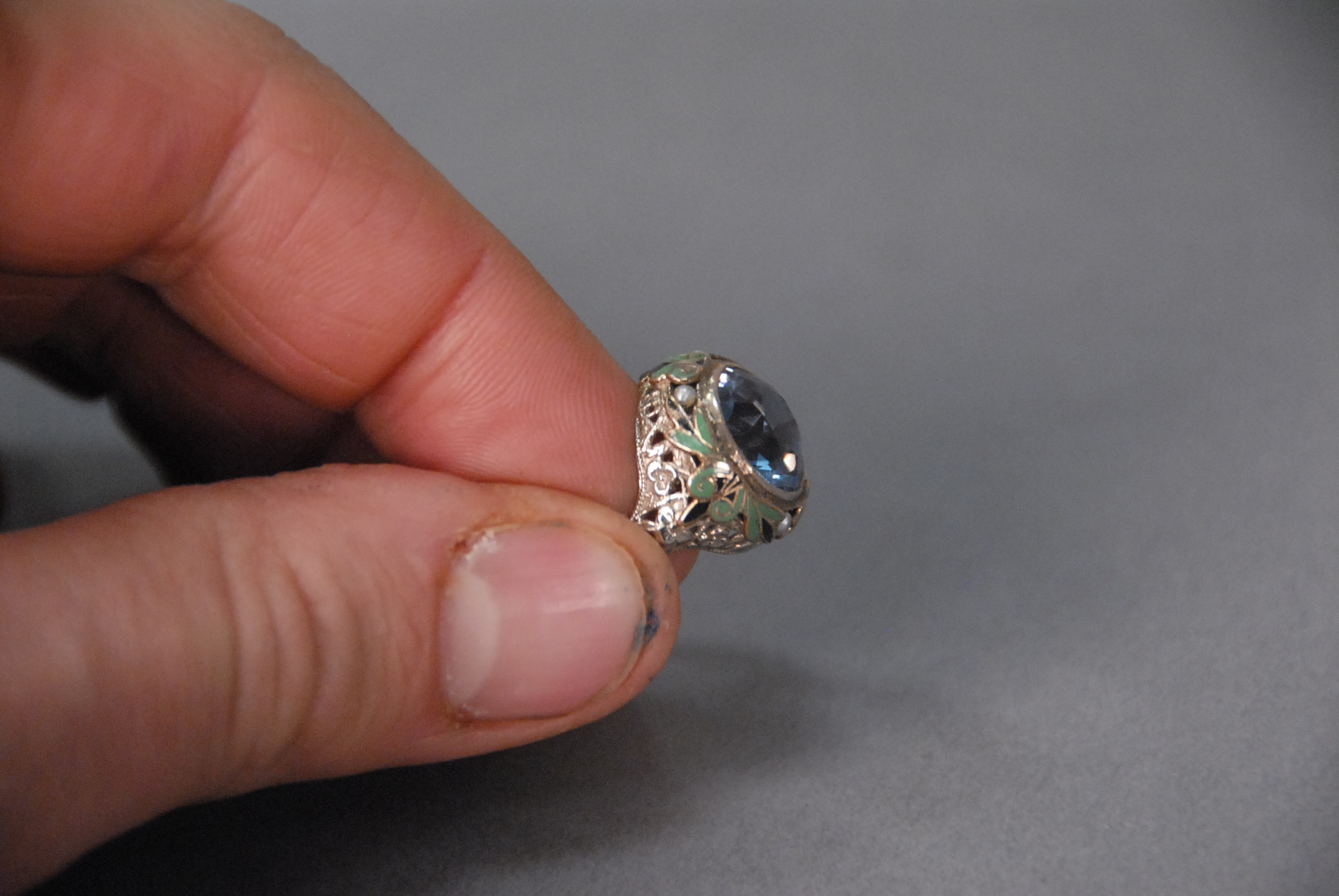 Lot 17: White gold enameled ring with stone, 4.8 grams.
