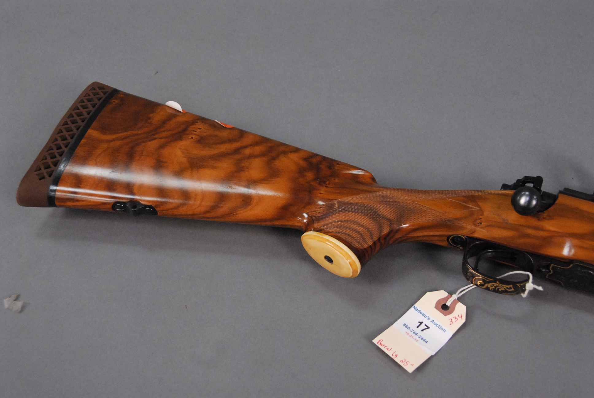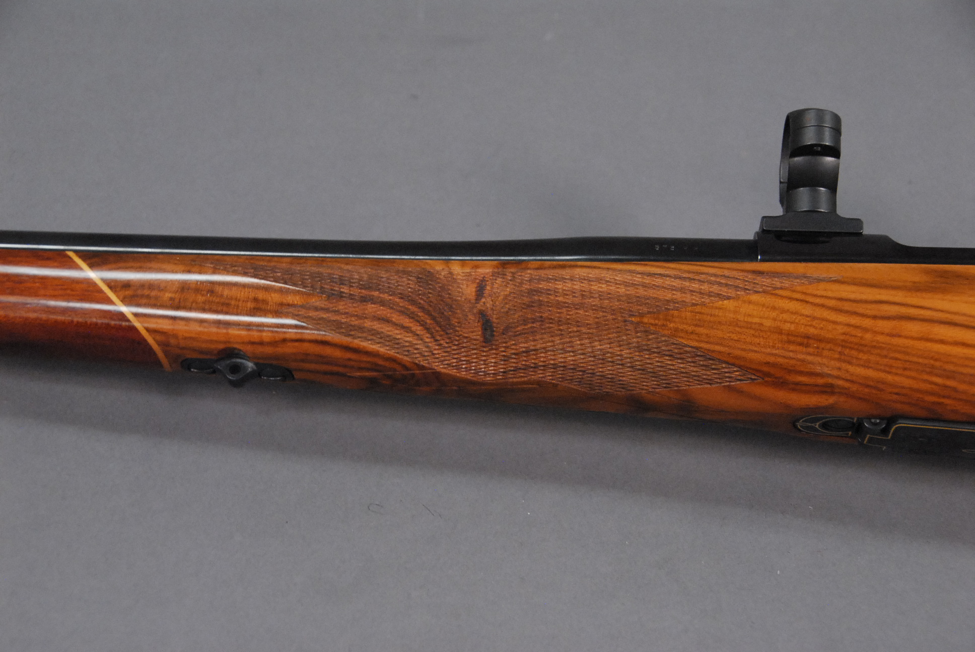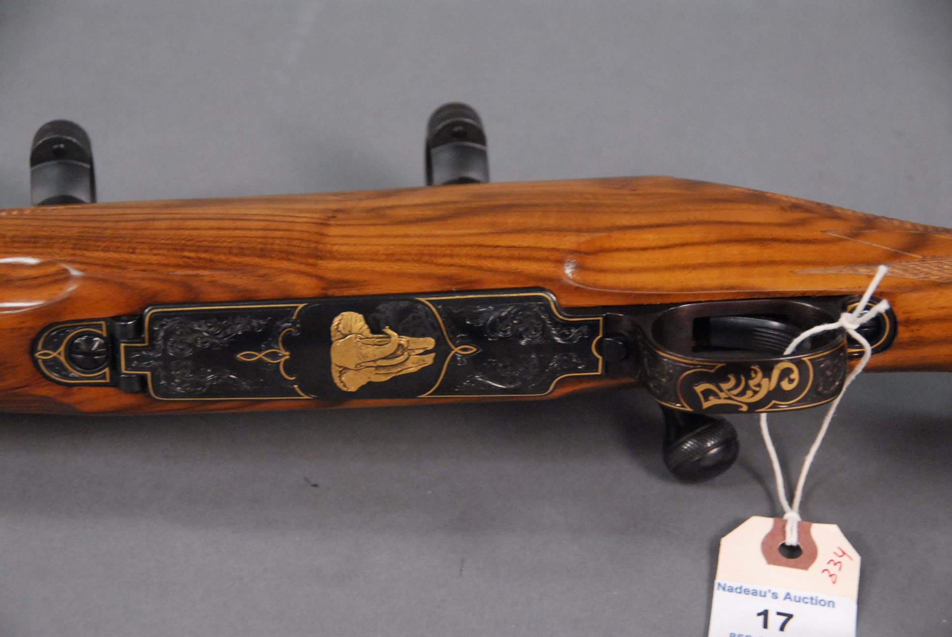 Lot 17: Winchester, model 70, 375 bolt action rifle with quality engraving and gold inlay having a high relief inlay of an elephant on the f…