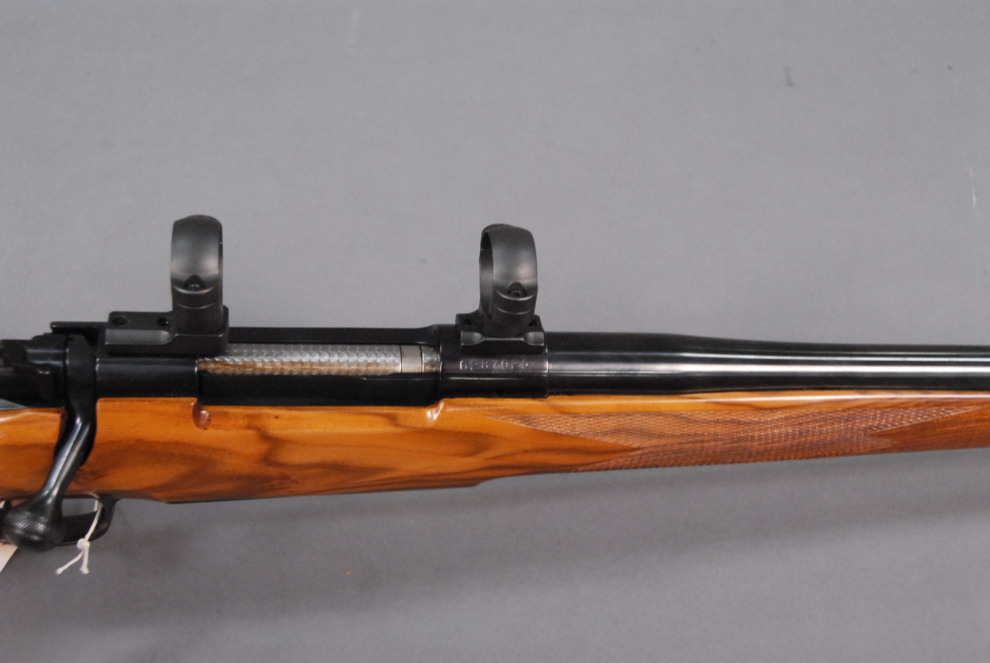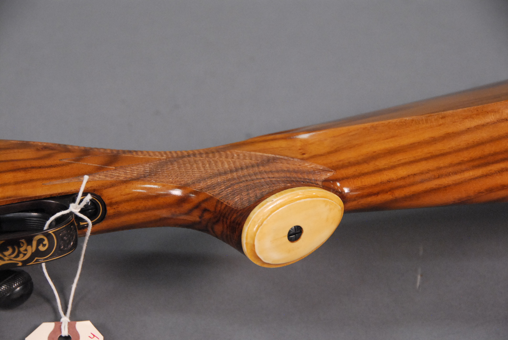 Winchester, model 70, 375 bolt action rifle with quality engraving and gold inlay having a high relief inlay of an elephant on the floor plate also having an ivory grip cap, custom stock with exotic wood, barrel lg. 25, G287925 334.