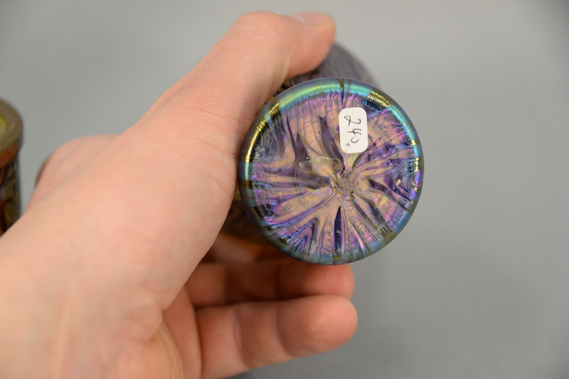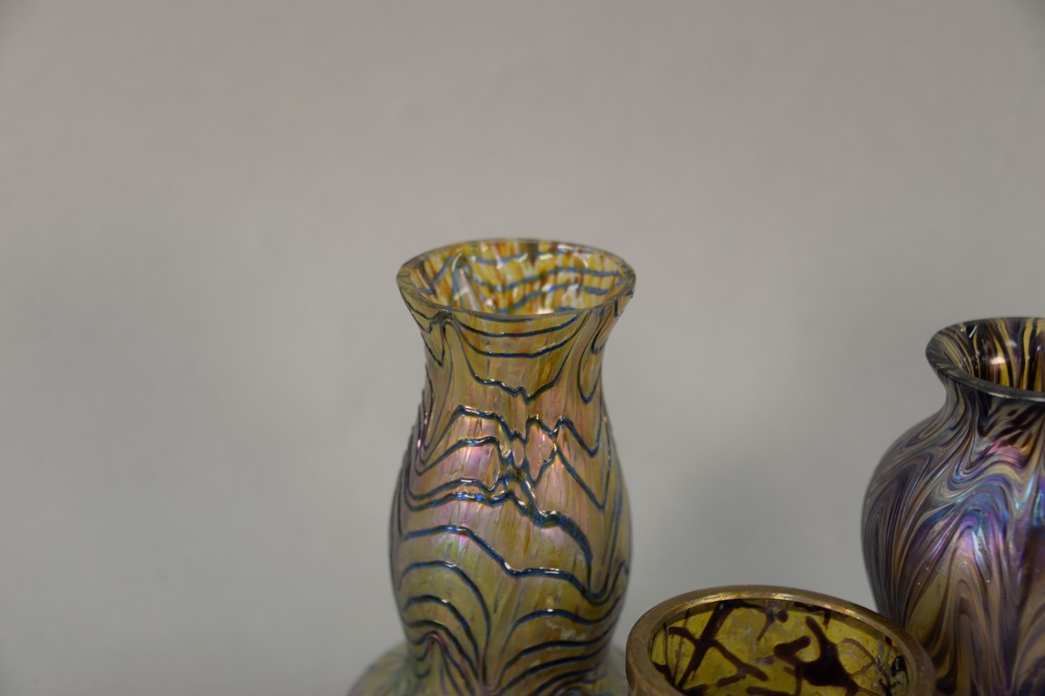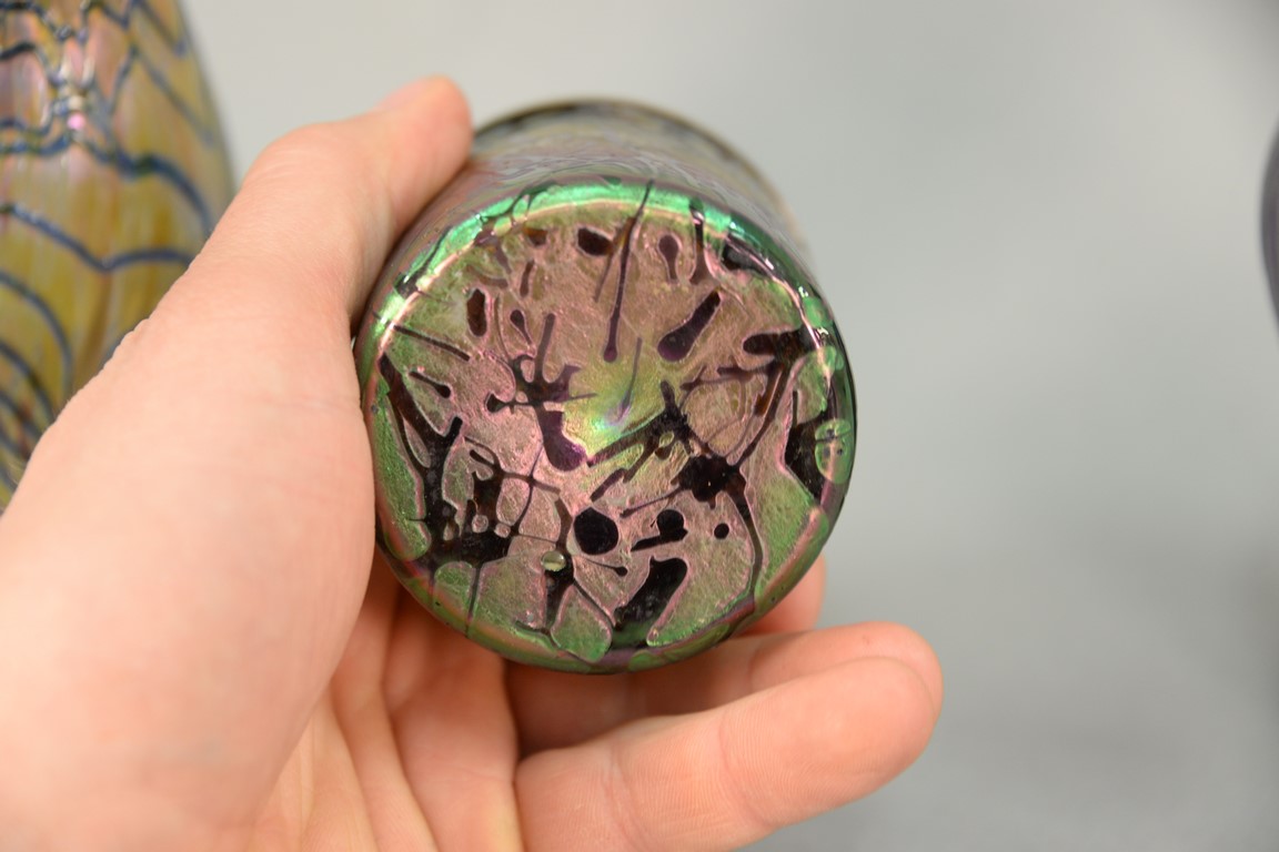 Lot 170: Attributed to Loetz, three art glass iridescent vases including two small vases and a tooth pick holder. ht. 2 3/4in., 5in., & 5 1/2in.