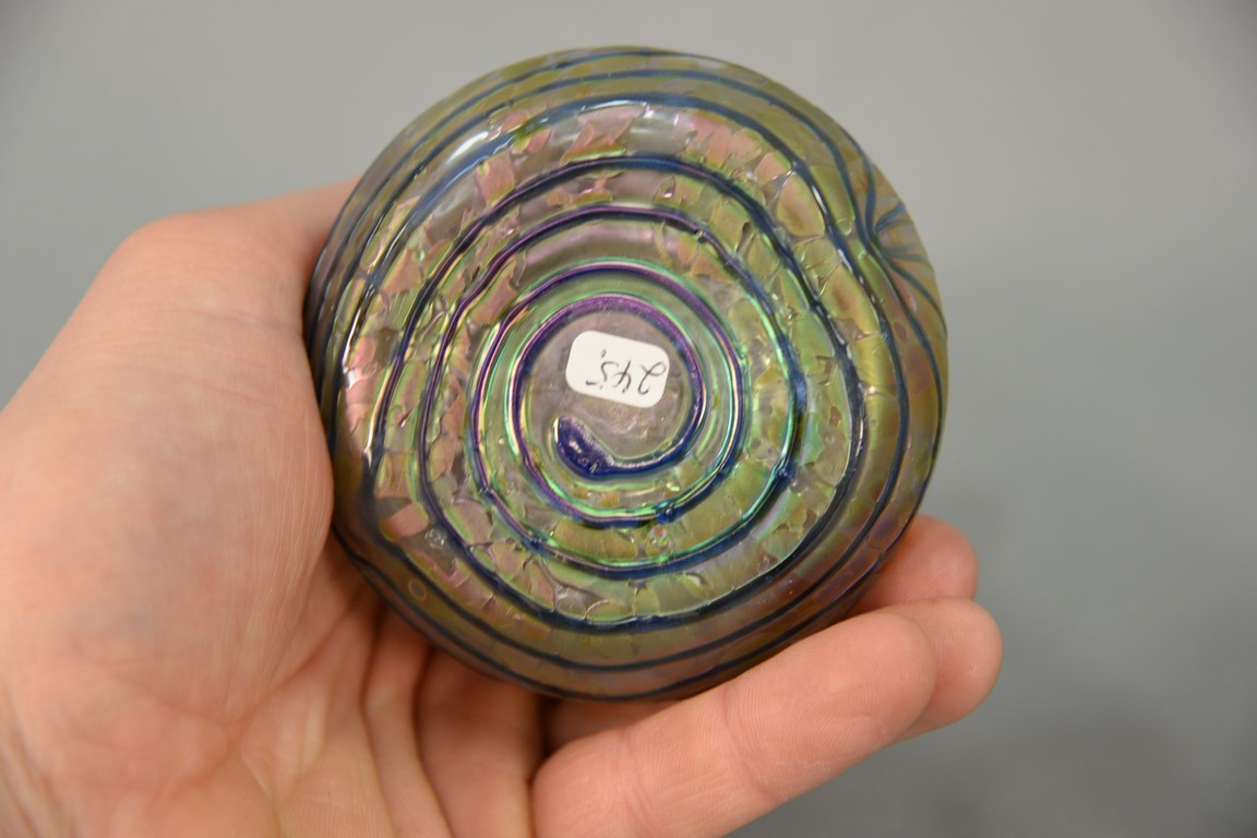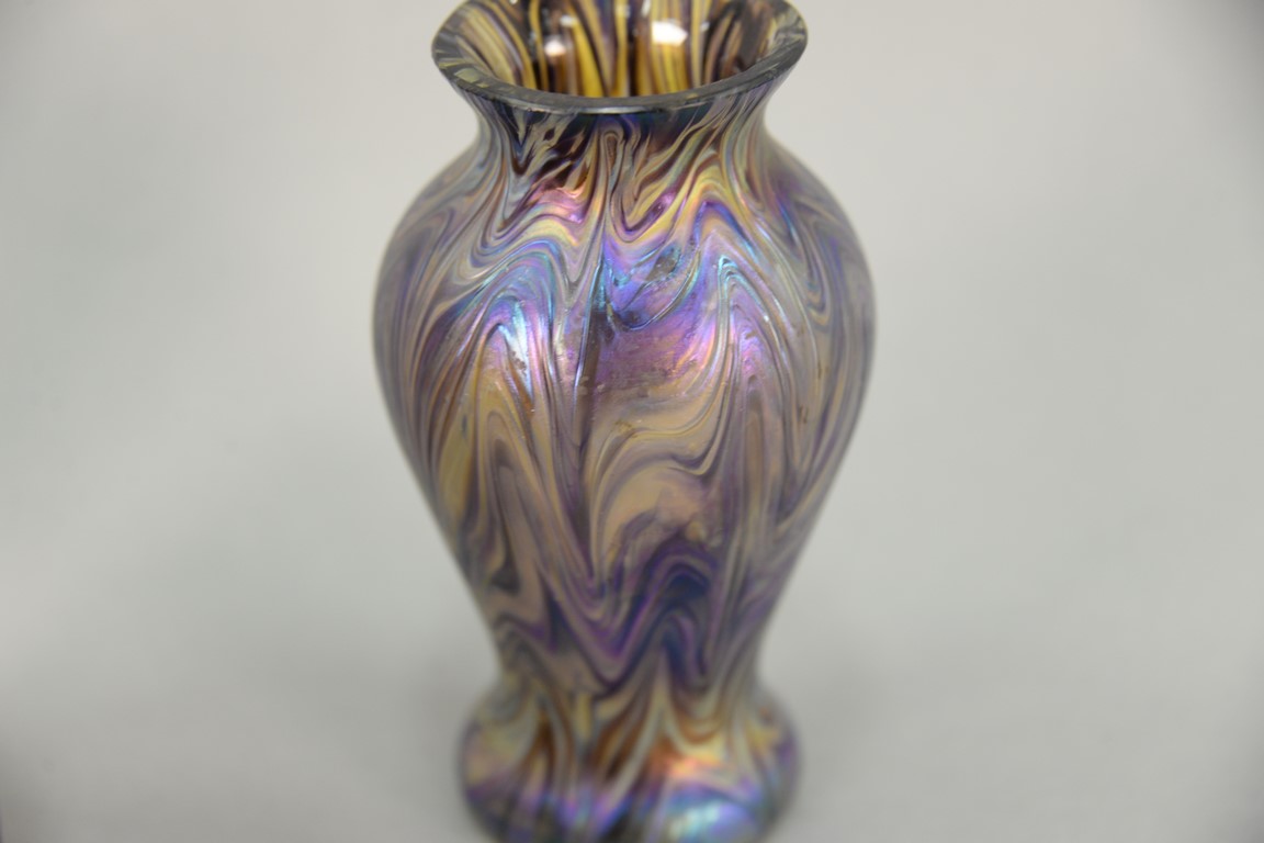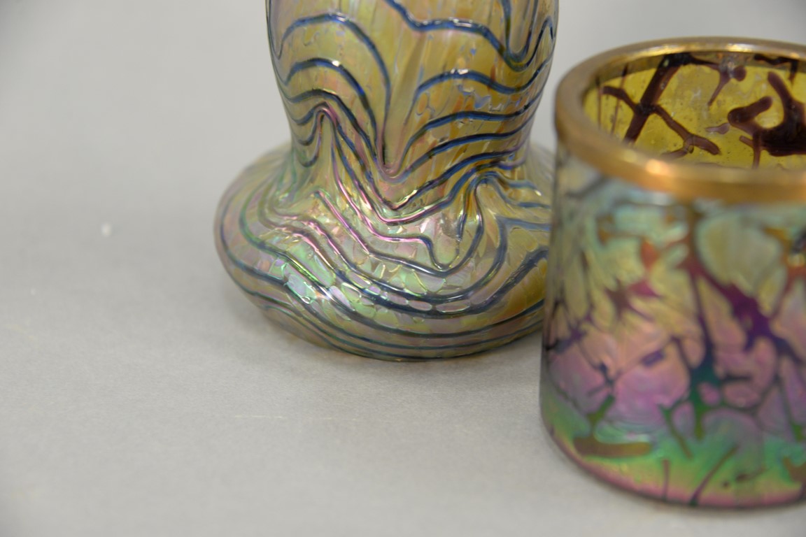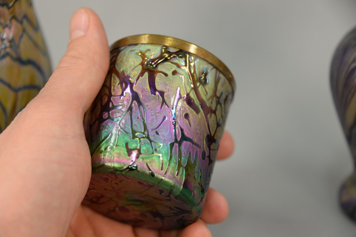 Lot 170: Attributed to Loetz, three art glass iridescent vases including two small vases and a tooth pick holder. ht. 2 3/4in., 5in., & 5 1/2in.