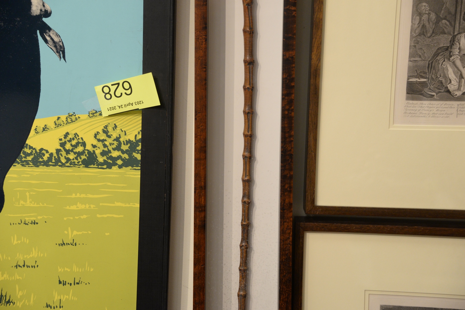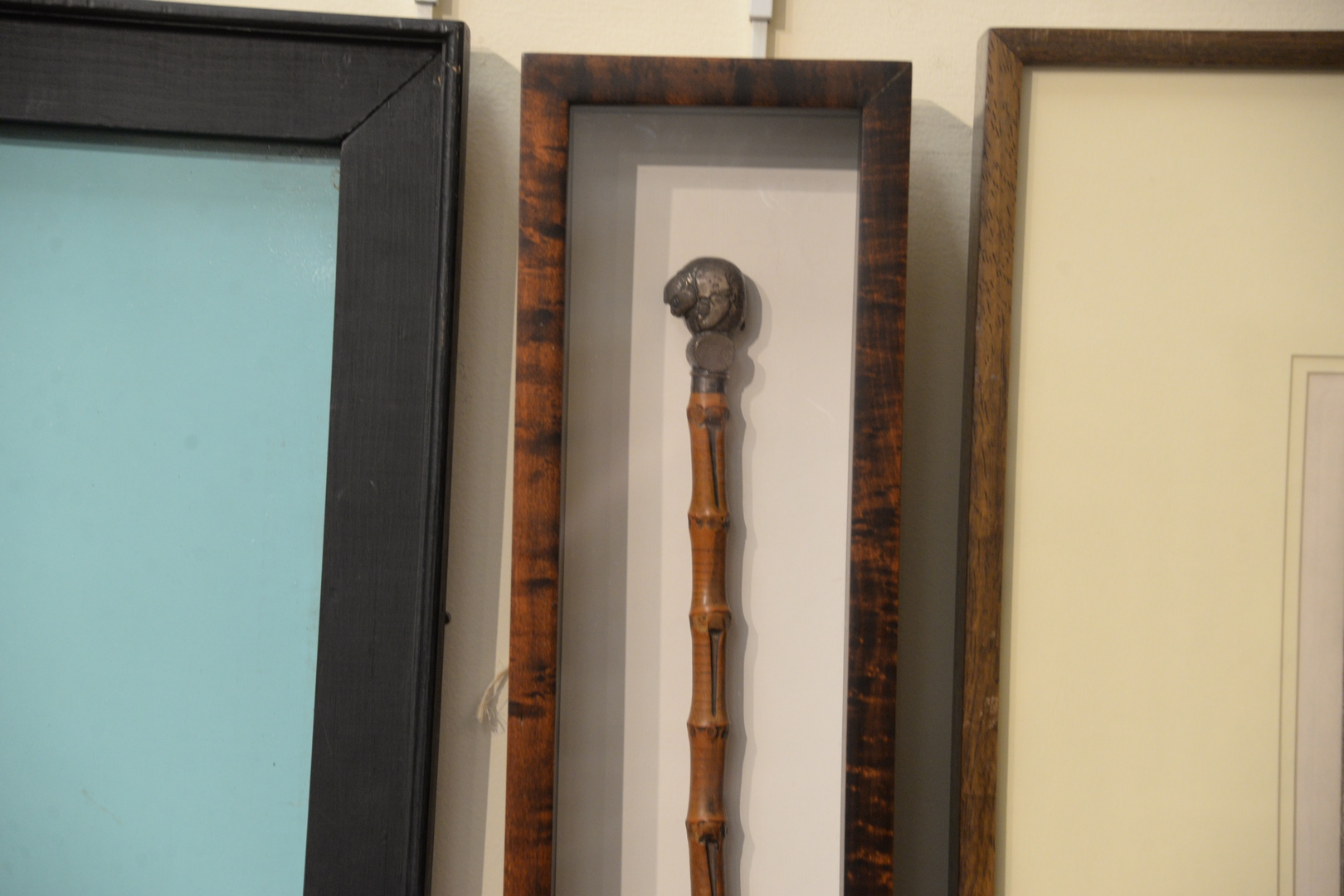 Lot 170: Bamboo Cane, having silver monkey wearing a shirt, sitting on a barrel, in fitted case, length 35 inches.