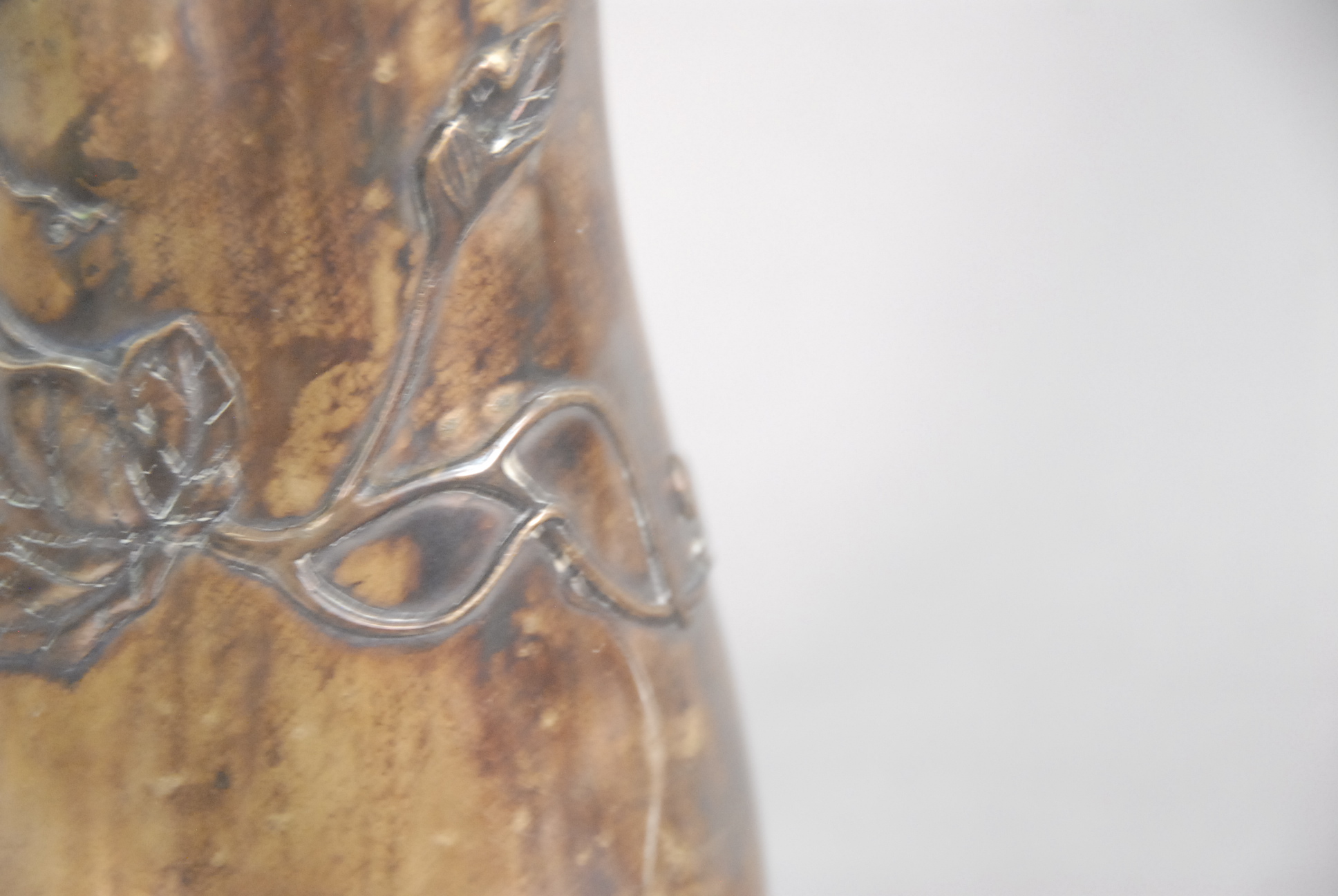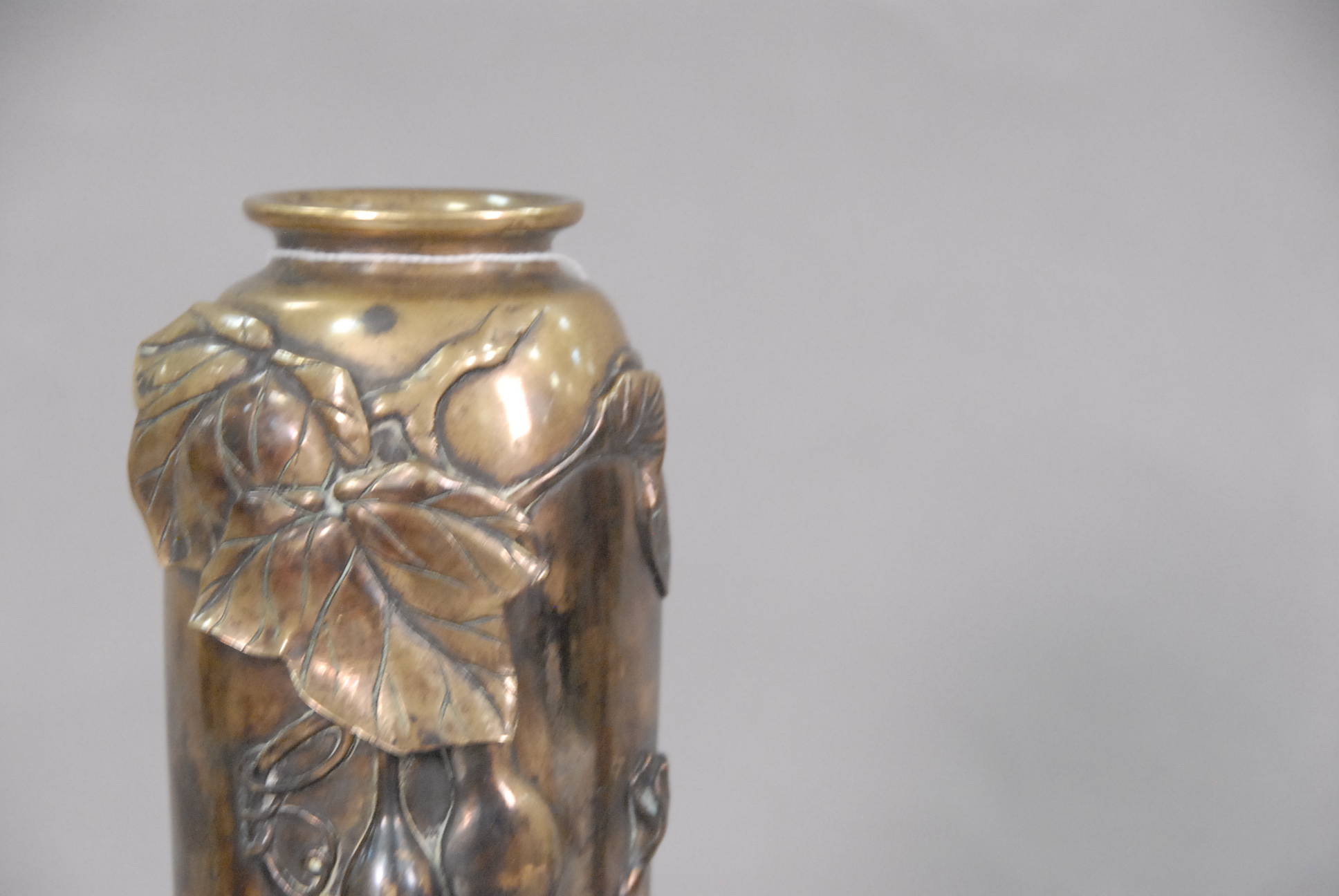 Brass vase with molded vines, leaves, and fruit.
