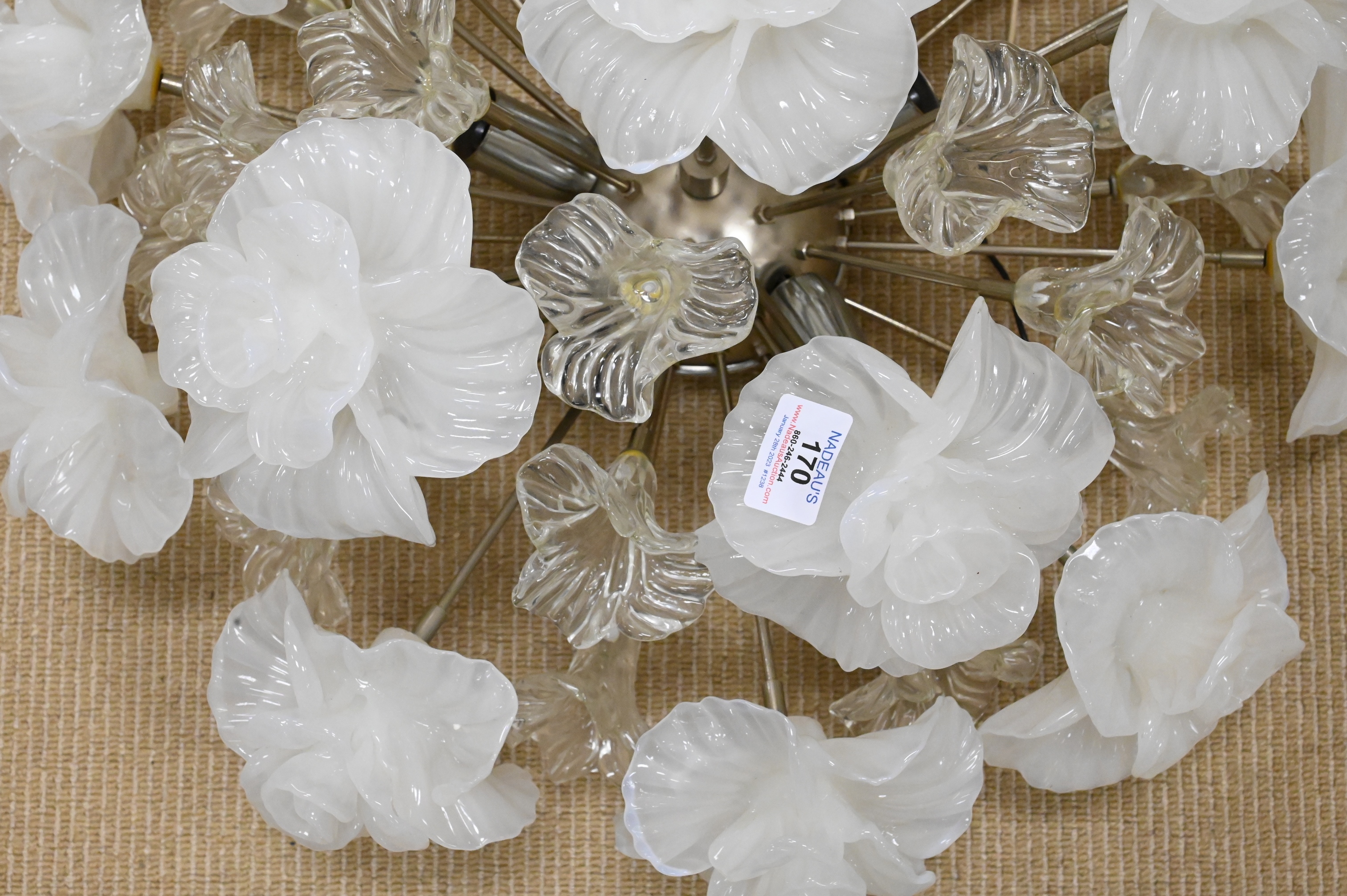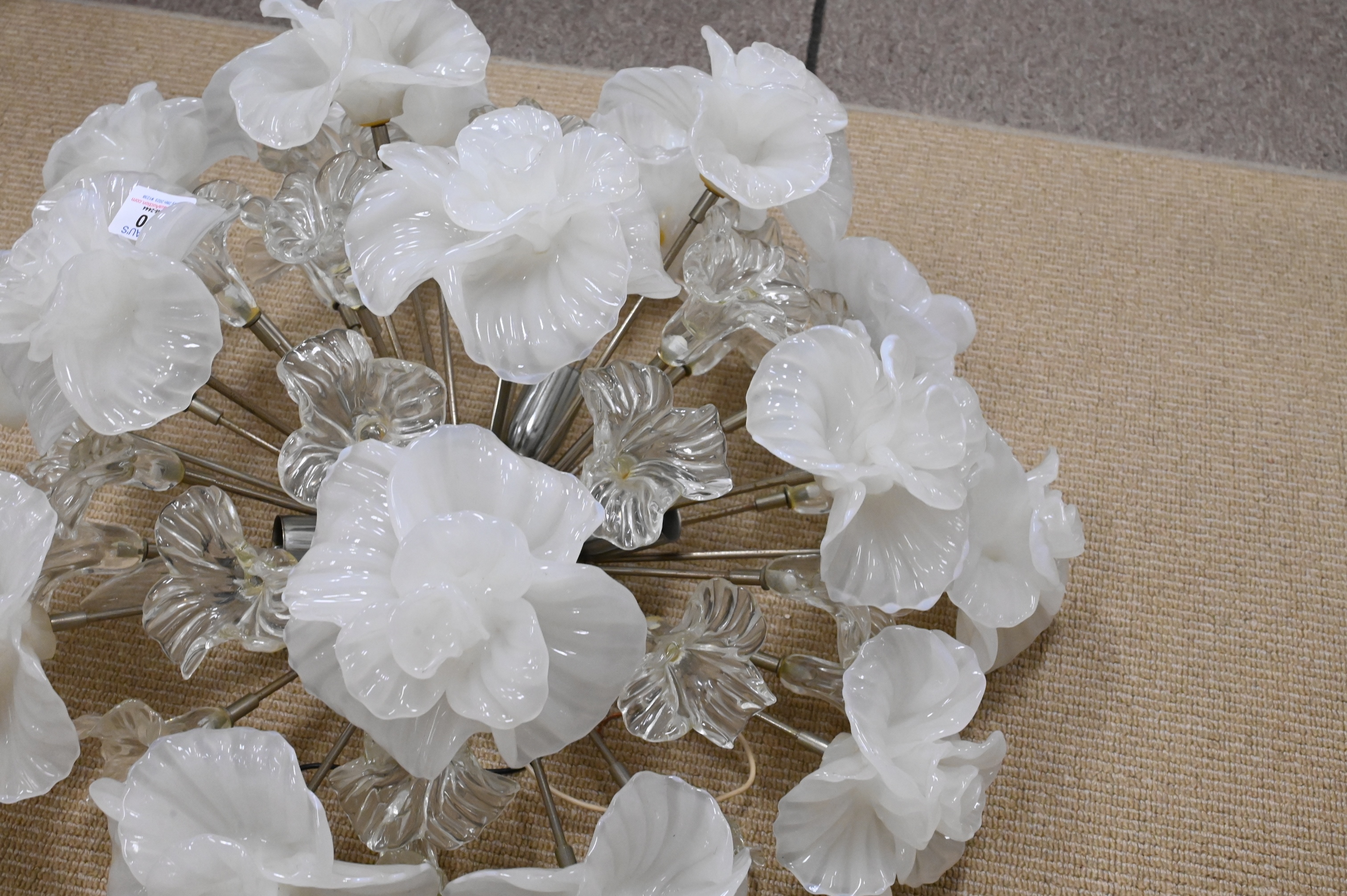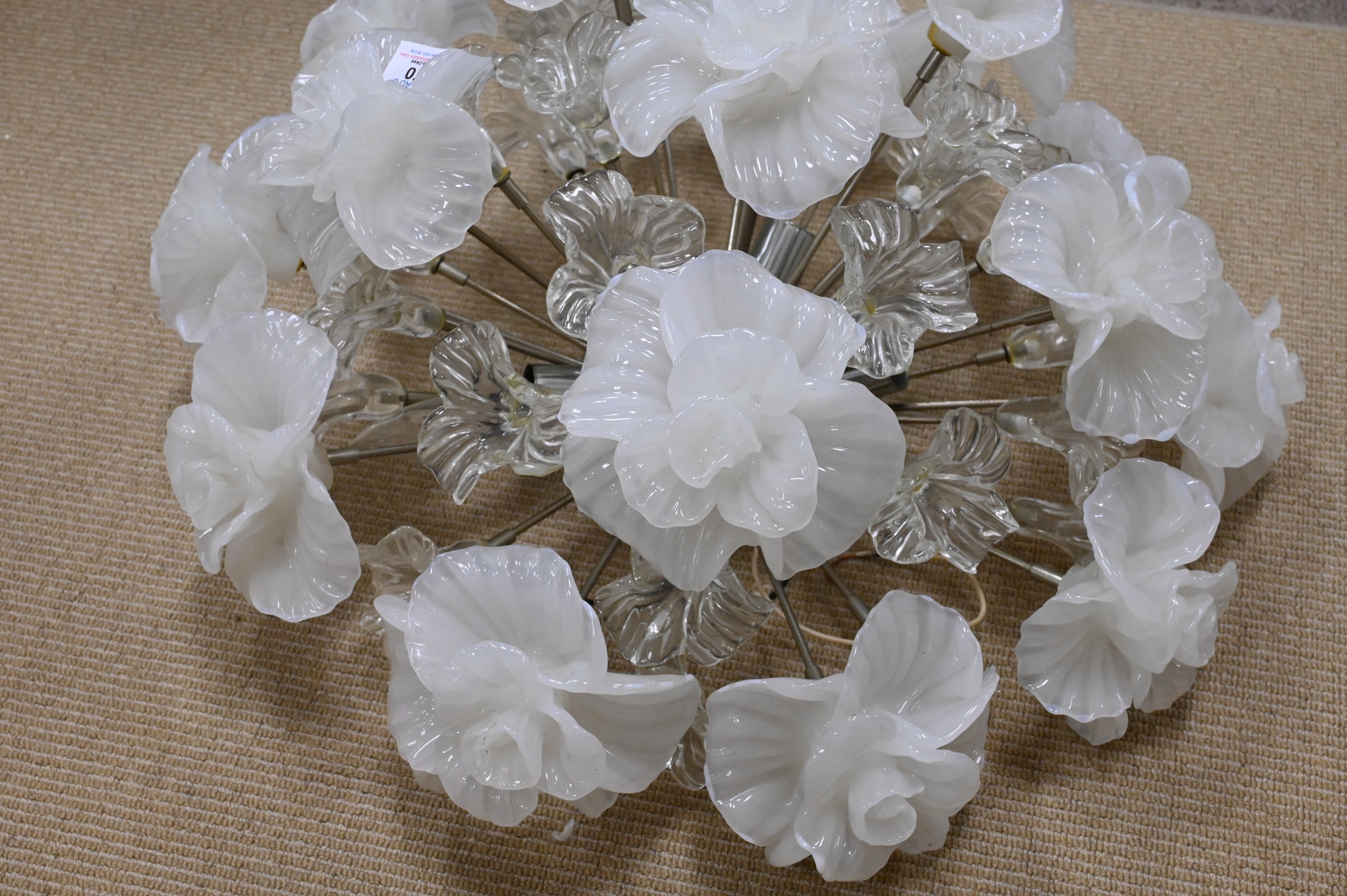 Camer Glass Floral Hanging Light, having white and clear flowers, five light, approximately 50 pounds, height 24 inches, diameter 24 inches.
