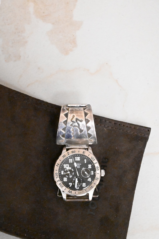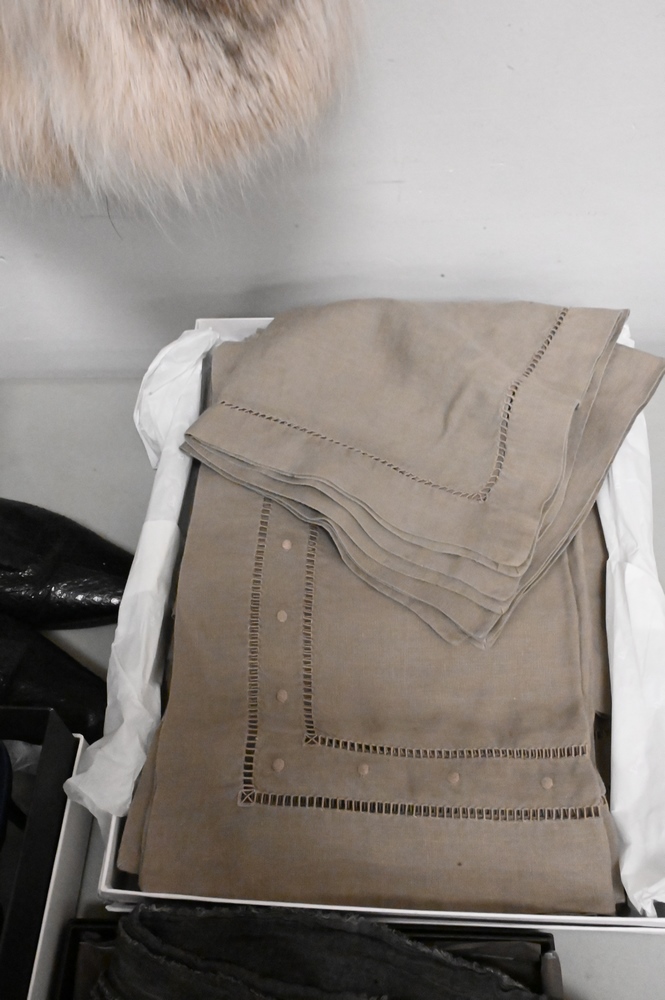Couture Lot, to include a pair of Manolo Blahnik snakeskin boots, size 38; a pair of Nicholas Kirkwood heels, size 38 1/2; Faliero Sarti scarf; a set of Christian Dior table liners; along with Fossil DRT 50 Meter DT-4013 Wristwatch, now having aftermarket sterling Native American adjustable band.
