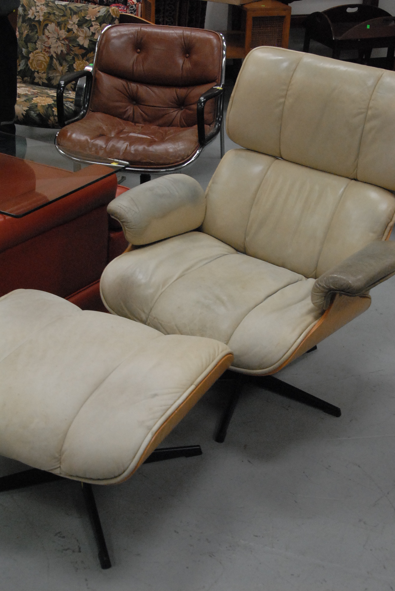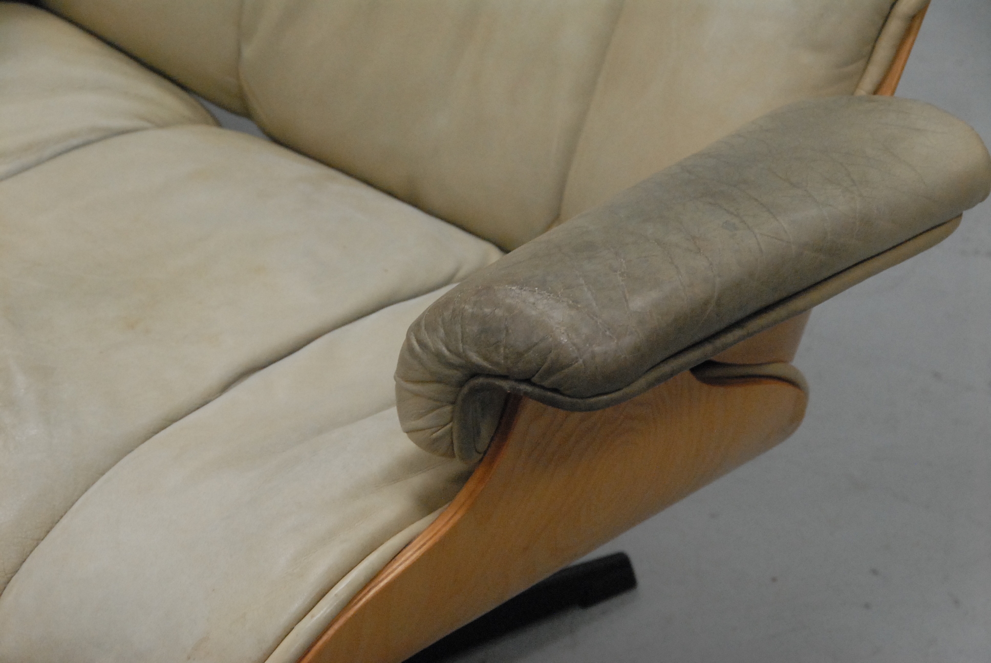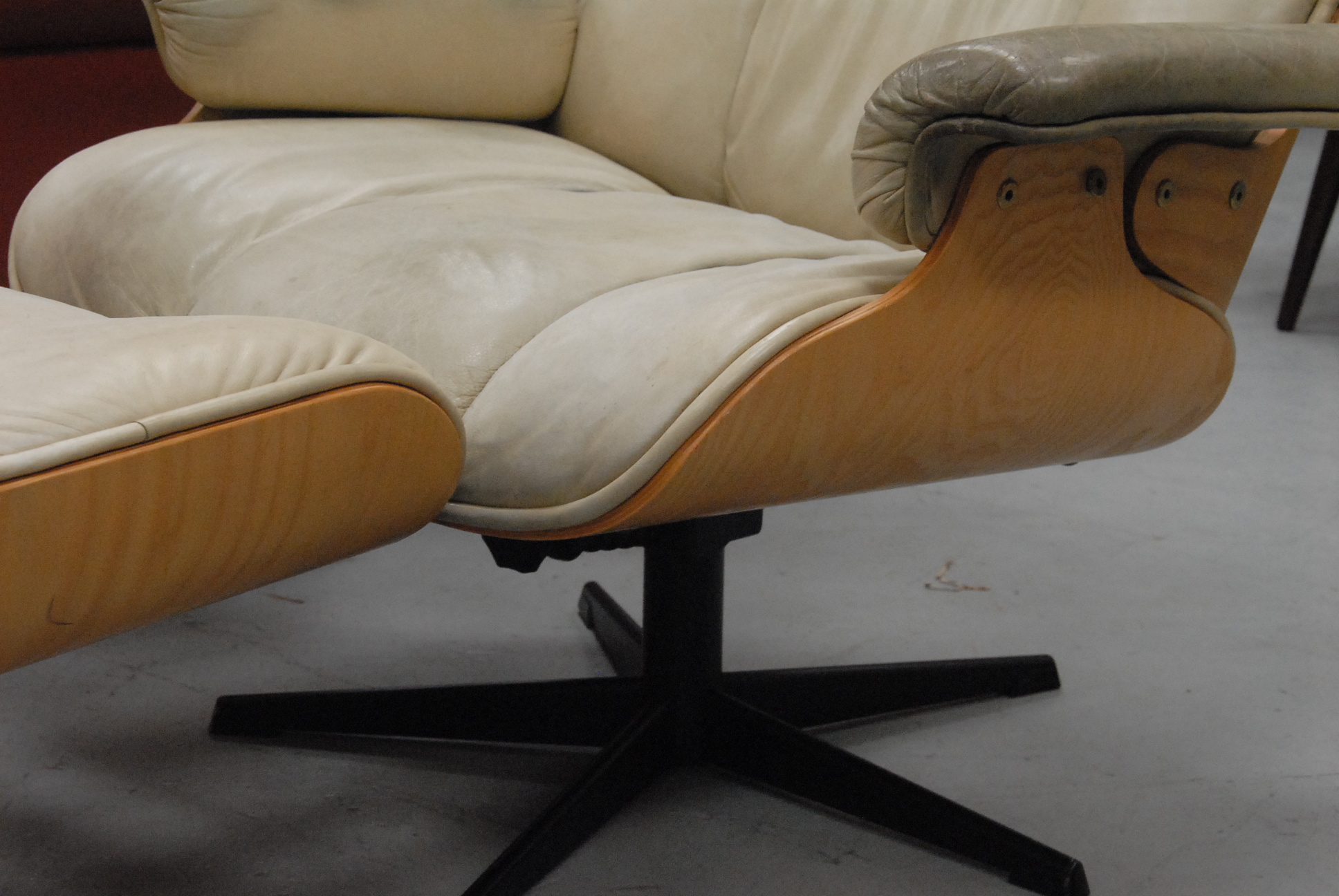 Lot 170: Eames style bent ply lounge chair and matching ottoman of laminated ash and leather circa 1985.