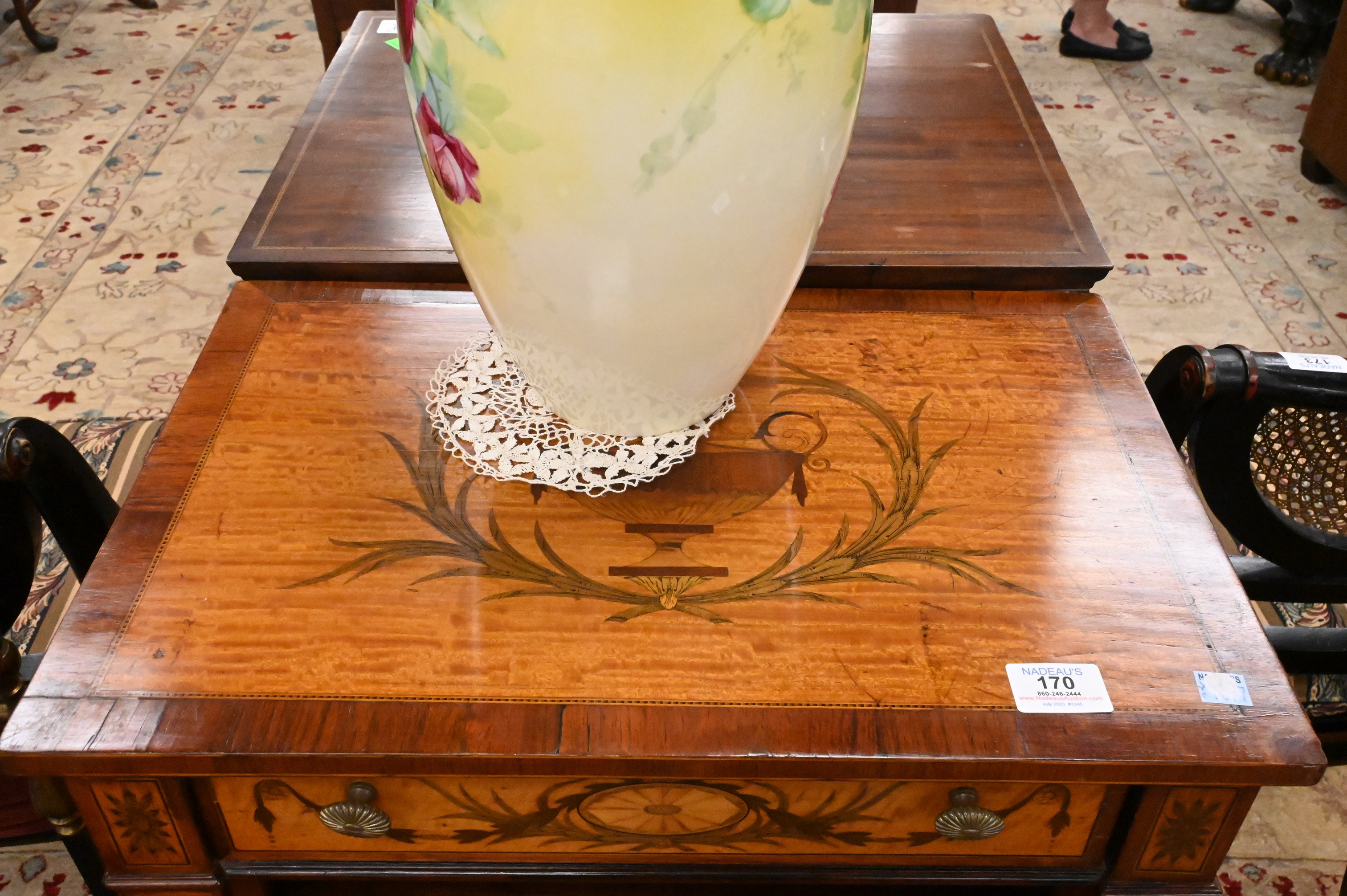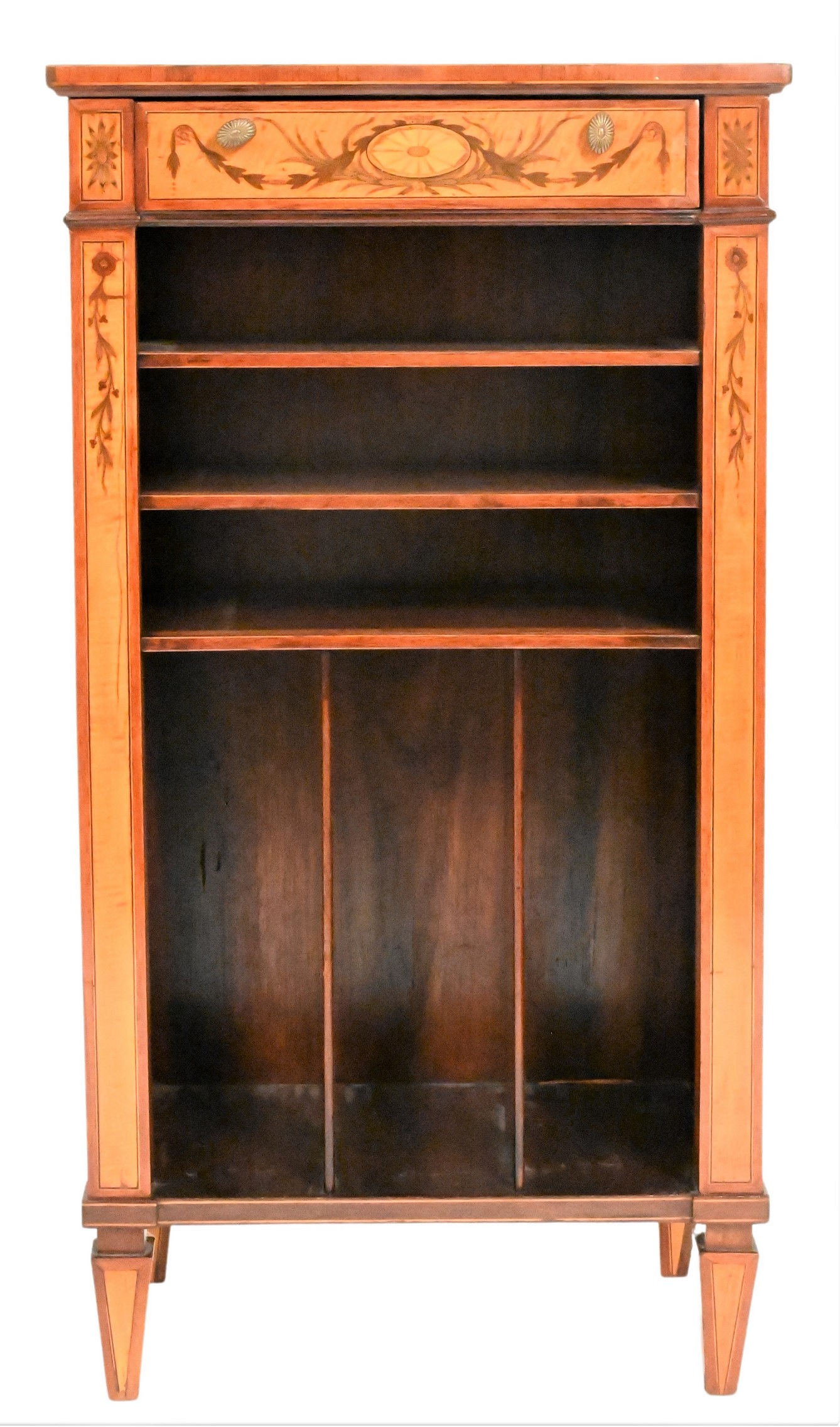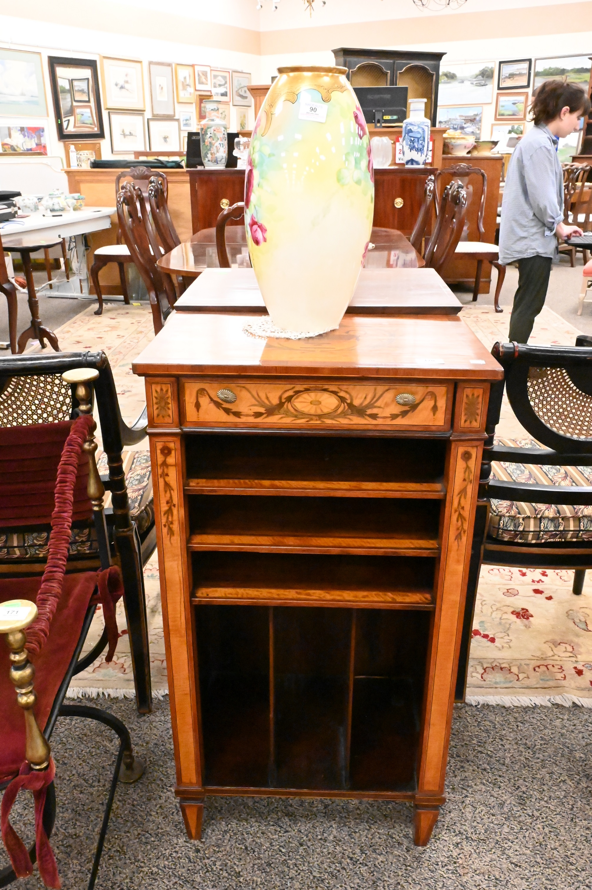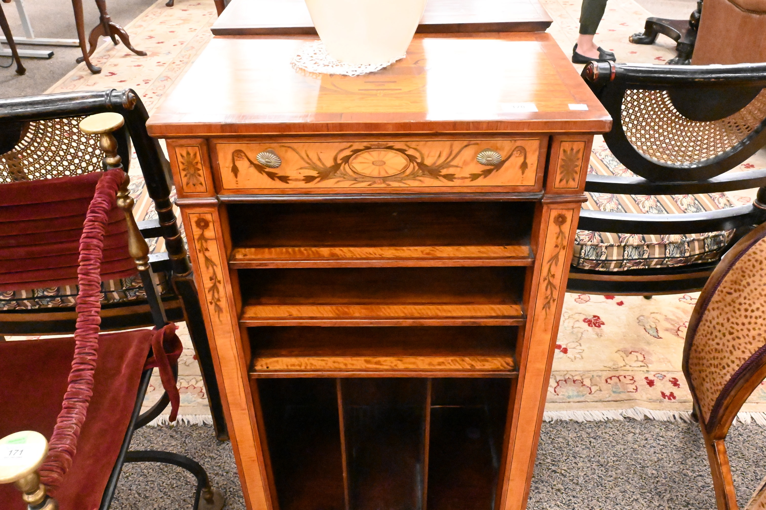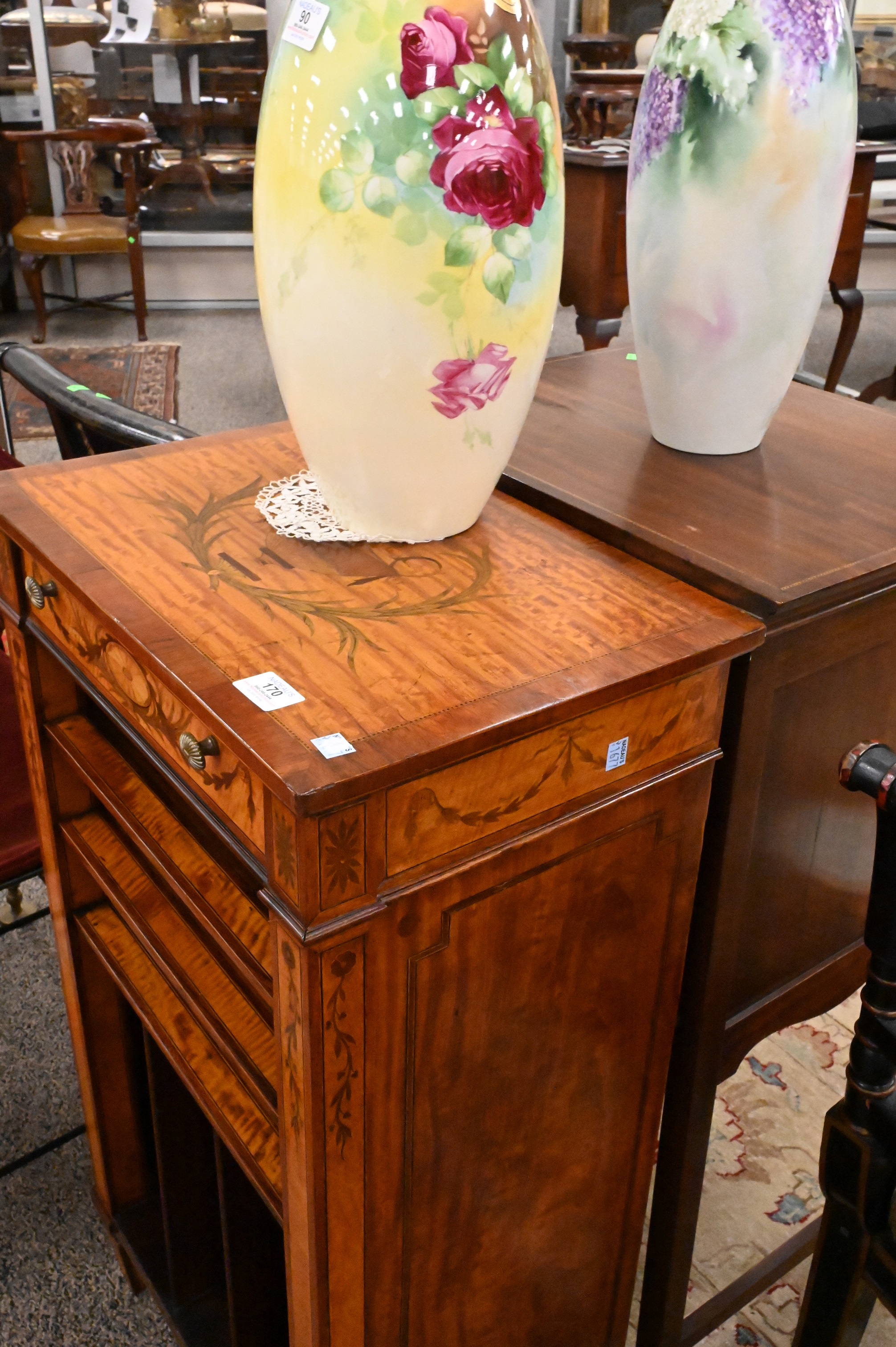 Edwardian Music Cabinet, with drawer and shelves, satinwood inlaid top and fronts, height 37 inches, top 13 1/ 4″ x 20″.