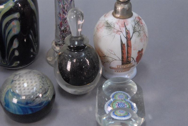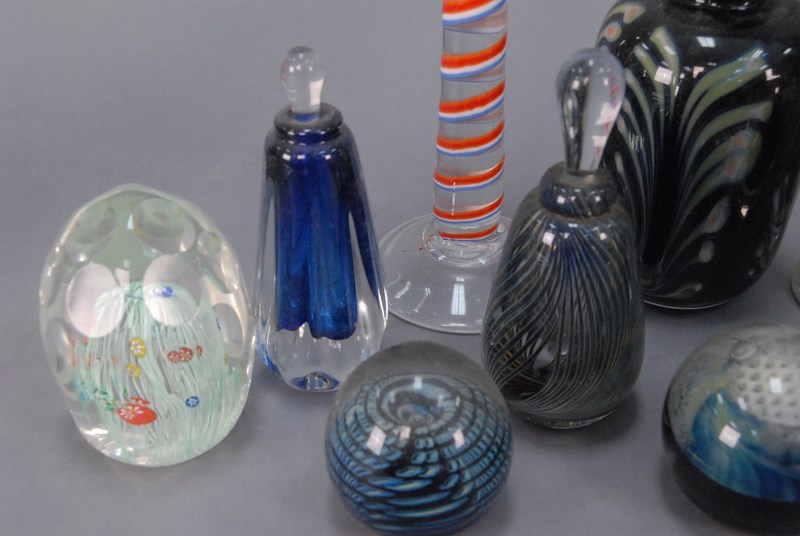 Eleven piece lot to include six Robert Burch art glass pieces, two Murano glass paper weights, two art glass candle sticks, and painted perfume.